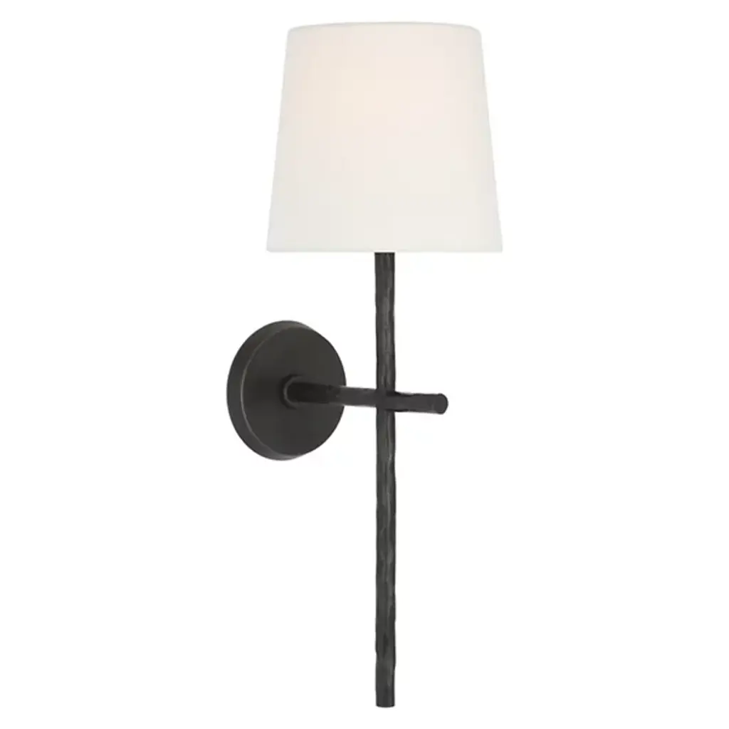 Add a rustic character to your interiors with the Collette Tail Wall Sconce from Visual Comfort Signature. Designed by Suzanne Kasler, this transitional piece features a beveled disc wall plate anchoring a vertical metal stem, artfully crafted with subtle imperfections for a charming, lived-in feel. Topped with a flared fabric shade, it casts a warm, inviting glow around a focused pool of downlight, blending classic design with a refined, artisanal character.