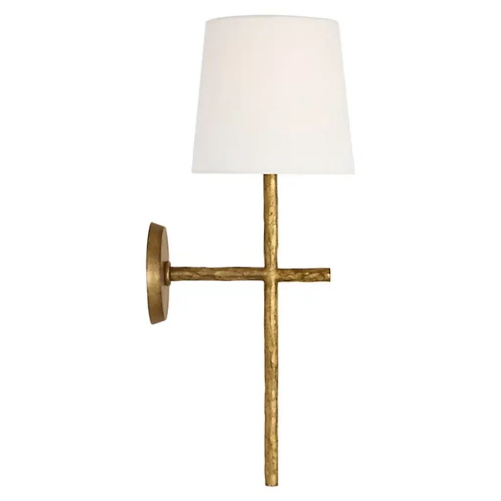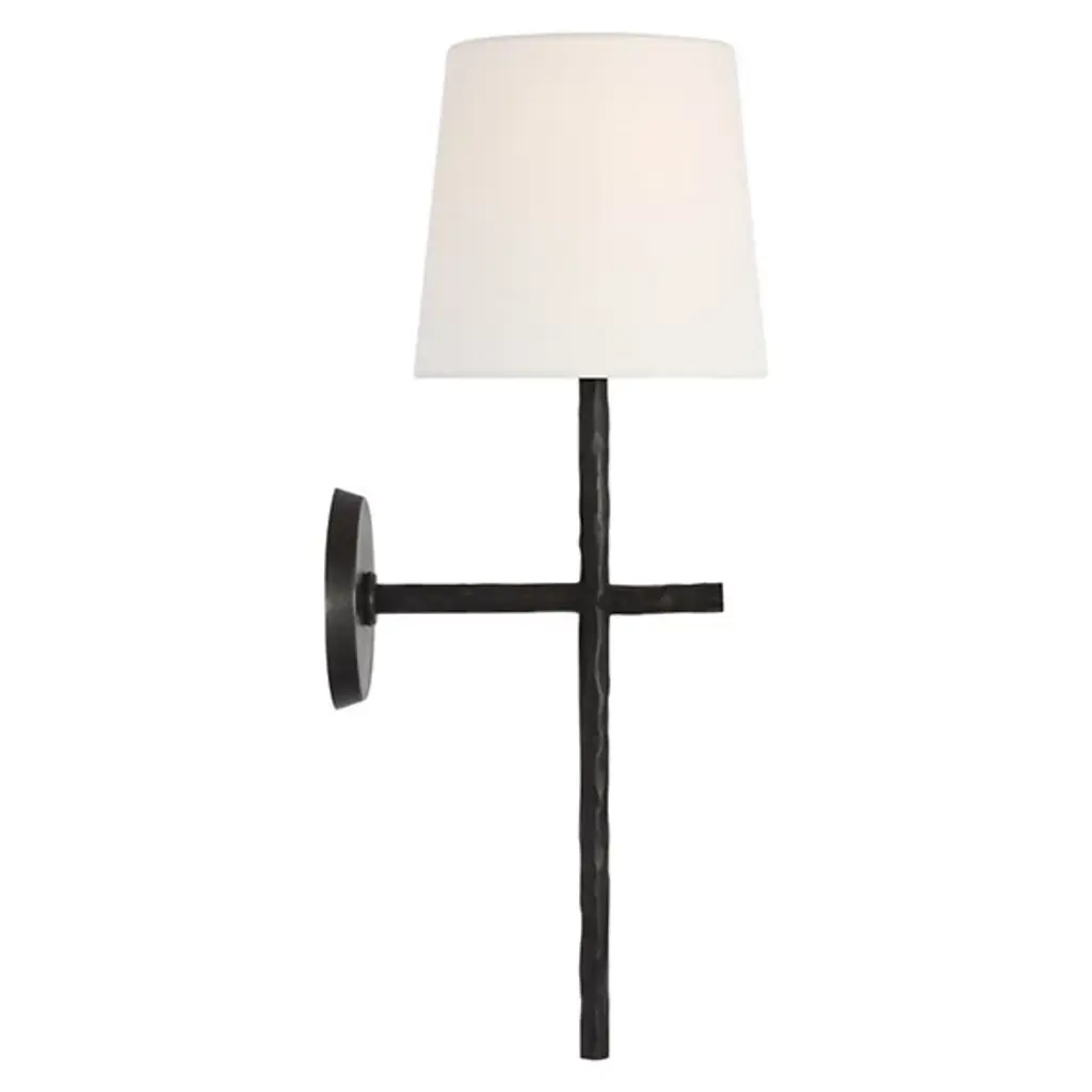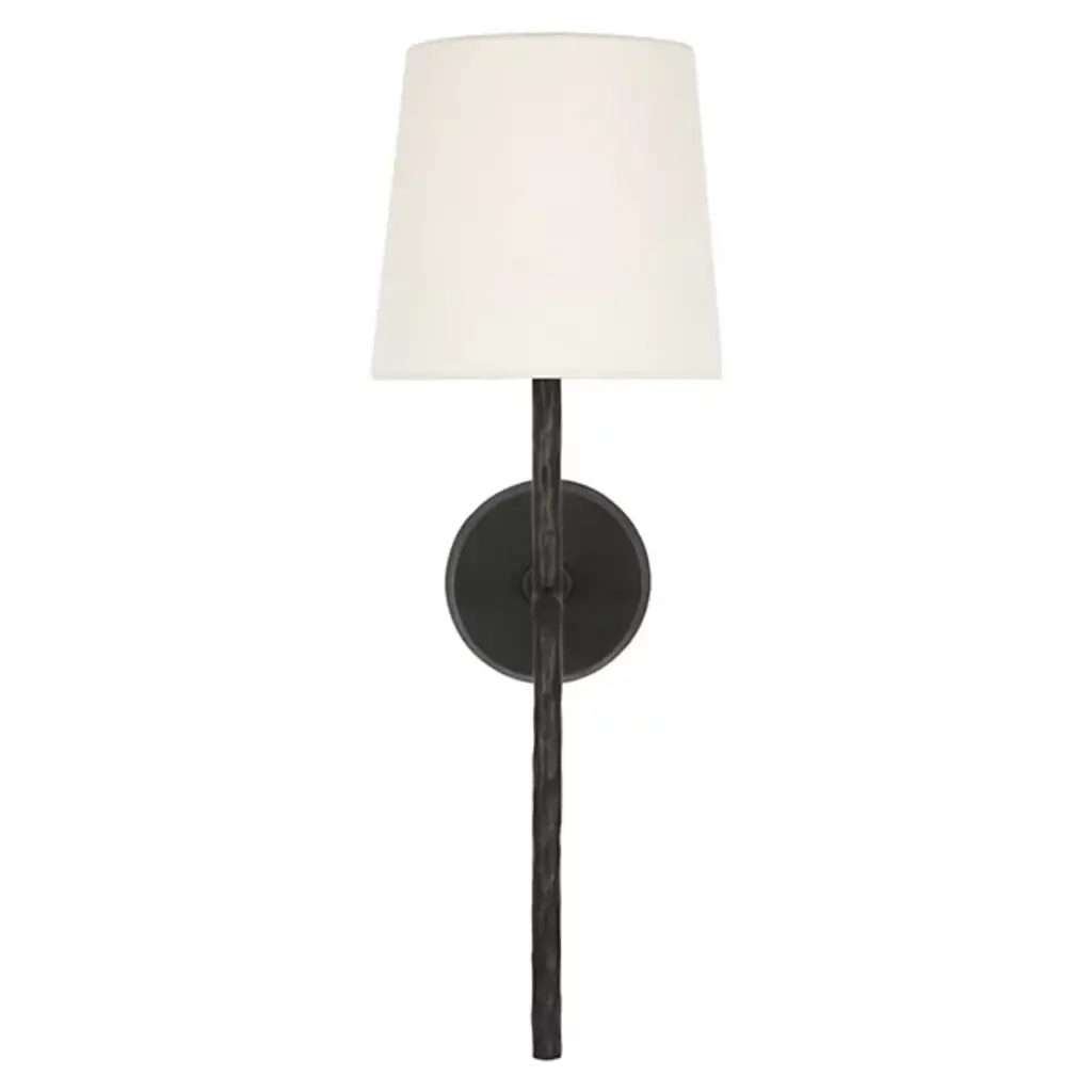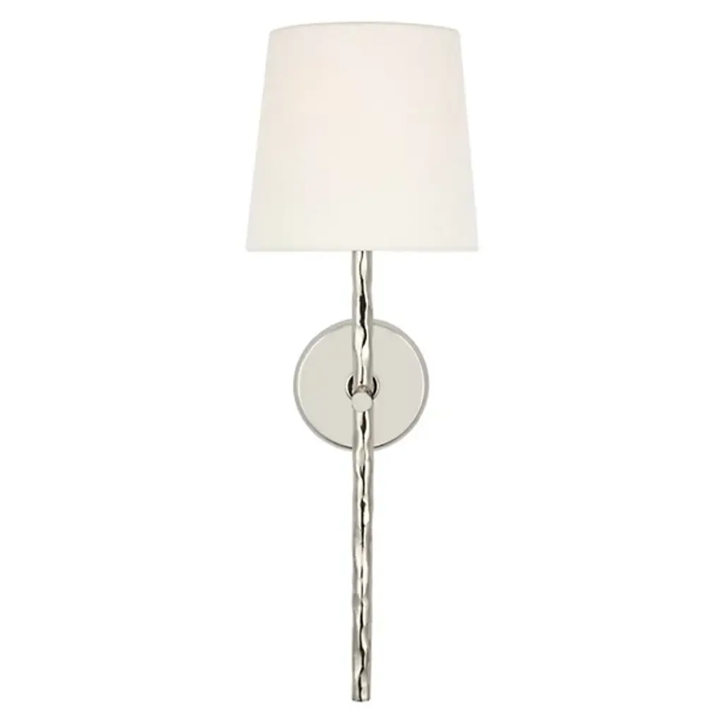 Add a rustic character to your interiors with the Collette Tail Wall Sconce from Visual Comfort Signature. Designed by Suzanne Kasler, this transitional piece features a beveled disc wall plate anchoring a vertical metal stem, artfully crafted with subtle imperfections for a charming, lived-in feel. Topped with a flared fabric shade, it casts a warm, inviting glow around a focused pool of downlight, blending classic design with a refined, artisanal character.
