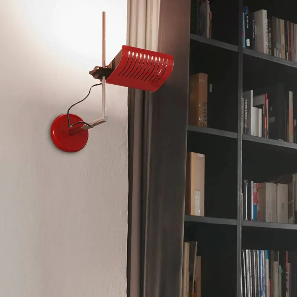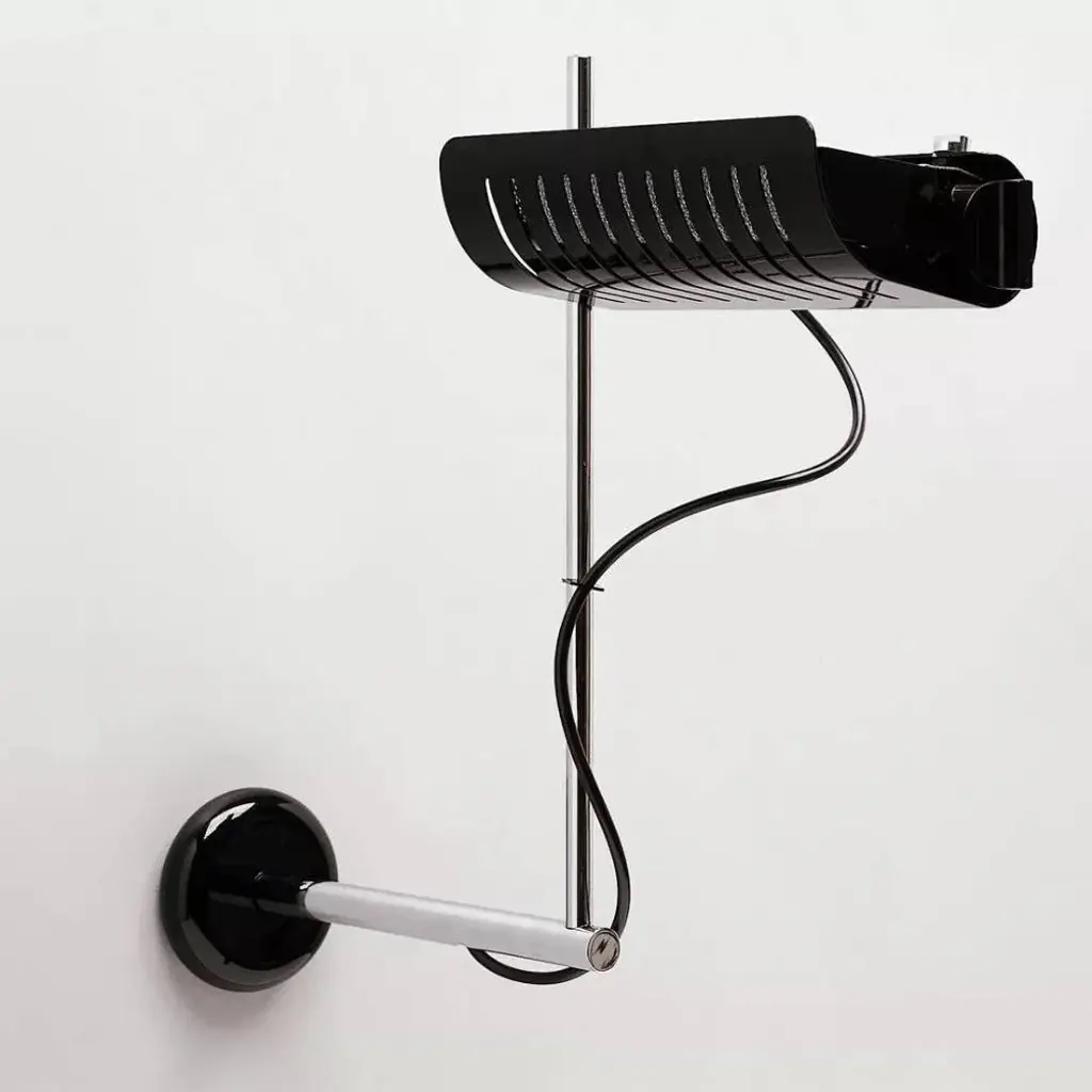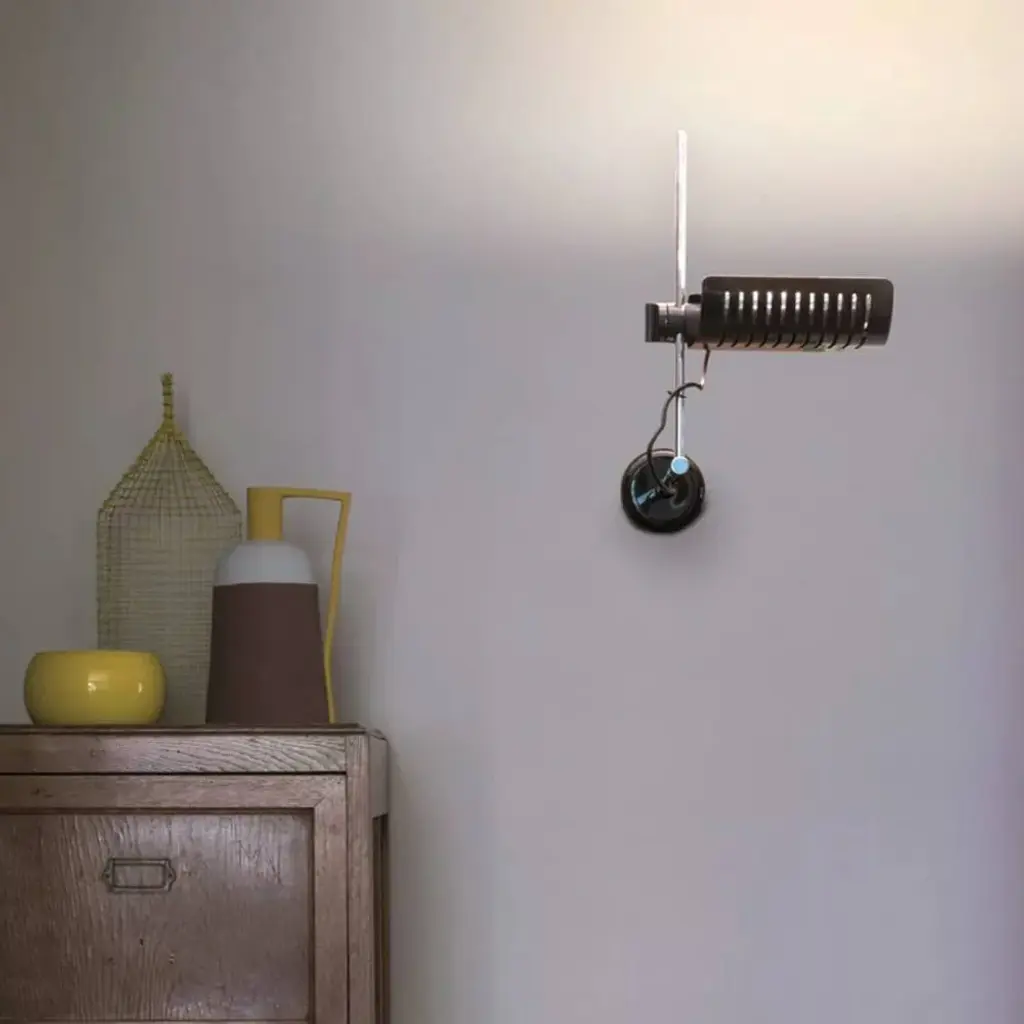 The Colombo Wall/Ceiling Lamp, designed by Joe Colombo in 1970, showcases a sleek, adjustable reflector crafted from lacquered aluminum, allowing for precise control of light direction. The chrome-plated stem and lacquered wall or ceiling mount add to its minimalist aesthetic. Originally among the first domestic lamps to utilize halogen bulbs, the Colombo Wall/Ceiling Lamp has been updated to accommodate modern LED technology, ensuring energy efficiency without compromising its iconic design.