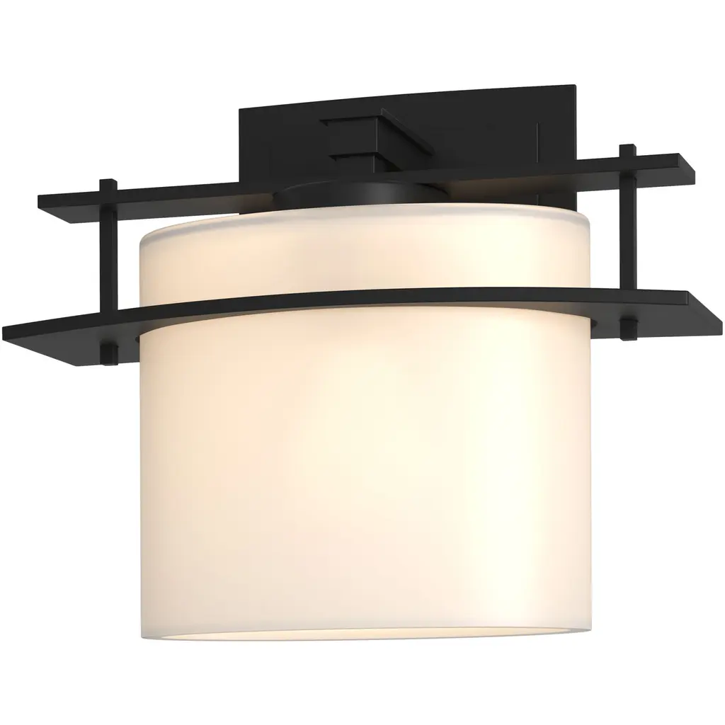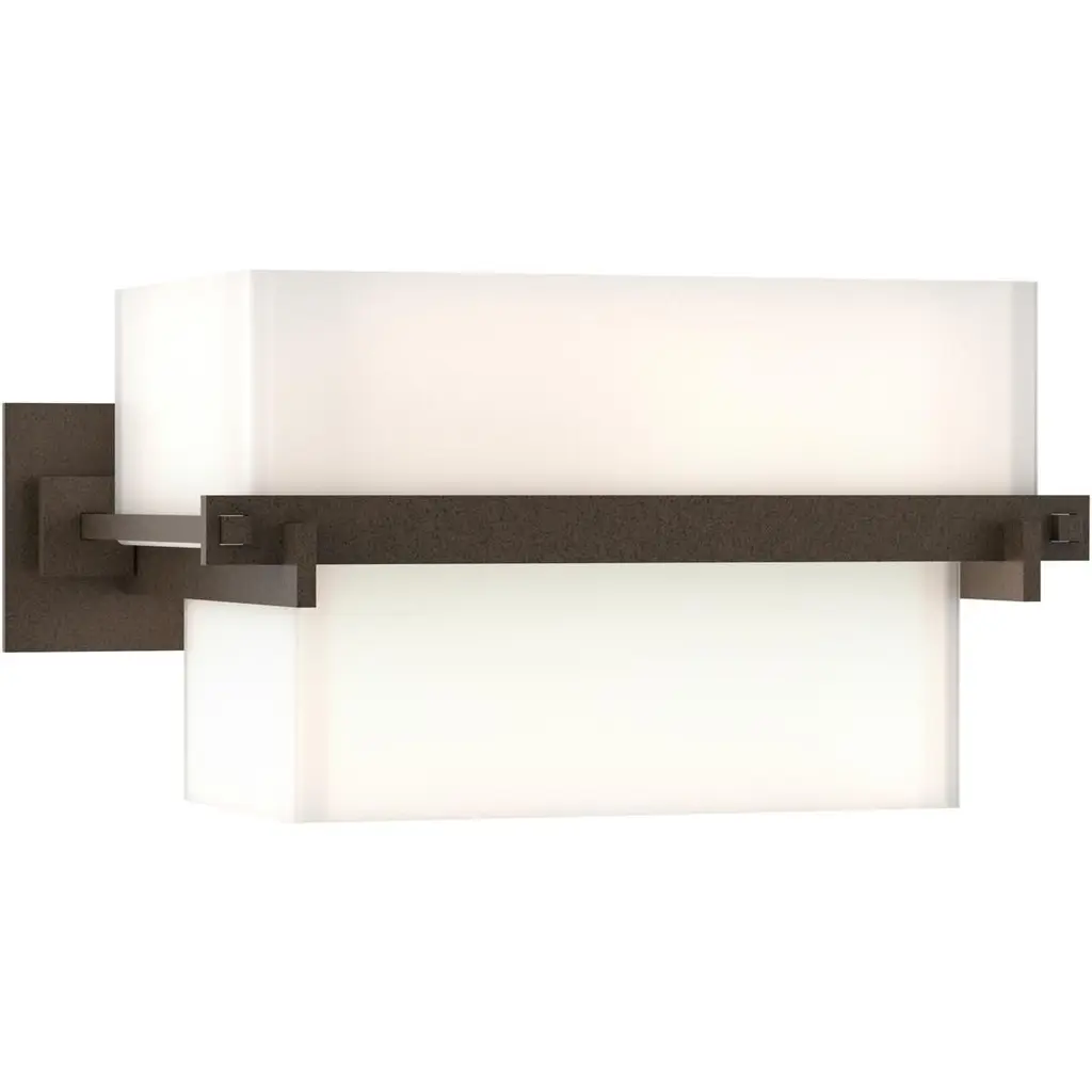 The Minka-Lavery Compositions Wall Sconce 6461-273 combines contemporary lines with rustic materials for a singular statement in modern spaces. It features a cylindrical Etched Opal glass shade held within a sturdy metal frame, which is finished in rich Aged Patina Iron and accented by a textural slab of unfilled travertine on the wall plate.