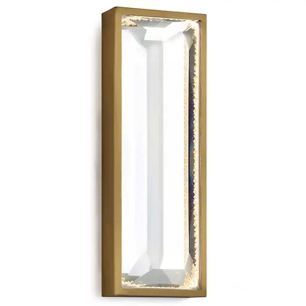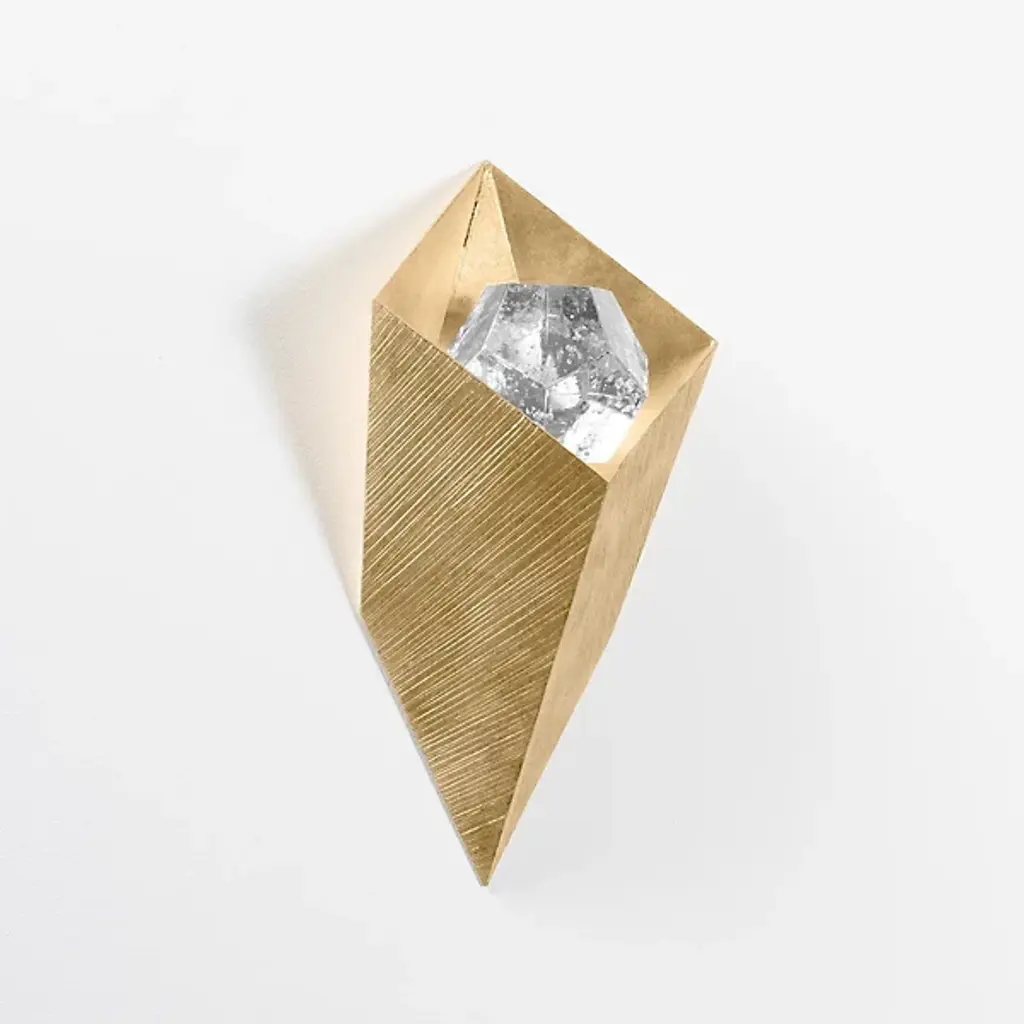 The Conch Wall Sconce from Corbett Lighting is an angular iron construction crafted with a faceted crystal shade. The fixture's single lamp is listed as Damp, creating a striking design that resembles an unexpected treasure akin to a pearl nestled within an oyster shell. Its faceted metal outer shade is adorned with a crystal glass jewel, while an LED light source illuminates the seedy, cast glass gem from below. Enhanced by a warm Vintage Gold Leaf finish, this sconce offers a dazzling lighting experience that seamlessly blends refined style elements to cast a layered ambiance in all directions.