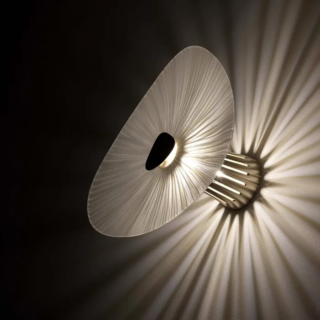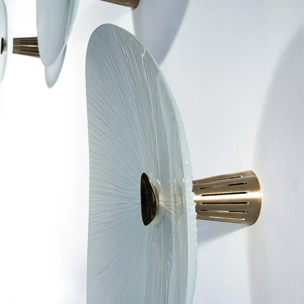 The 'Conchiglia' wall light is a pure expression of refinement, elegance and attention to detail. The crystal element, extra-light and satin white crystal, have been curved and hand-crafted to create fascinating directional beams of light. The support structure is in 24 kt gold plated brass with a satin finish. Every imperfection is to be considered a guarantee of naturalness and craftsmanship. Also available in a bigger and smaller sizes, please contact the Concierge for further information.