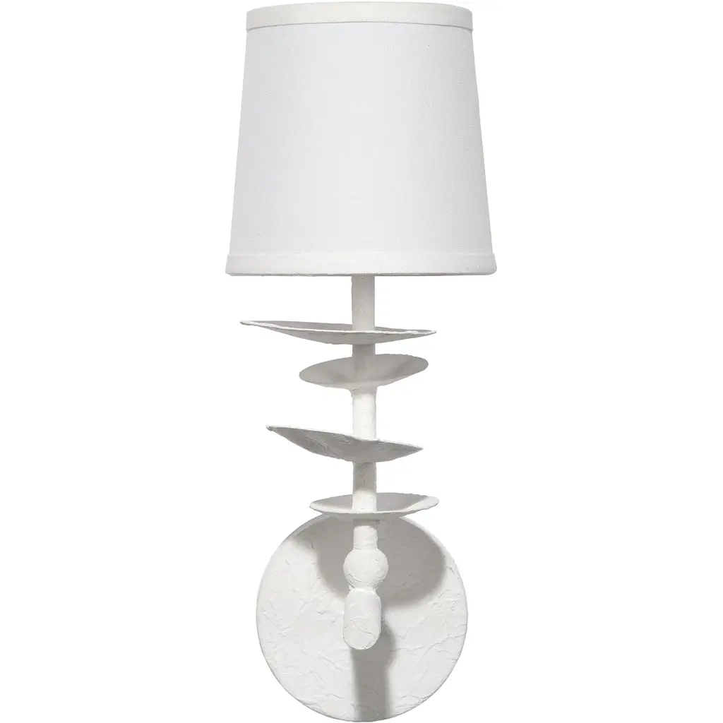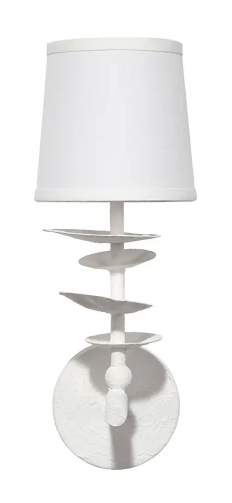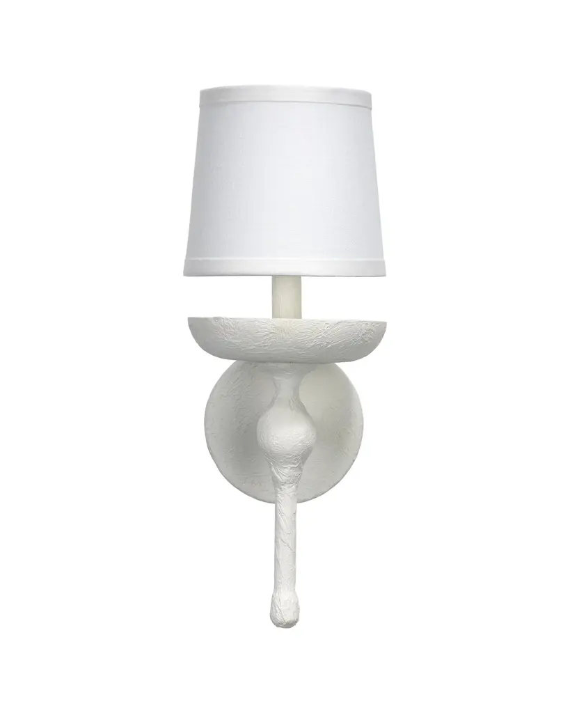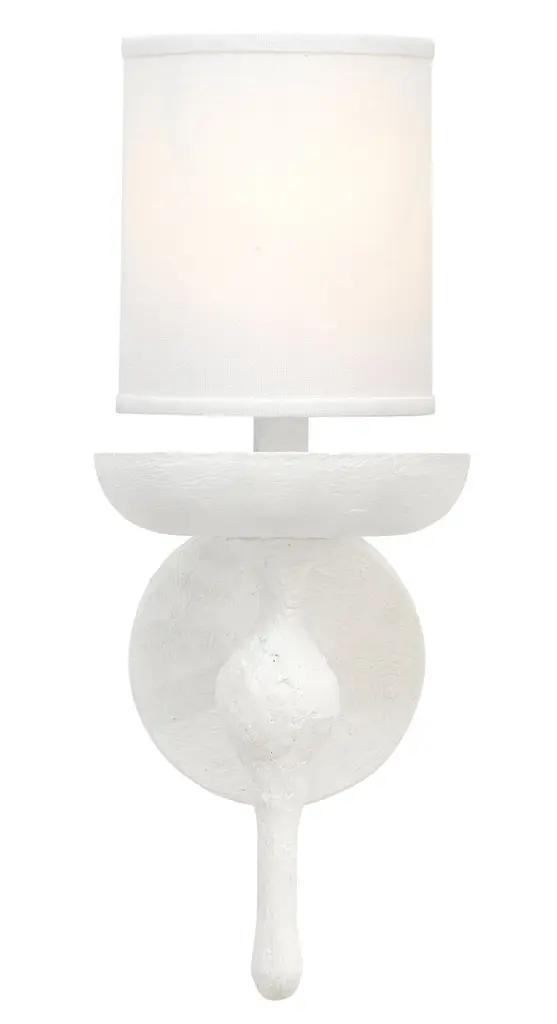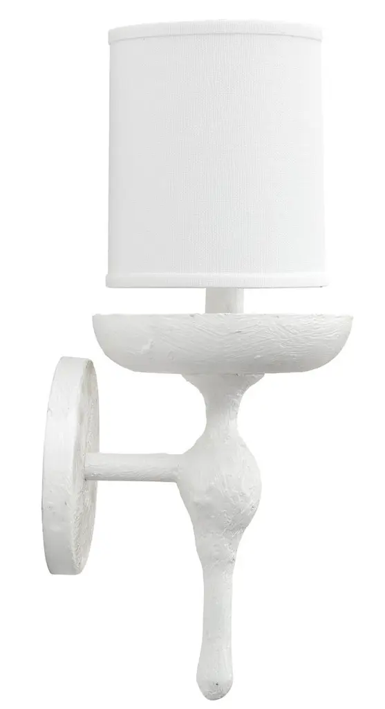 With its hand-forged look, this sconce adds texture and a touch of old-world ambiance to any room. The sculptural silhouette is made of plaster and topped with a linen shade for an approachable aesthetic.