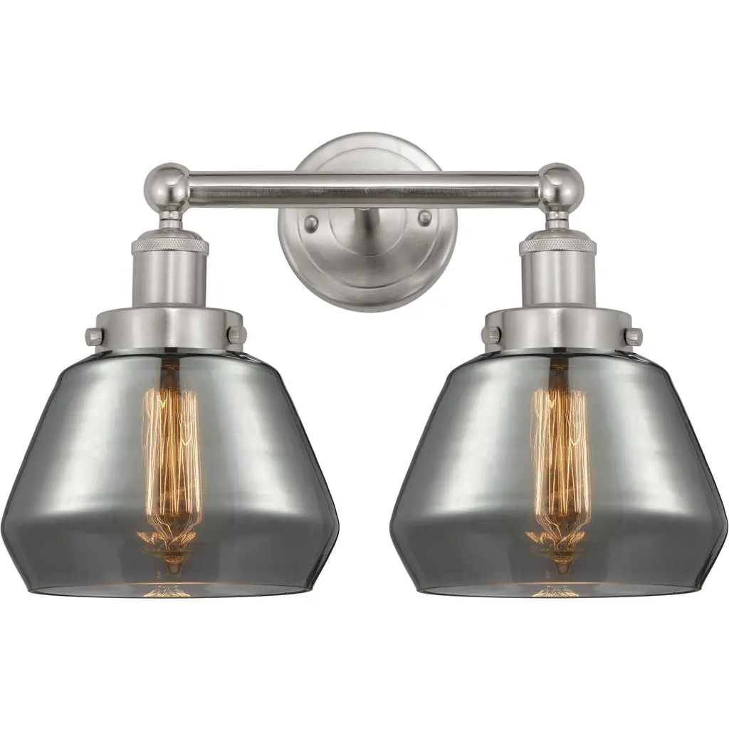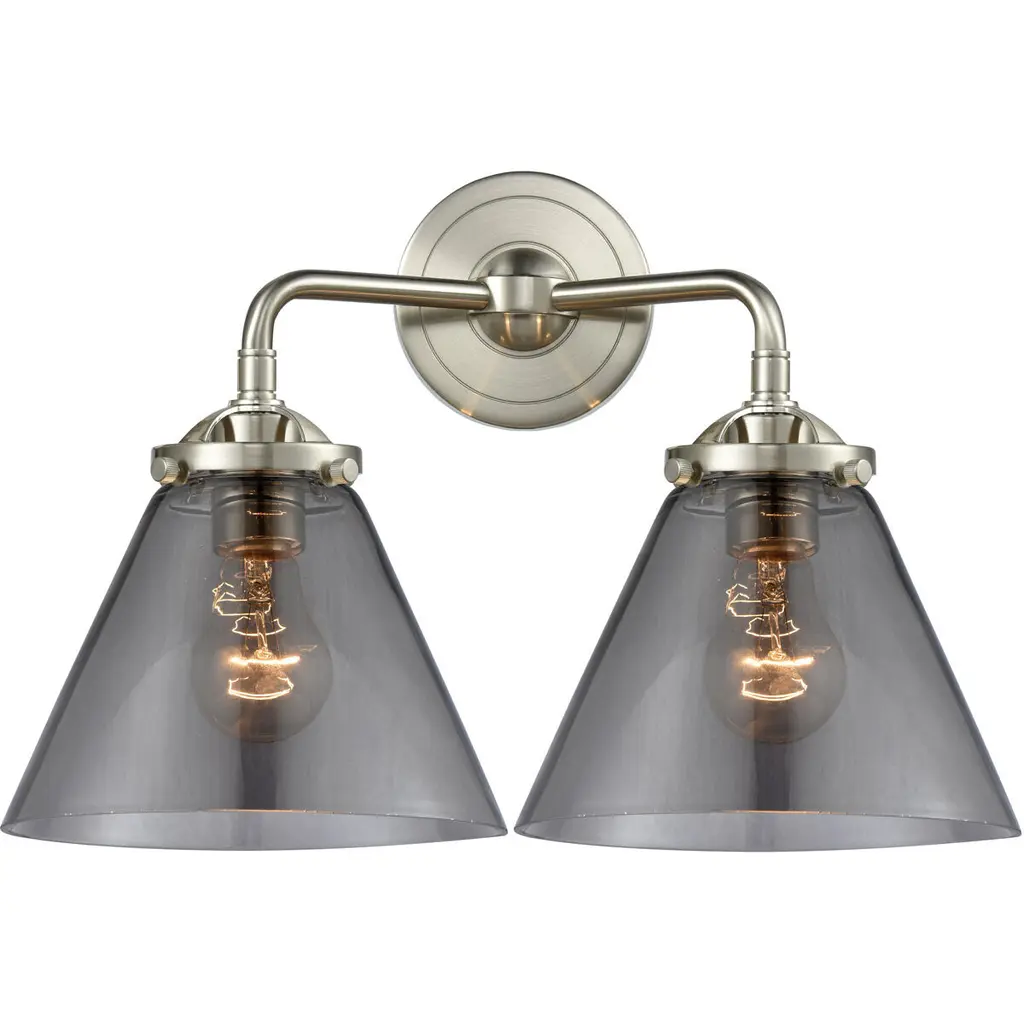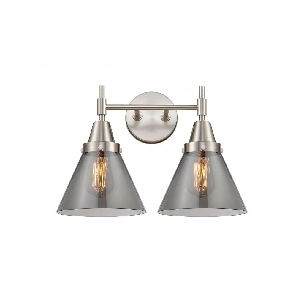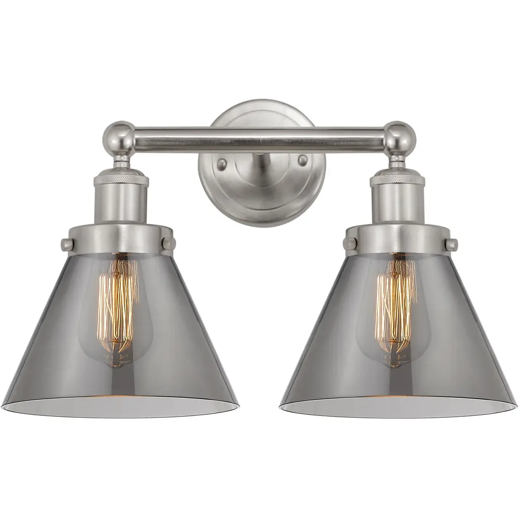 INNOVATIONS 616-2W-SN-G43 Cone 2 Light 15.5 inch Bath Vanity Light Brushed Satin Nickel. Style: Art Nouveau, Industrial, Restoration-Vintage, Transitional . Collection Name: Edison. Metal Finish(Body): Brushed Satin Nickel. Metal Finish(Canopy/Backplate): Brushed Satin Nickel. Material: Steel, Cast Brass, Glass. Dimension(in): 11.25(H) x 16.75(W) x 8.375(Ext). Bulb: (2)60W Medium Base Incandescent(Not Included). Voltage: 120. Dimmable: Yes. Color Temperature (Kelvin): 2200. Color Rendering Index (CRI): 99.9. Lumens: 220. Life Expectancy (Hours): 2000. Glass Shade Description: Plated Smoke Large Cone. Glass Type: Colorful . Shade Shape: Cone. Glass or Metal Shade Color: Plated Smoke. Shade Material: Glass. Shade Dimension(in): 7.75(W) x 6(H). Fitter Measurement (Glass Or Metal Shade Fitter Size): 3.25 inch Fitter. Backplate Dimension(in): 4.5(W) x 0.75(Depth). ADA Compliant: No. California Proposition 65 Warning Required: Yes. UL/ETL Certification Type: Damp Location.
