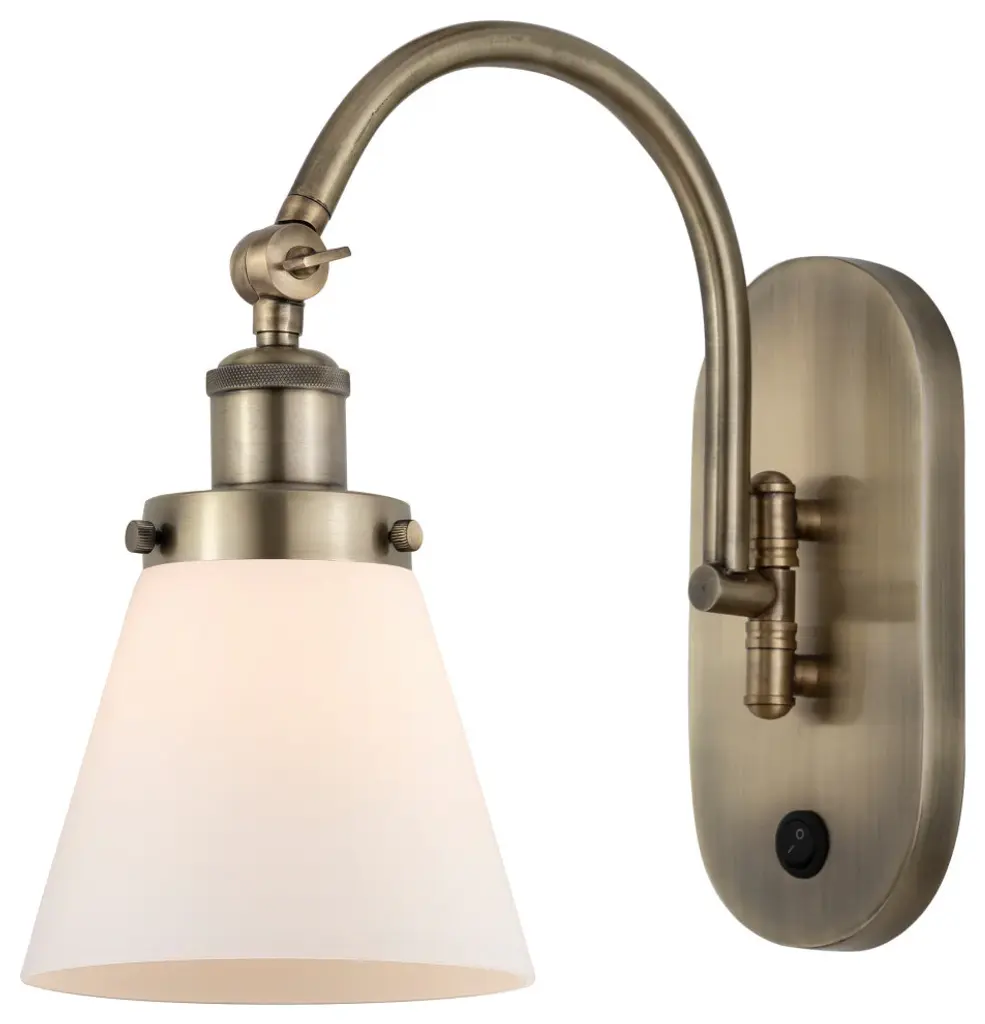 One of our largest and original collections, the Franklin Restoration is made up of a vast selection of heavy metal finishes and a large array of metal and glass shades that bring a touch of industrial into your home.Features:Solid brass 180 degree adjustable swivels with internal teeth that lock in at 5 degree intervalsFixture can be hung with bulbs facing up or down as a wall mount or facing down as a ceiling mount7.875" x 4.5" 2mm heavy cast backplateDistance from outlet opening to top of fixture 7.06 inchesRated for 100 watt maximumUL/CUL Damp RatedCompatible with Incandescent, LED, Fluorescent and Halogen bulbsThe arm swivels side to side at the baseNumber of Bulbs: 1Bulb Wattage: 3.5Bulb Type: LEDBulb Included: IncludedVoltage: 120Finish: Brushed Brass Finish Shade Finish: Matte White Shade.