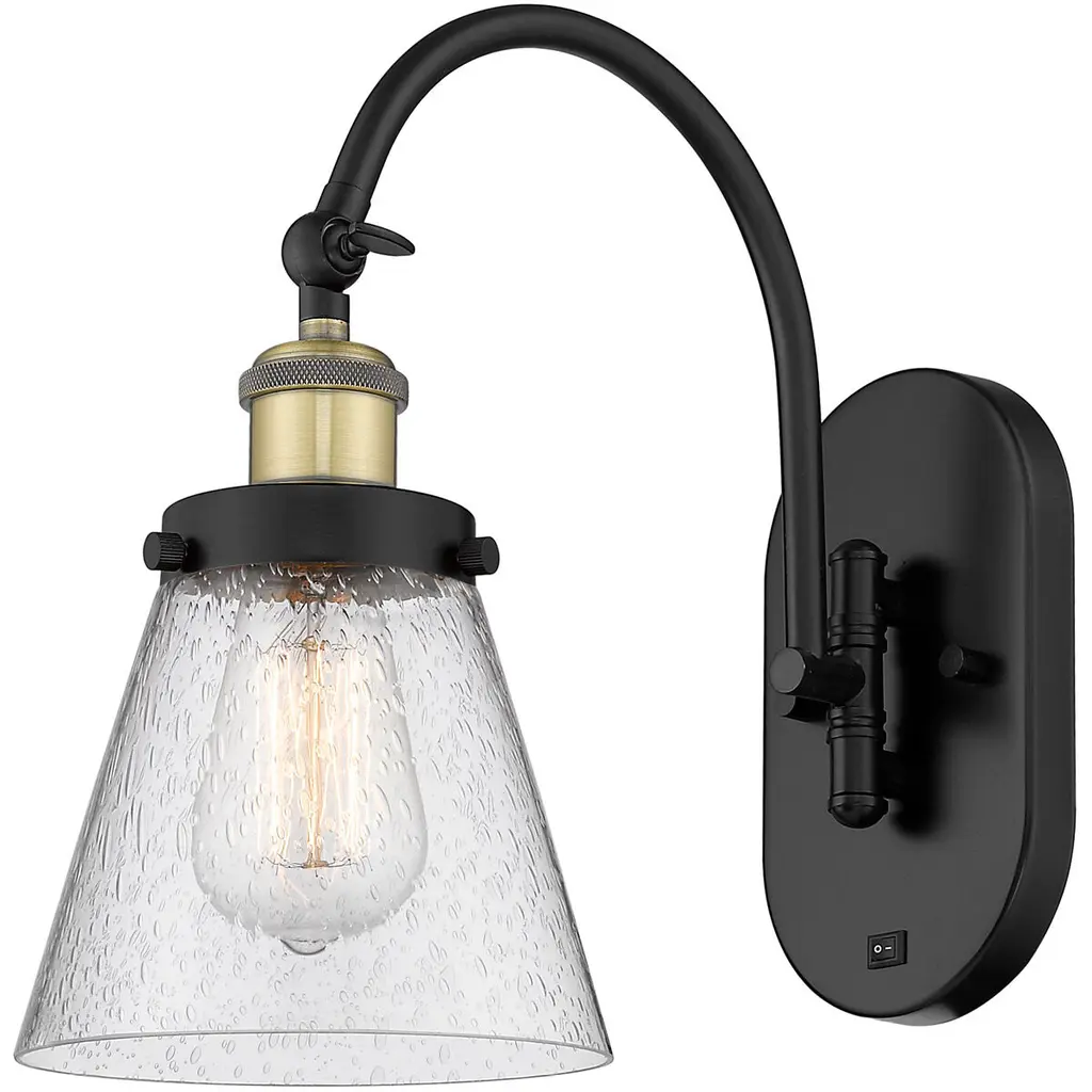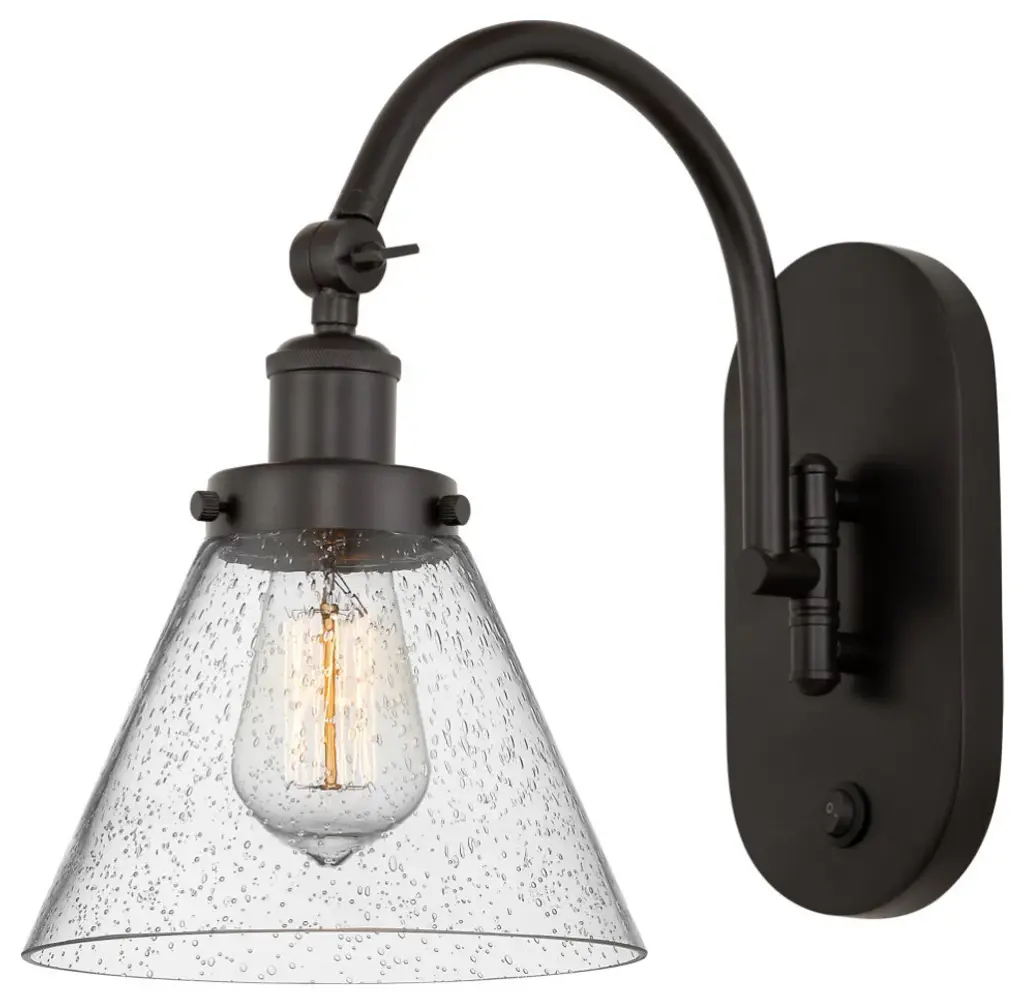 One of our largest and original collections, the Franklin Restoration is made up of a vast selection of heavy metal finishes and a large array of metal and glass shades that bring a touch of industrial into your home.Features:Solid brass 180 degree adjustable swivels with internal teeth that lock in at 5 degree intervalsFixture can be hung with bulbs facing up or down as a wall mount or facing down as a ceiling mount7.875" x 4.5" 2mm heavy cast backplateDistance from outlet opening to top of fixture 7.06 inchesRated for 100 watt maximumUL/CUL Damp RatedCompatible with Incandescent, LED, Fluorescent and Halogen bulbsThe arm swivels side to side at the baseNumber of Bulbs: 1Bulb Wattage: 60Bulb Type: IncandescentBulb Included: Not IncludedVoltage: 120Finish: Matte Black Finish Shade Finish: Seedy Shade