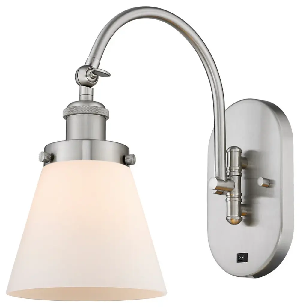 One of our largest and original collections, the Franklin Restoration is made up of a vast selection of heavy metal finishes and a large array of metal and glass shades that bring a touch of industrial into your home.Features:Solid brass 180 degree adjustable swivels with internal teeth that lock in at 5 degree intervalsFixture can be hung with bulbs facing up or down as a wall mount or facing down as a ceiling mount7.875" x 4.5" 2mm heavy cast backplateDistance from outlet opening to top of fixture 7.06 inchesRated for 100 watt maximumUL/CUL Damp RatedCompatible with Incandescent, LED, Fluorescent and Halogen bulbsThe arm swivels side to side at the baseNumber of Bulbs: 1Bulb Wattage: 3.5Bulb Type: LEDBulb Included: IncludedVoltage: 120Finish: Polished Chrome Finish Shade Finish: Matte White Shade