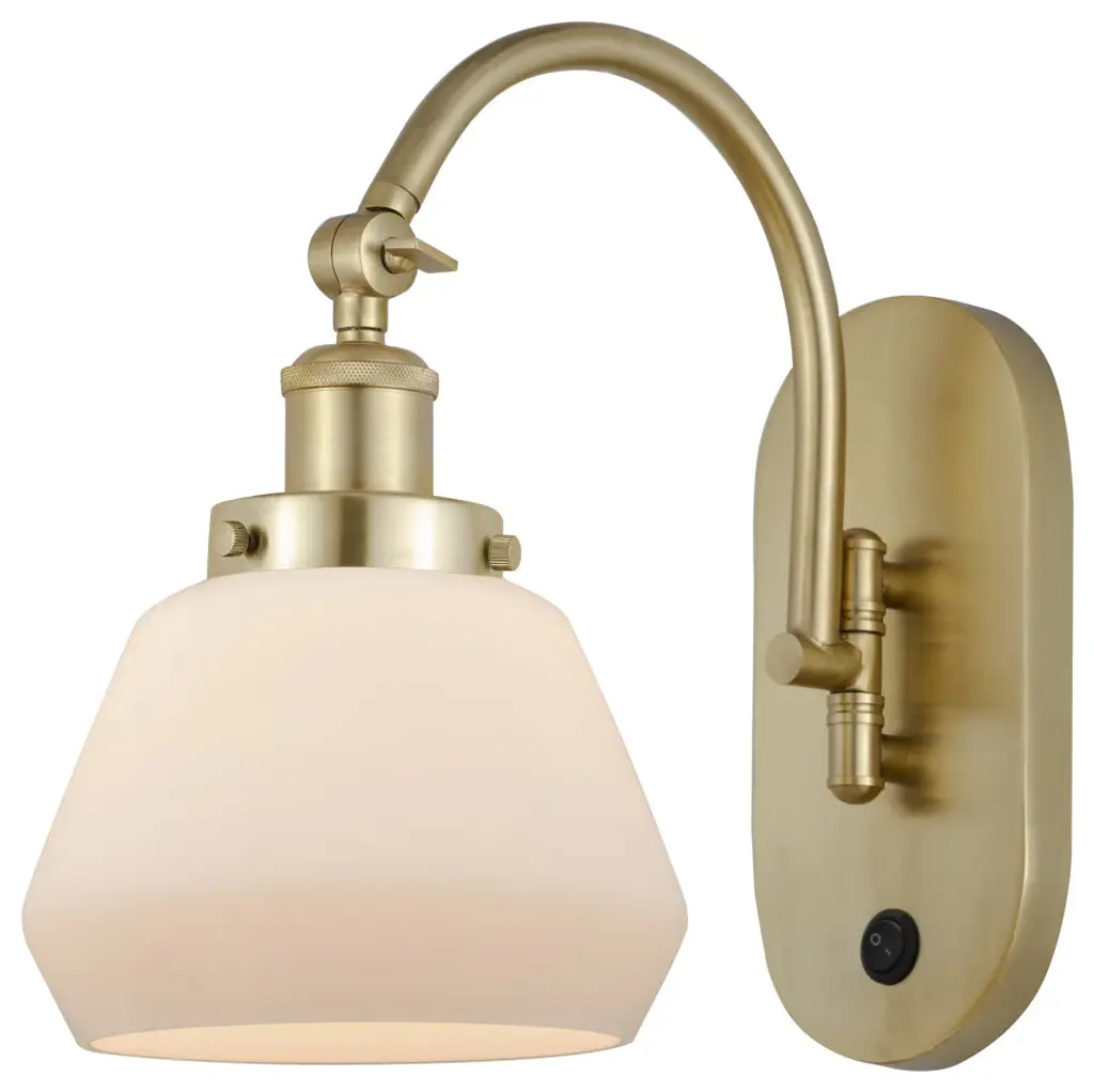 One of our largest and original collections, the Franklin Restoration is made up of a vast selection of heavy metal finishes and a large array of metal and glass shades that bring a touch of industrial into your home.Features:Solid brass 180 degree adjustable swivels with internal teeth that lock in at 5 degree intervalsFixture can be hung with bulbs facing up or down as a wall mount or facing down as a ceiling mount7.875" x 4.5" 2mm heavy cast backplateDistance from outlet opening to top of fixture 7.06 inchesRated for 100 watt maximumUL/CUL Damp RatedCompatible with Incandescent, LED, Fluorescent and Halogen bulbsThe arm swivels side to side at the baseNumber of Bulbs: 1Bulb Wattage: 3.5Bulb Type: LEDBulb Included: IncludedVoltage: 120Finish: Satin Gold Finish Shade Finish: Matte White Shade