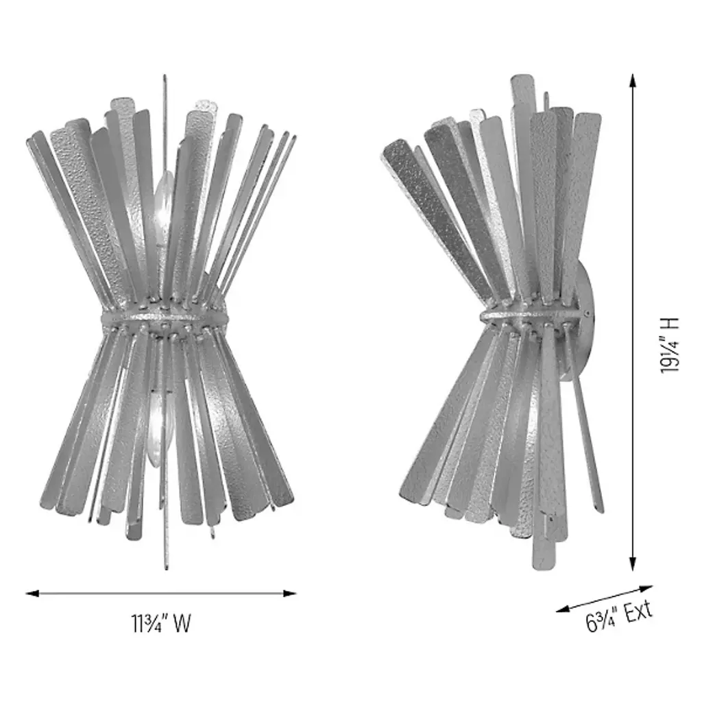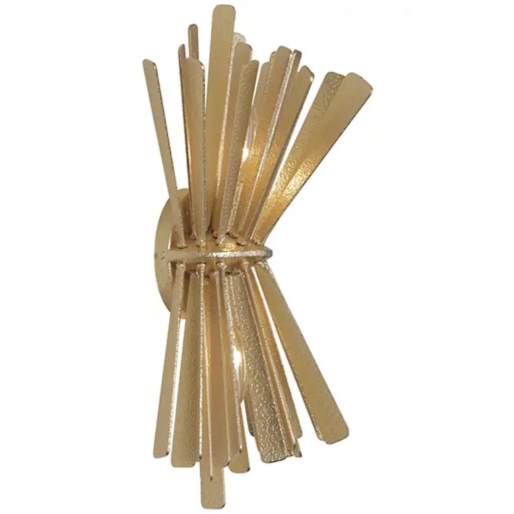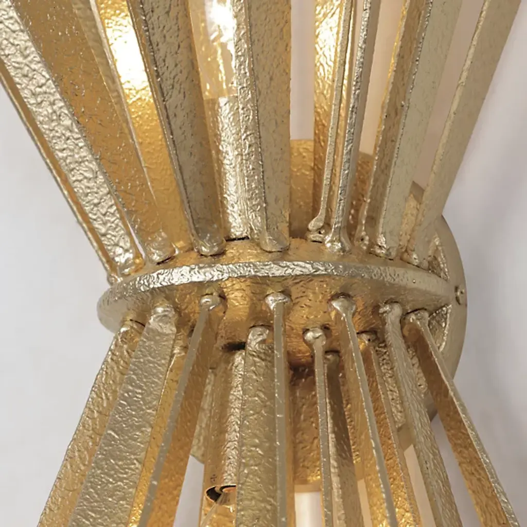 The Confluence Wall Sconce from Metro Lighting bundles metal rays into a dynamic hourglass formation. The central cinch point creates opposing arrays of linear elements that spread outward with calculated precision. Each metal segment directs light in multiple directions, multiplying the sconce's presence. The design draws from scientific principles of force and momentum, expressing them through carefully arranged metalwork. This sconce turns physics into illumination, with rays that seem to simultaneously contract and expand from its middle point.