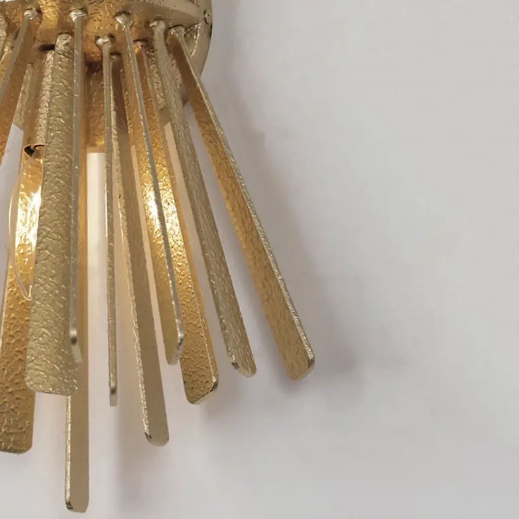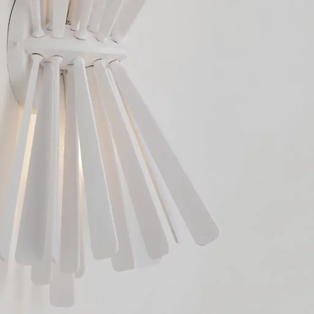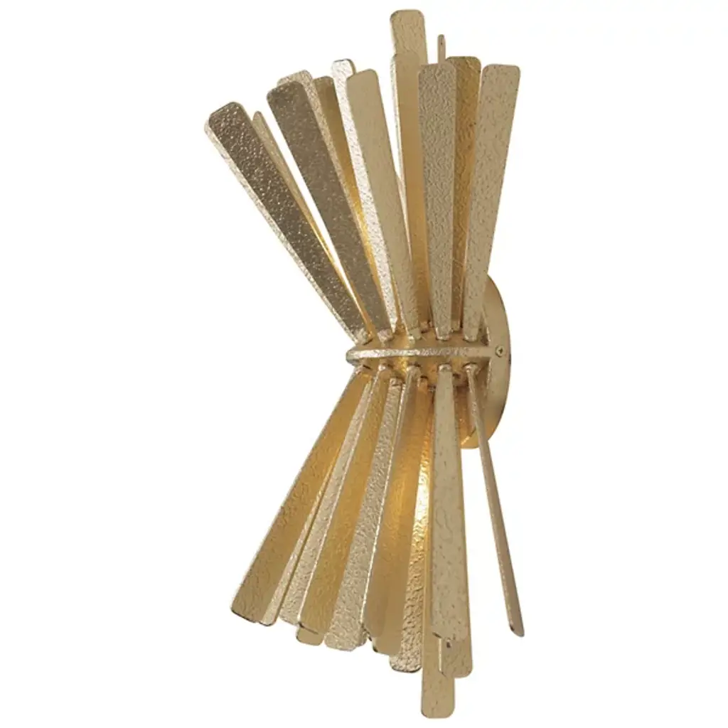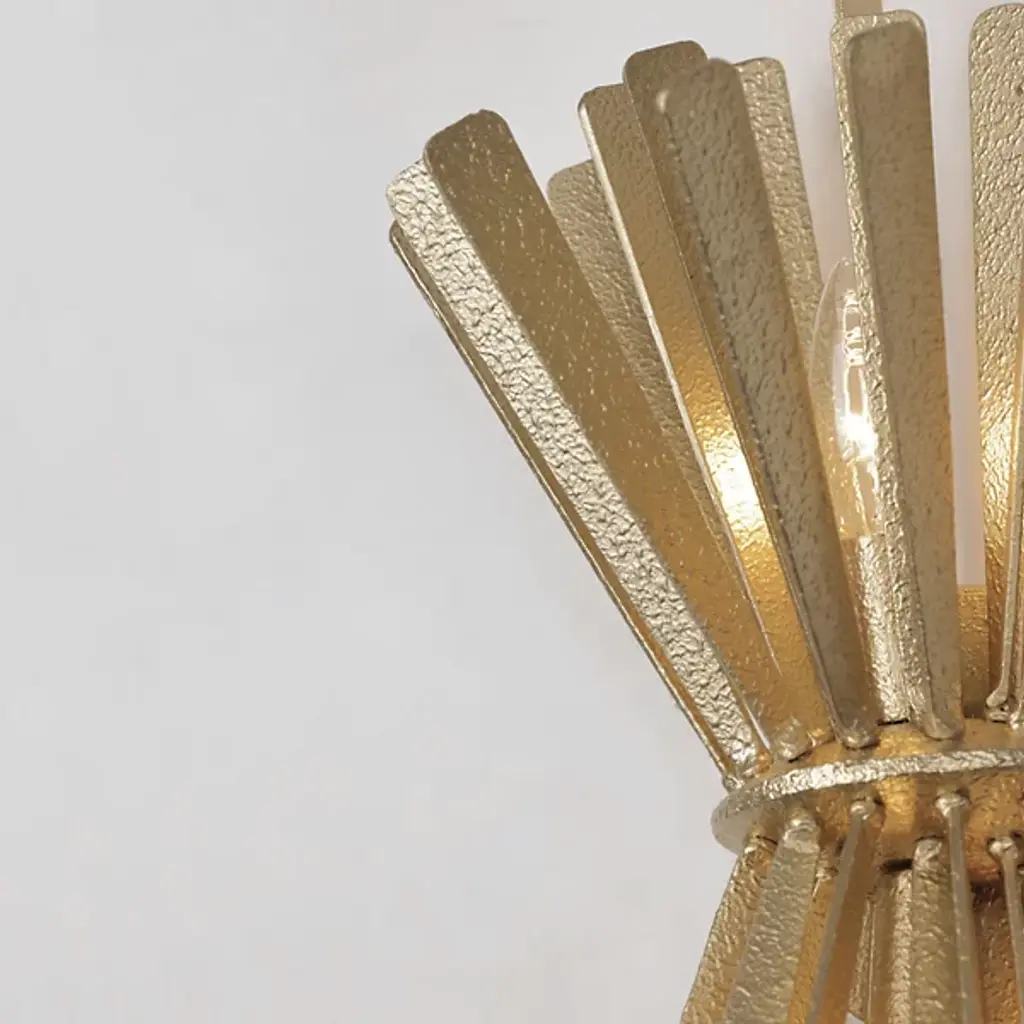 The Confluence Wall Sconce from Metro Lighting bundles metal rays into a dynamic hourglass formation. The central cinch point creates opposing arrays of linear elements that spread outward with calculated precision. Each metal segment directs light in multiple directions, multiplying the sconce's presence. The design draws from scientific principles of force and momentum, expressing them through carefully arranged metalwork. This sconce turns physics into illumination, with rays that seem to simultaneously contract and expand from its middle point.