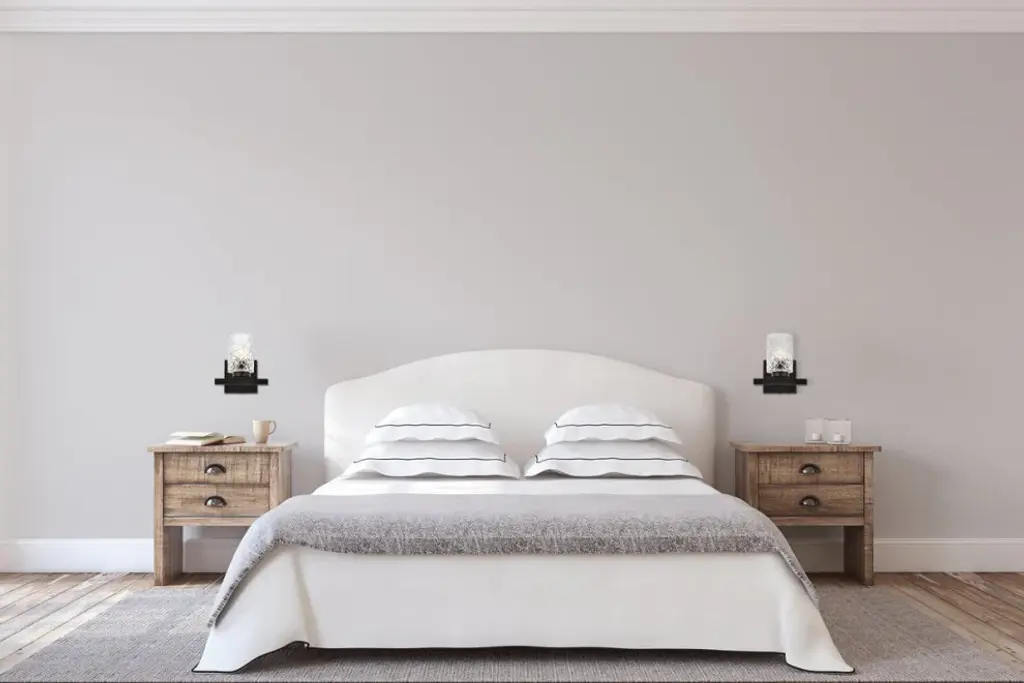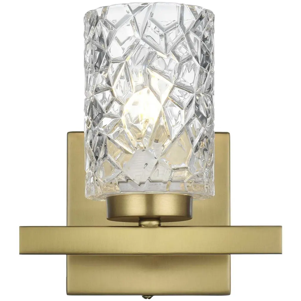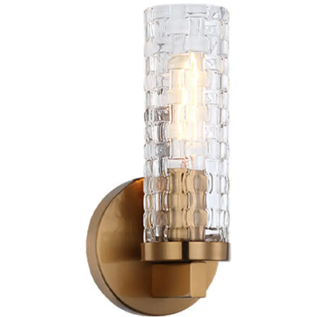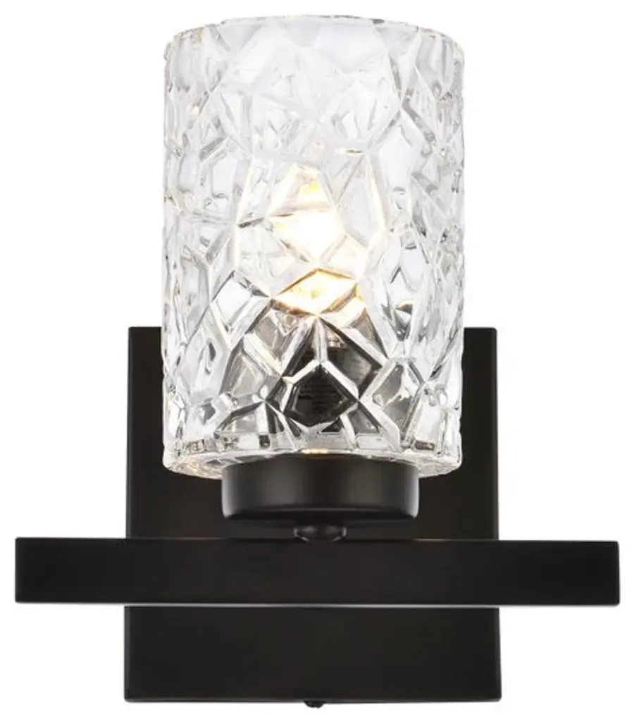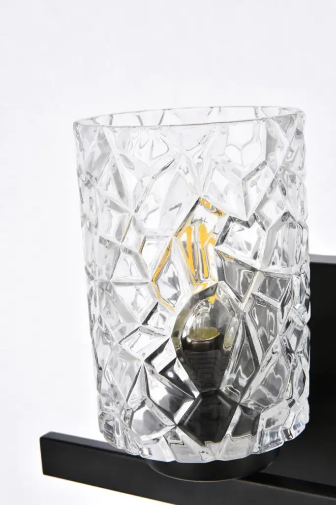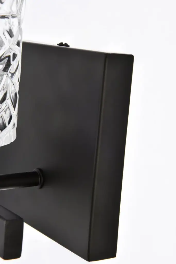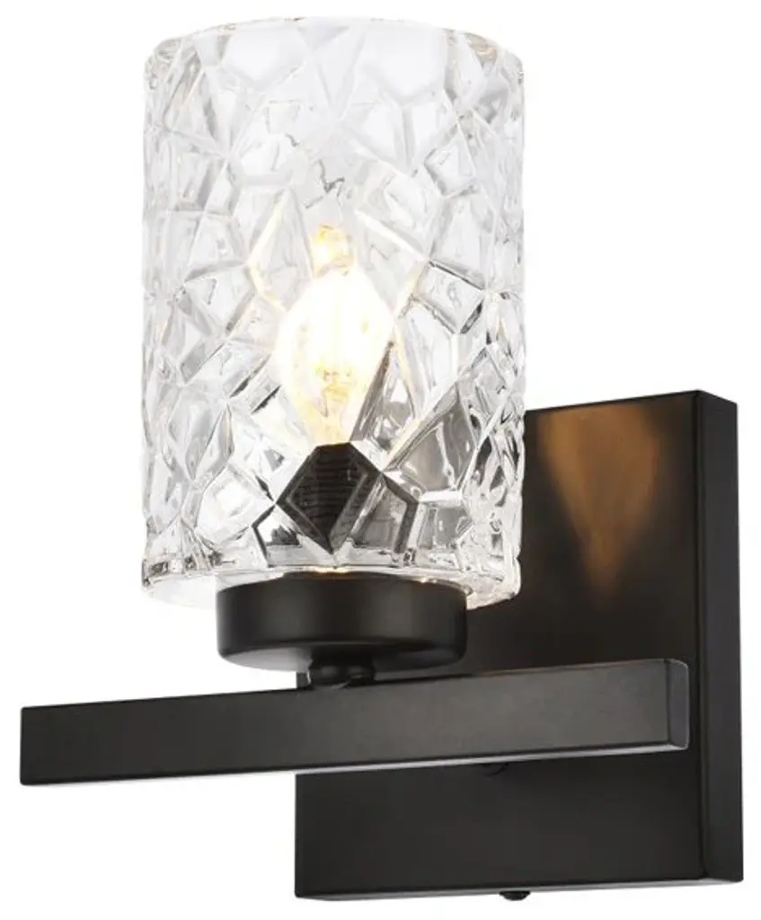 In all of its auspicious glory, this wall lamp will shine its felicitous light for you. As the light passes through the shade, it dances around with the shadows and puts a spotlight in your room. Whether it is in your entryway or bathrooms, this 1-light wall lamp will surely please you and your guests. product dimensions: 7.5 inch wide X 5.5 inch depth X 7.7 inch highRequires 1 E12 bulb, (bulbs not included)hardware finish in Blackeasily mounted on the wallproduct material consist of Metal and Glasslighting is dimmableideal for lighting for the bathroom, hallway, and entryway