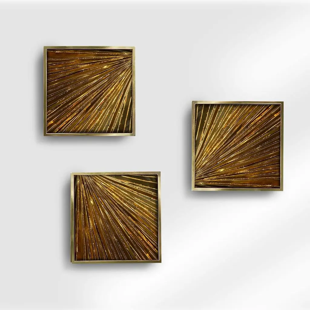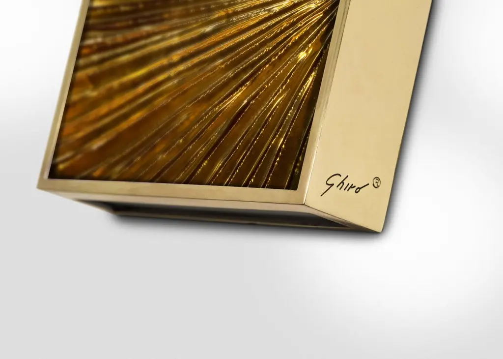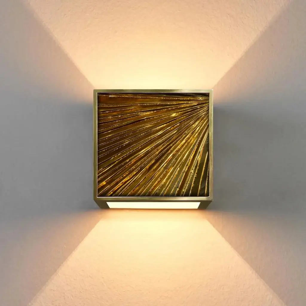 Collection of wall lights by Ghirò Studio (Milan).The applique is the perfect combination of functionality and aesthetic innovation. It gives at the same time balance and vivacity giving a refined harmony to the living area. It has a square shape. The 24 Kt gold plated brass structure has been designed to create directional beams of light up and down. Beautiful by day when it’s off. Even more enchanting in the evening, when it’s on and creating a play of light. The crystal was hand-worked. The engravings create a pattern of lines are combining perfectly with the iridescent reflections between the different shades of amber and gold.This wall light is new and in excellent condition.Every imperfection is to be considered a value and not a defect, a guarantee of the extreme naturalness and craftsmanship of our product.These items are handmade and will not be all exactly the same.