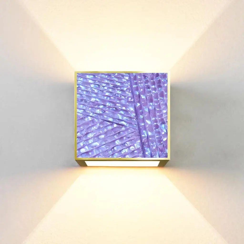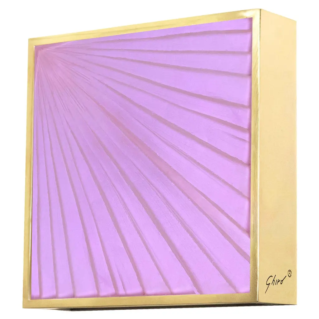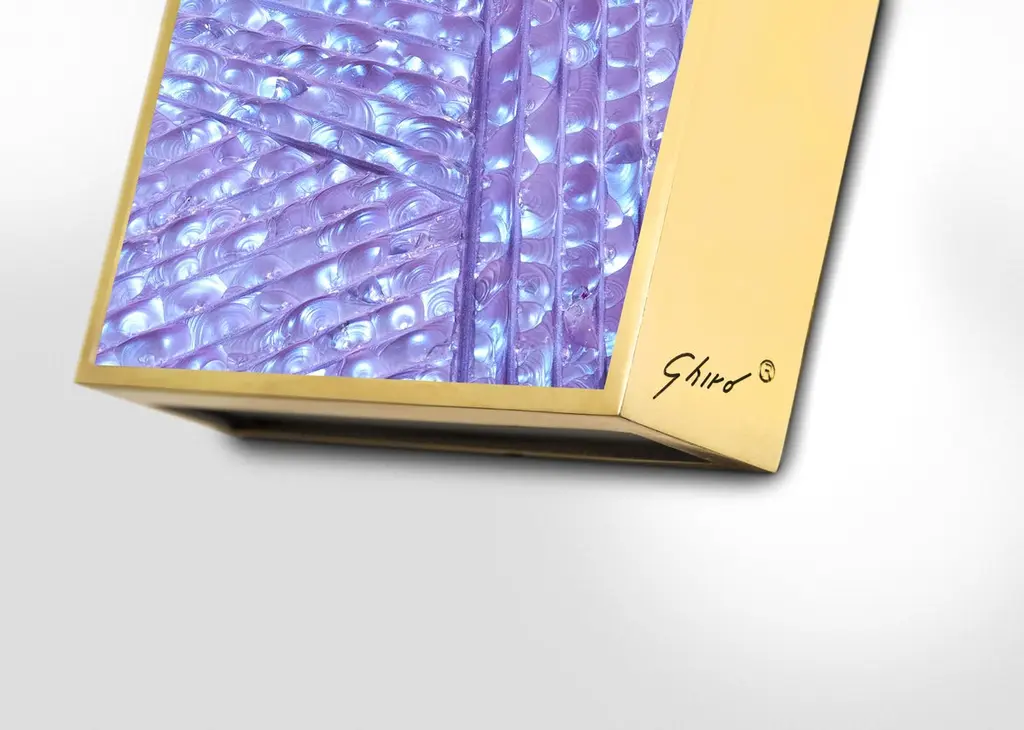 2021 Collection of wall lights by Ghirò Studio (Milan).The applique is the perfect combination of functionality and aesthetic innovation. It gives at the same time balance and vivacity giving a refined harmony to the living area. It has a square shape. The 24 Kt gold plated brass structure has been designed to create directional beams of light up and down. Beautiful by day when it’s off. Even more enchanting in the evening, when it’s on and creating a play of light. The crystal has been engraved and carved by hand at the bottom.The crystal has a blue color with iridescent blue and violet reflections given by the processing.This sconce is new and in excellent condition.Every imperfection is to be considered a value and not a defect, a guarantee of the extreme naturalness and craftsmanship of our product.These items are handmade and will not be all exactly the same.