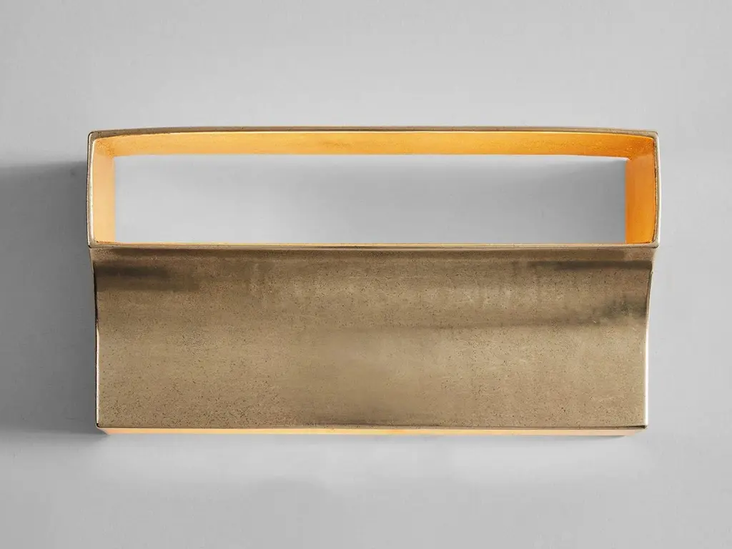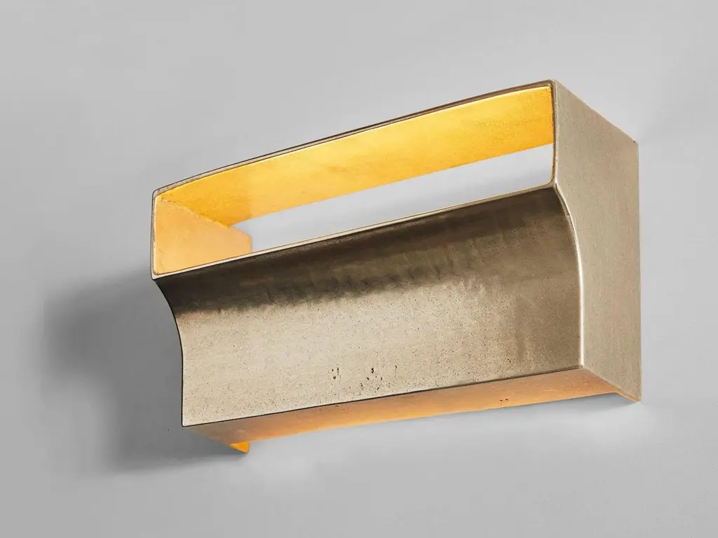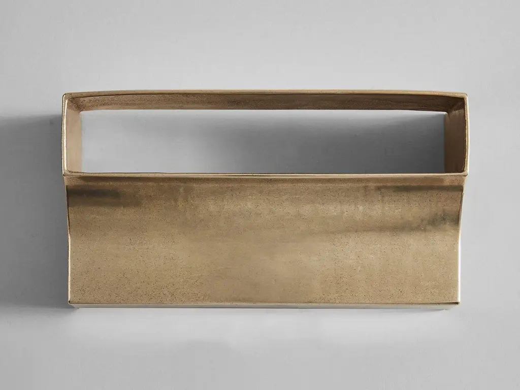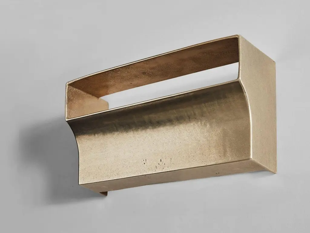 Brass Scoop Wall Light by Henry WilsonDimensions: W 33 x D 12 x H 18 cmMaterials: BrassScoop wall light is sand cast in brass. Openings on the top and bottom of the sconce allow light to wash up and down the walls, while the slot at the front projects light outwards while hiding the bulbs from view. Utilising a dual bulb holder which will suit any E26/E27 bulbs. Each piece is hand finished and can be mounted to any surface using a discrete plate. Scoop wall light is manufactured in small batches, meaning slight variations will occur from piece to piece. Production marks may include slight pour ripples or surface pitting. It will arrive with a bright finish but will oxidise and darken over time to reveal a distinctive patina. Simply use a metal polish to restore a like-new finish.Henry Wilson's work combines a rational, democratic utility with an element of sculptural expression. There is a clear form and function in our products, but it’s important they also have feeling. We are interested in the awkward beauty that comes from something made by hand. We like to explore how imperfection can be introduced into an Industrial process, to make something at scale that retains a sense of individual charm.Permanent collections and exhibitions- Museum of Applied Arts and Sciences, Sydney, Australia- Art Gallery of Western Australia, Perth, Australia- 'Sempering' XXI Triennale, MUDEC, 2016, Milan, Italy.All our lamps can be wired according to each country. If sold to the USA it will be wired for the USA for instance.