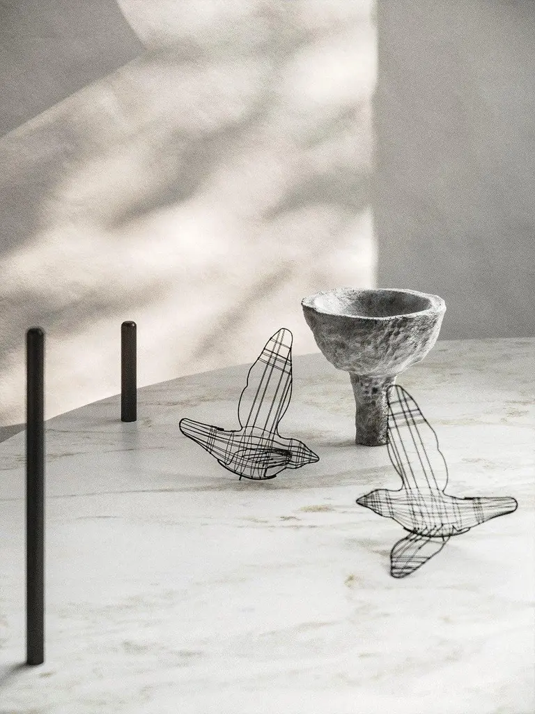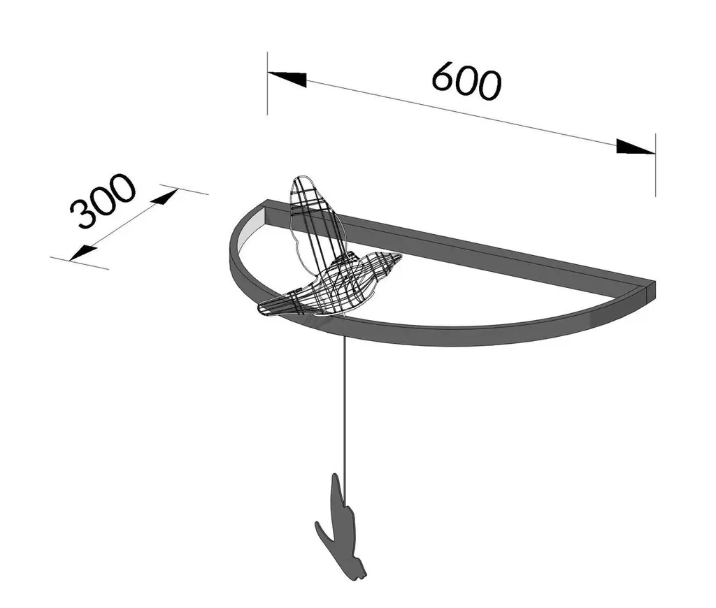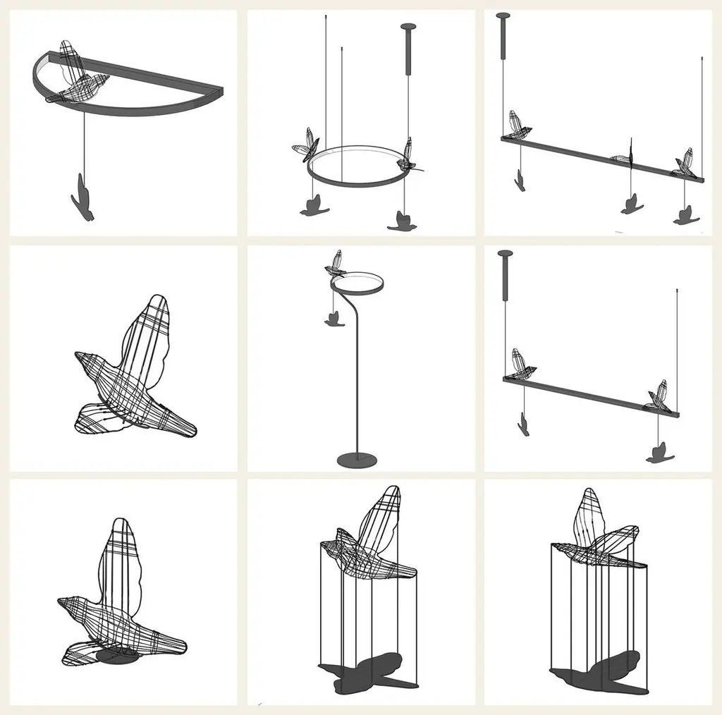 Flight shadowsThis object symbolizes the dynamic movement of a static form. Visual incompleteness demonstrates the dynamics of the form transformation, the acquisition of new senses and the desire to move. But we can never escape the main thing — our shadow.It hides all our depth and memory. Even if we go far away, for others we will still leave a mark on the Earth that will reflect our life’s way. The variability of life, the memory of one’s origins, the transformation of consciousness. The shadow symbolizes the memory that will always remain with us.Product name: Flight ShadowsCategory: LightingType: pendant, floor lampMaterial: Steel rods, textileOverall dimensions: 600 mm x 600 mm x 450 mmLight source: LED stripe, 2340 Lum, driver included 3000-4000K, 110-220VAvailable in different colors according to RAL.Options of the lighting collection:Measures: pendant circle 600 x 600 mmpendant line, 1200/1500 mm lengthfloor lamp, 1450 x 450 mm.