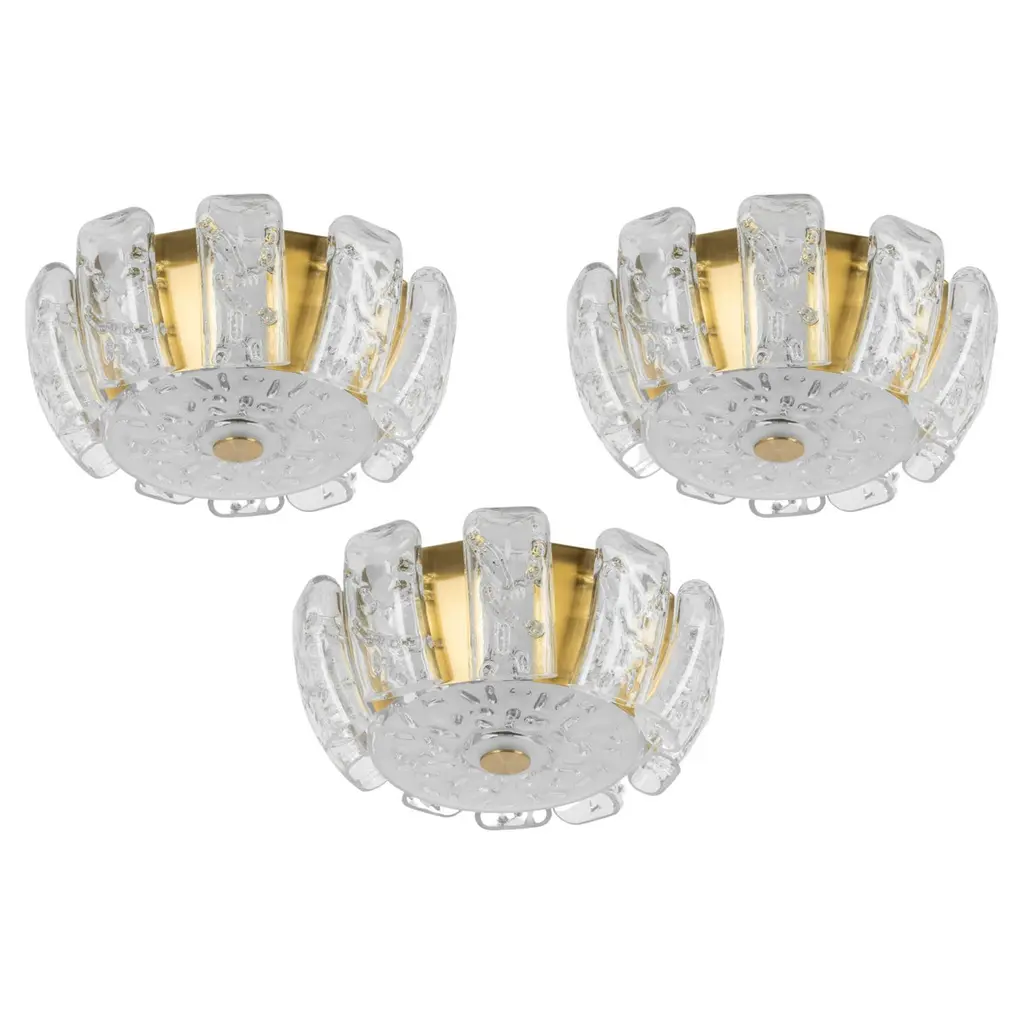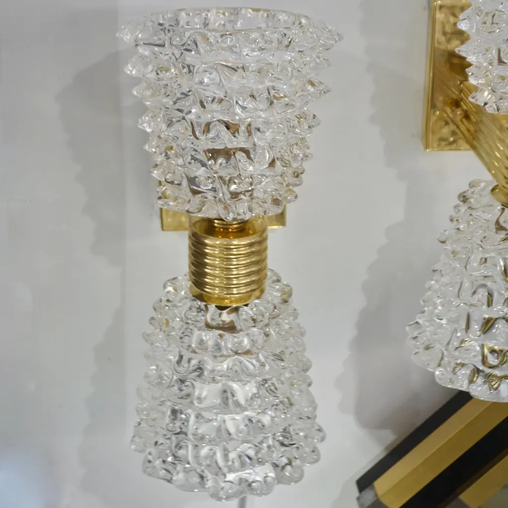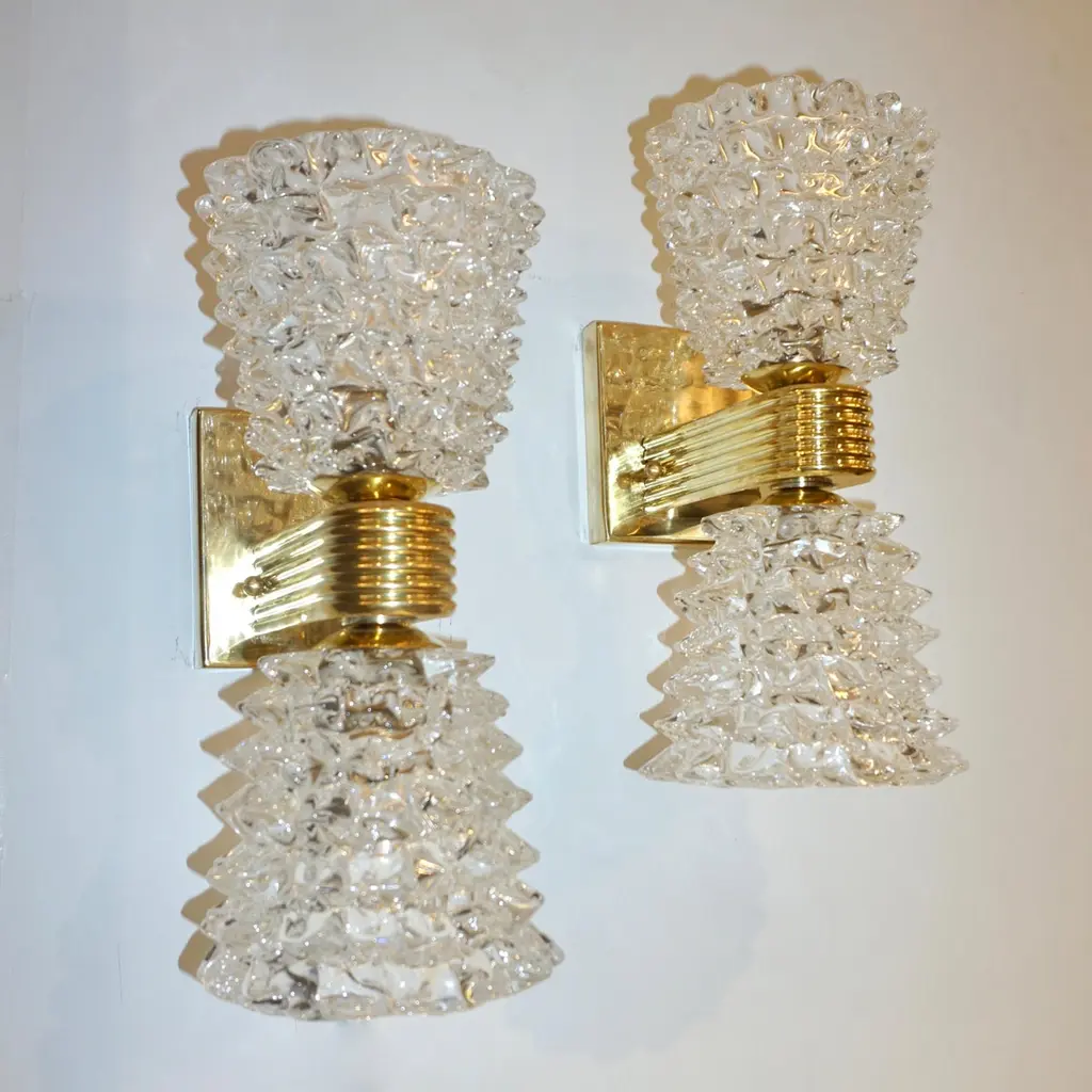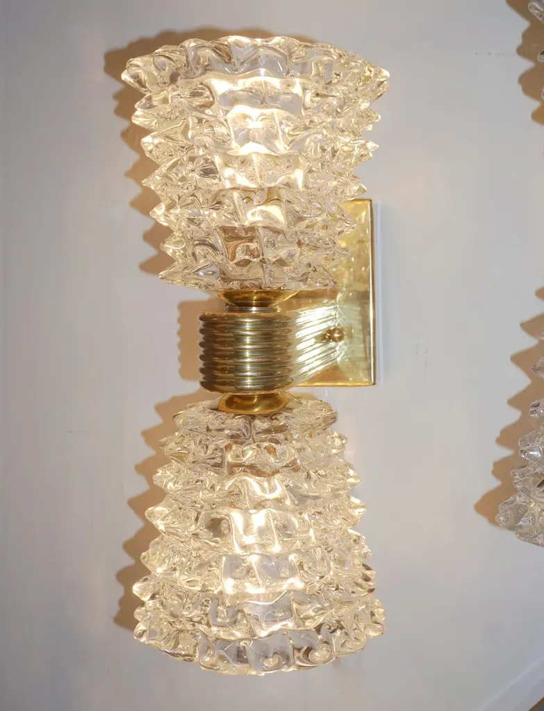 Organic sculpture modern crystal clear Murano glass wall light in the Art Deco style of Barovier Toso, entirely handcrafted in Italy, with double cone shape shades providing upward and downward light source, made using the rostrato technique that gives a 3-dimensional texture to the glass and multiplies reflections, on an organic brass hand-made plate.Options for finishes and glass colors.