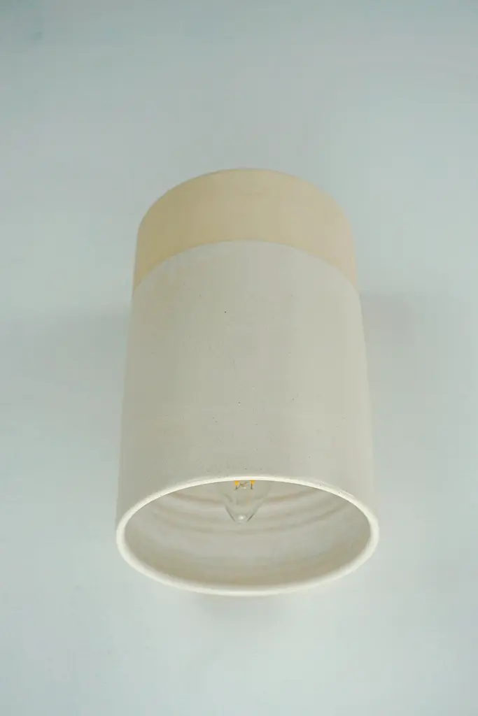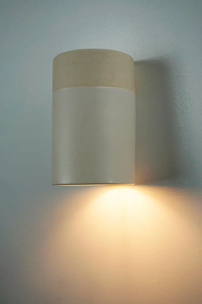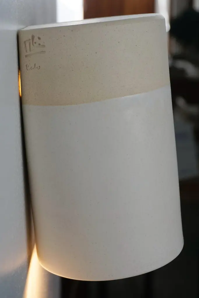 Ceramic hand - crafted wall sconce, designed and signed by Rulo and Manolo Eirin. Interior and exterior vitrified in white, which allows a greater projection of light on the wall. The electrical connection of the lamp is suitable for both the American and European markets (The bulb is not included). The Material used is top quality stoneware and it is made by specialized artisans in the Galician town of Buño (Spain), a landmark for contemporary pottery, with hundreds of years old. Includes authenticity stamp and signature.We have the wall lights in completely white and in two tones.