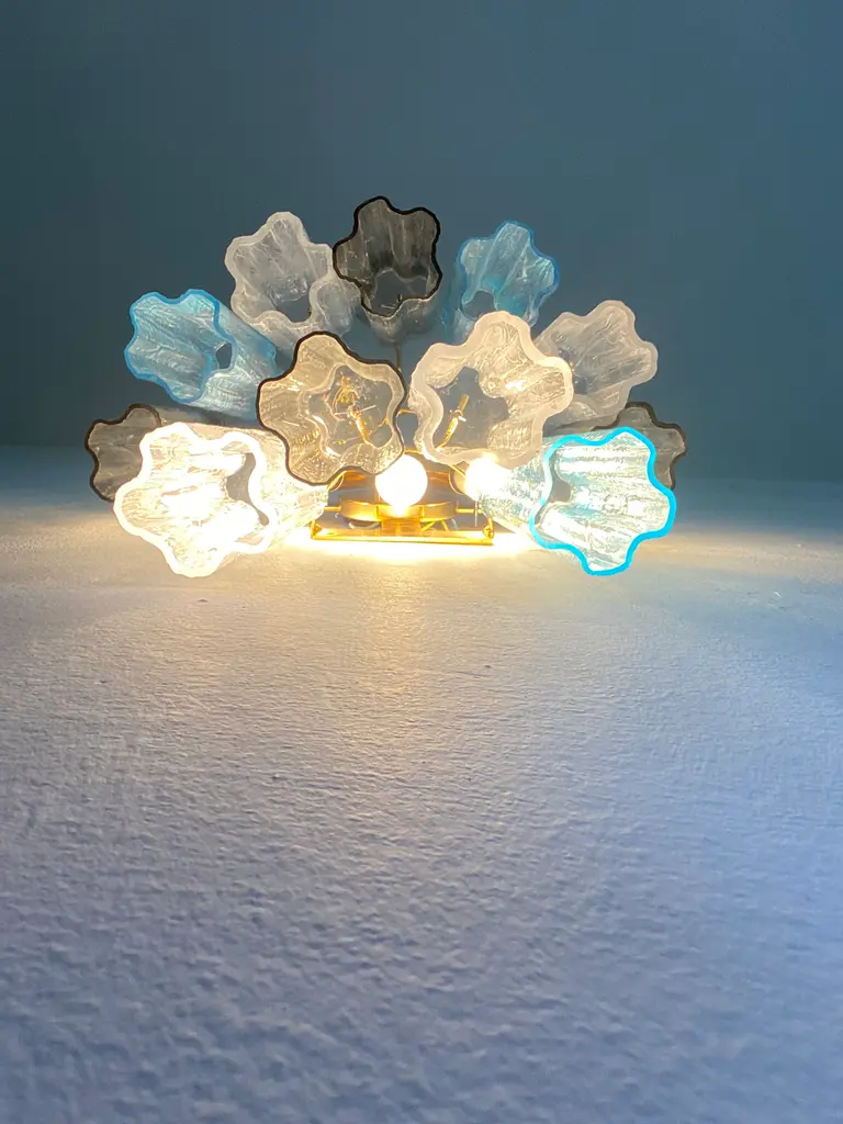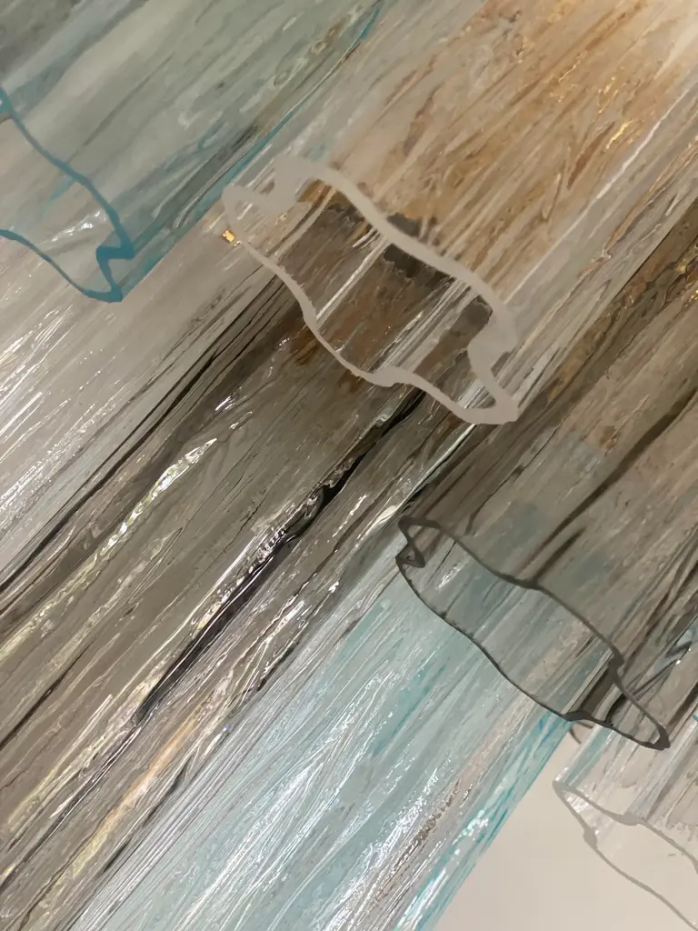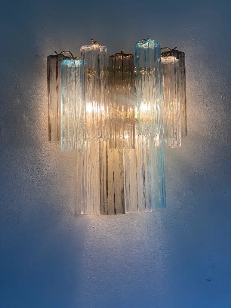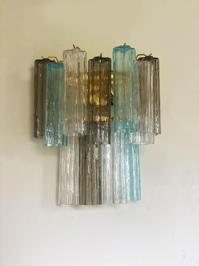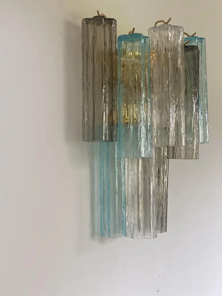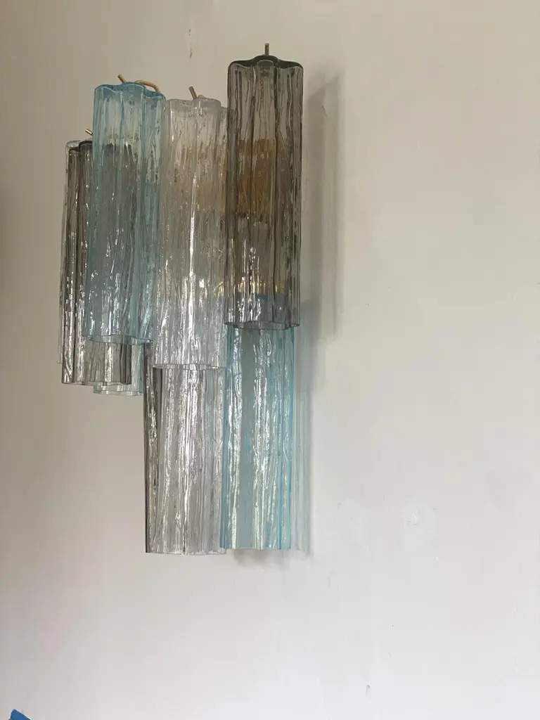 A pair of Contemporary“TRONCHI” wall sconce. Two levels of Light- blue, trasparent and grey “TRONCHI” MURANO GLASS Hand-made in Murano glass , all made in Italy Scip from Italy a piece of hight italian hand-crafmanship Dimensions (cm/in): L 40 cm H 48 cm SP 20cm/ L 15.8′ H 18.8″ Sp 7.8′ Finiture: Gold 24K bath of metal frame 2 bulbs compatile with led.