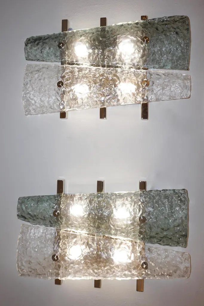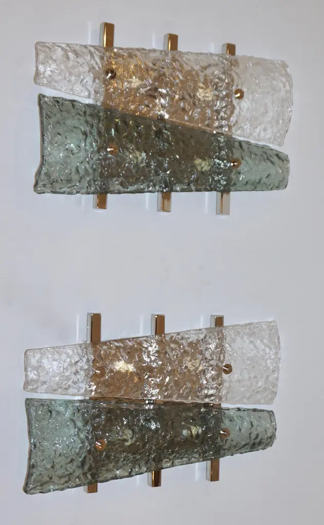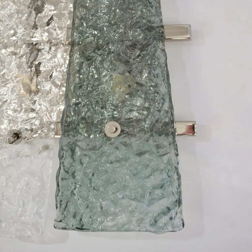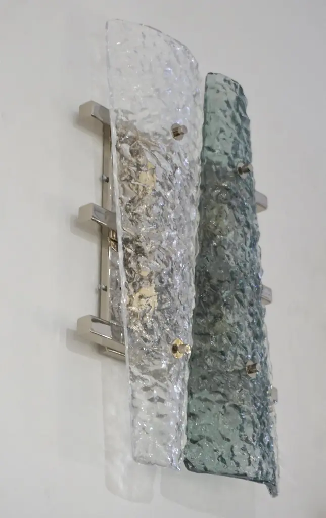 Italian pair of geometric wall lights, entirely handcrafted, the streamlined nickel backplate consisting of a series of 3 horizontal nickel bars supports 2 destructured triangular elements in crystal and aquamarine green Murano glass presenting a special texture that enhances the modernity of the design. Cosulich Interiors makes a sustainable choice of nickel over chrome as nickel is an element that cannot be created nor destroyed. It can be recycled again and again without loss of quality, it is durable and designed for long-term use.