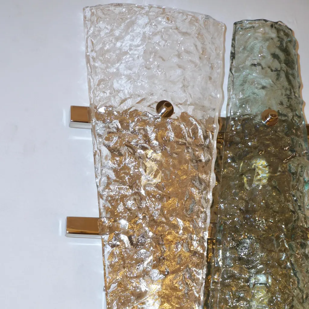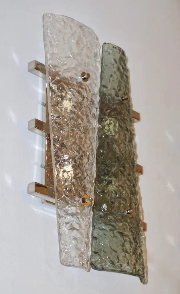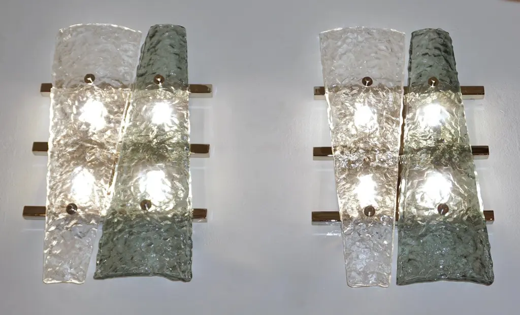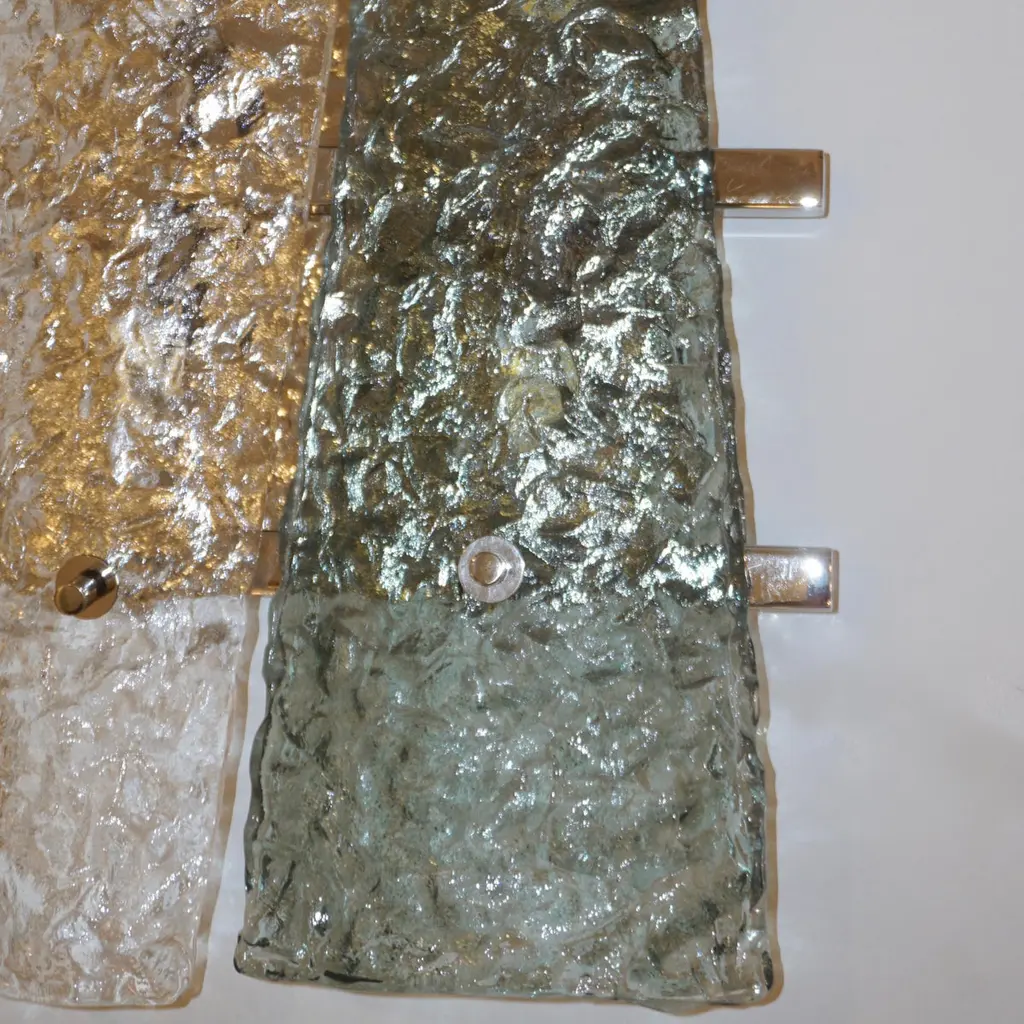 Italian pair of geometric wall lights, entirely handcrafted, the streamlined nickel backplate consisting of a series of 3 horizontal nickel bars supports 2 destructured triangular elements in crystal and aquamarine green Murano glass presenting a special texture that enhances the modernity of the design. Cosulich Interiors makes a sustainable choice of nickel over chrome as nickel is an element that cannot be created nor destroyed. It can be recycled again and again without loss of quality, it is durable and designed for long-term use.