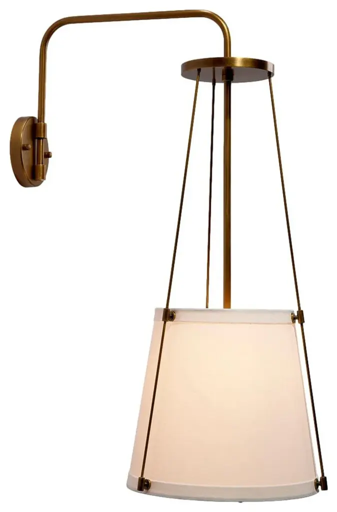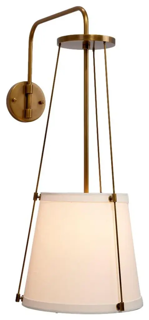 This sconce features an off-white drum shade in pure linen, producing a softly diffused glow. It is suspended from a delicate framework of antiqued brass and is as effortlessly appealing as the Southern California lifestyle that inspired it. Coordinating pendant light available separately; also available in Bronze.12"L x 20" deep x 30"H. Weighs 5 lbs. Backplate is 4.75" dia.Hand Finished Metal. Linen Fabric Shade.UL listed. Uses one max 40W Type B candelabra bulb (not included). Direct wire. Compatible with dimmer switch (not included).Heirloom Quality - Expertly hand crafted and hand finished. Due to the hand crafted nature of this piece, each piece may have subtle differences.