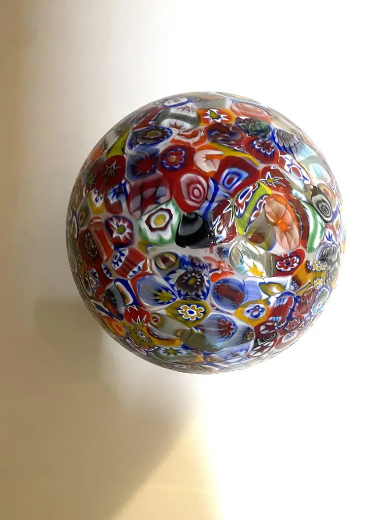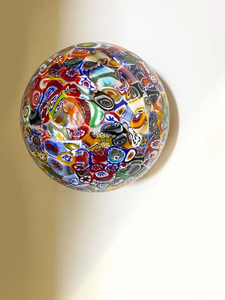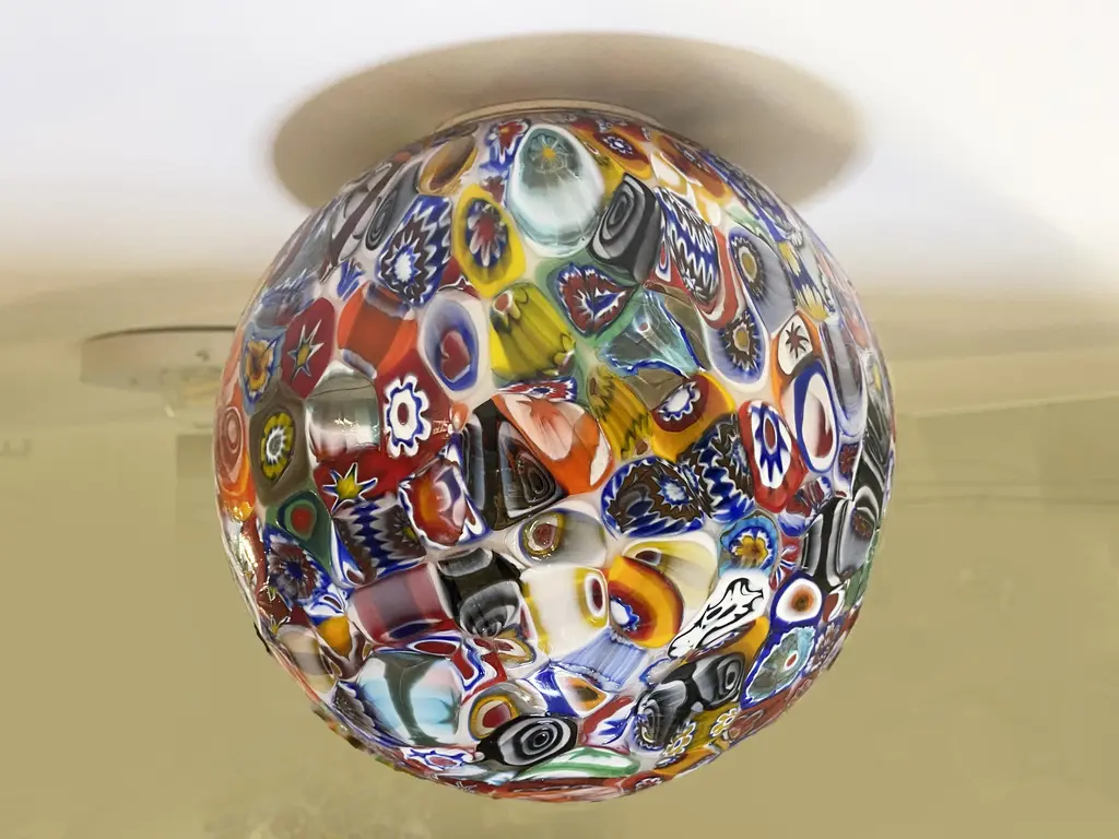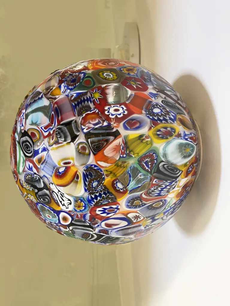 Impressive contemporary sphere in Murano glass with multicolored Murrine. Floreal design in very particular and effective movement. Very High Italian craftsmanship. Venetian murrine and multicolored millefiori make up this scenographic lamp. it can be hang on ceiling like a flush mount or on the wall . These jewels melted together are skillfully blown by skilled Murano masters, Ambient and shenographic interior light. A venetian jewel lamp. Chromed metal frame for 1 bulb. 1 Led bulb required. Dimensions (cm/in): Diameter 20cm/7.8″