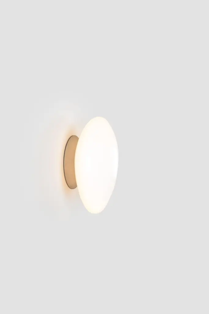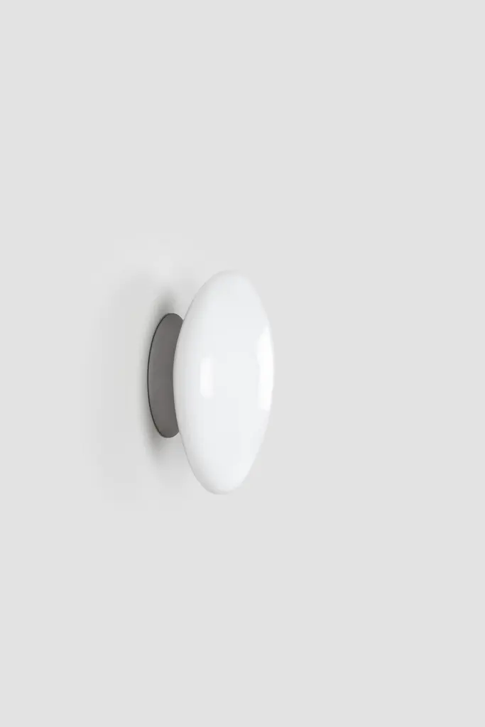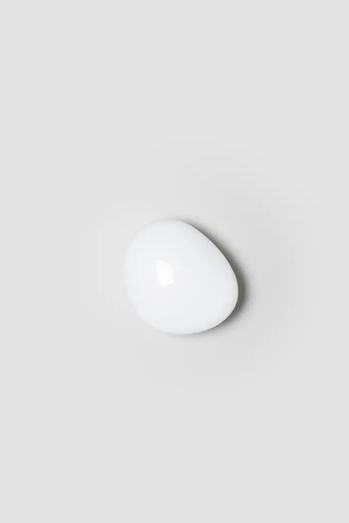 Contemporary wall lamp Pebble Electrical : Voltage: 110 – 277V / 220 – 240VIntegral LED source : 1 x 4W LEDThe model shown in picture:Dimensions: C: 23 x 20 x 10 cm Color: Pearl white______PebbleThe Pebble series celebrates the inexplicable and beautiful qualities of stones. Enhancing their simple yet sculptural form through translucency, two glass blown shapes come together entering a dialogue. The result is a seemingly bespoke pendant fixture—endlessly evolving in shapeas it appears from different angles. Always a combination of a large and small glass blown form, each with four possibilities for finishes, the Pebble allows for the individual to extract their personal collection.Both glass forms are connected to one another with a machined aluminum LED holder and heat sink; allowing the forms to pair up in harmony—while elegantly housing the electrical connections and suspension system. Each sideis proportionally lit, allowing the combination of large and small forms with consistent light output. Opaque, translucent, glossy, etched or varying in colour—the range of finishes honours the diverse qualities of pebbles found in nature.The Pebble series offers a double glass form pendant as well as a single glass sconce version.