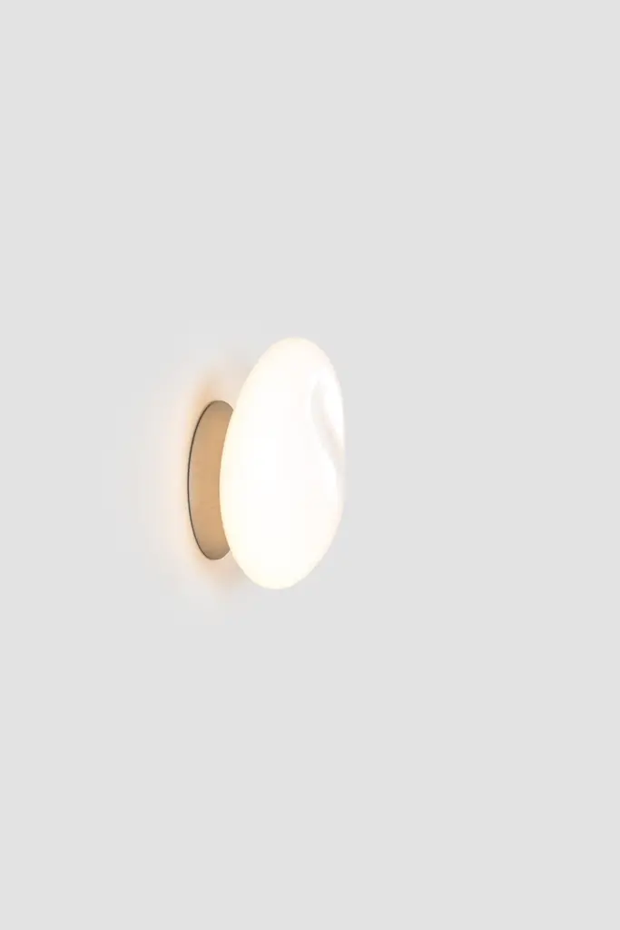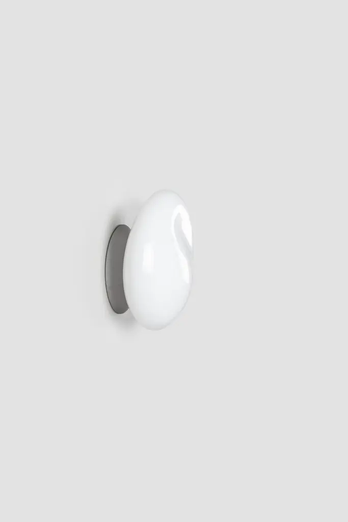 Contemporary wall lamp pebble Electrical : Voltage: 110 – 277V / 220 – 240VIntegral LED source : 1 x 4W LEDThe model shown in picture:Dimensions: D: 20 x 19 x 10 cm Color: White______PebbleThe Pebble series celebrates the inexplicable and beautiful qualities of stones. Enhancing their simple yet sculptural form through translucency, two glass blown shapes come together entering a dialogue. The result is a seemingly bespoke pendant fixture—endlessly evolving in shapeas it appears from different angles. Always a combination of a large and small glass blown form, each with four possibilities for finishes, the Pebble allows for the individual to extract their personal collection.Both glass forms are connected to one another with a machined aluminum LED holder and heat sink; allowing the forms to pair up in harmony—while elegantly housing the electrical connections and suspension system. Each sideis proportionally lit, allowing the combination of large and small forms with consistent light output. Opaque, translucent, glossy, etched or varying in colour—the range of finishes honours the diverse qualities of pebbles found in nature.The Pebble series offers a double glass form pendant as well as a single glass sconce version.
