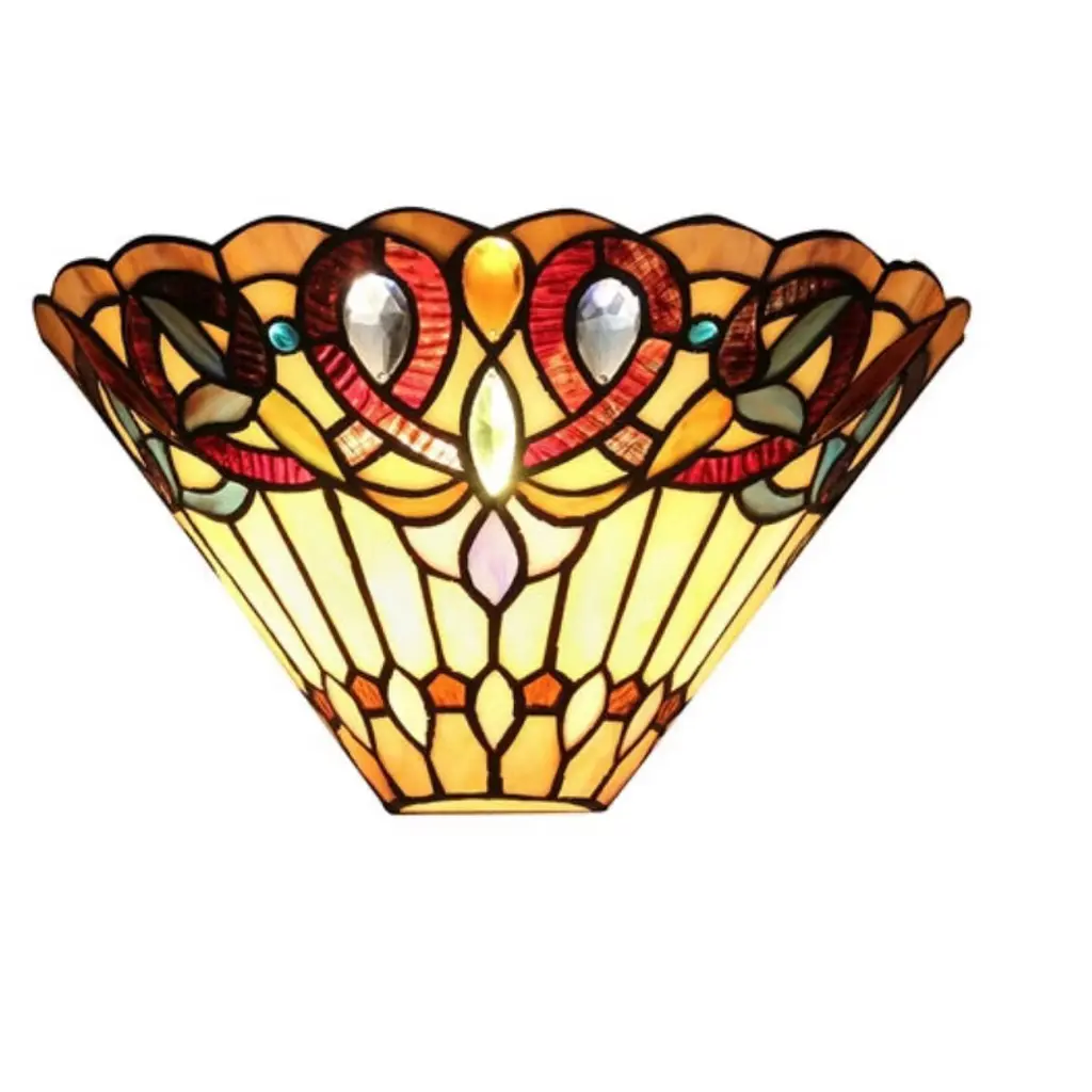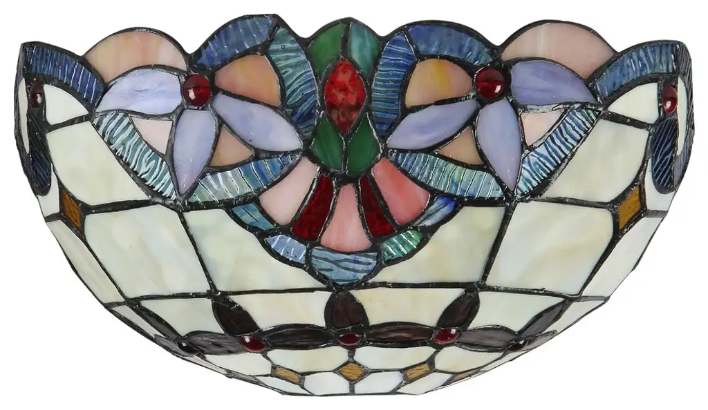 This Tiffany-style Victorian design 1-light wall sconce features a bronze finish that will complement many decors throughout your home. Hand crafted individually hand cut pieces of art glass that will add color and beauty to any space. Main colors are beige and blue.(1) 60 Watt max E26 Type A Bulb (not included)Hardwired, Wall outlet switch106pcs glass cut, 9 beadsUplightIndoor SettingSince these are hand crafted products, the exact color of glass pieces may vary. Colors of the glass will appear darker and less vibrant when not illuminated. Handmade glass will vary from one piece to the other; glass made at different times will also vary. Light bulbs used in lamps or ambient lighting may affect the appearance of the products. Stained glass product has been protected with mineral oil as part of the finishing process. Please use a soft dry cloth to remove any excess oil.