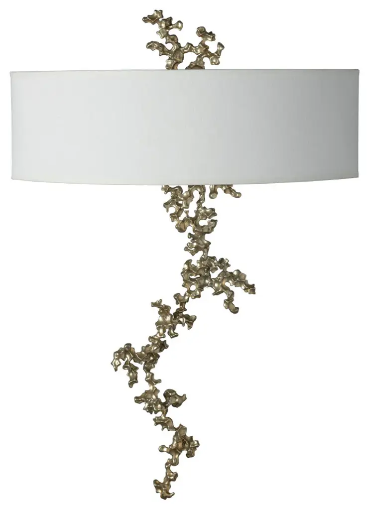 Delicate. Elegant. Stunning. This unique and beautiful wall sconce is both simple and complex. Simple in its beauty. Complex in its creation. Each vertical coral "reef" is painstakingly created by artist-makers who weld curated small, coral-like pieces of aluminum together into this exquisite vertical array for a one-of-a-kind look. Part of ART + ALCHEMY by Hubbardton Forge.Features:Handcrafted in Vermont, USALifetime Limited Warranty when installed in residential settingHalf-drum indoor wall sconce with a fabric shade and poured aluminum details.Requires 2 B10 E12 Candelabra Replaceable Bulb (30 max wattage) (Not Included)