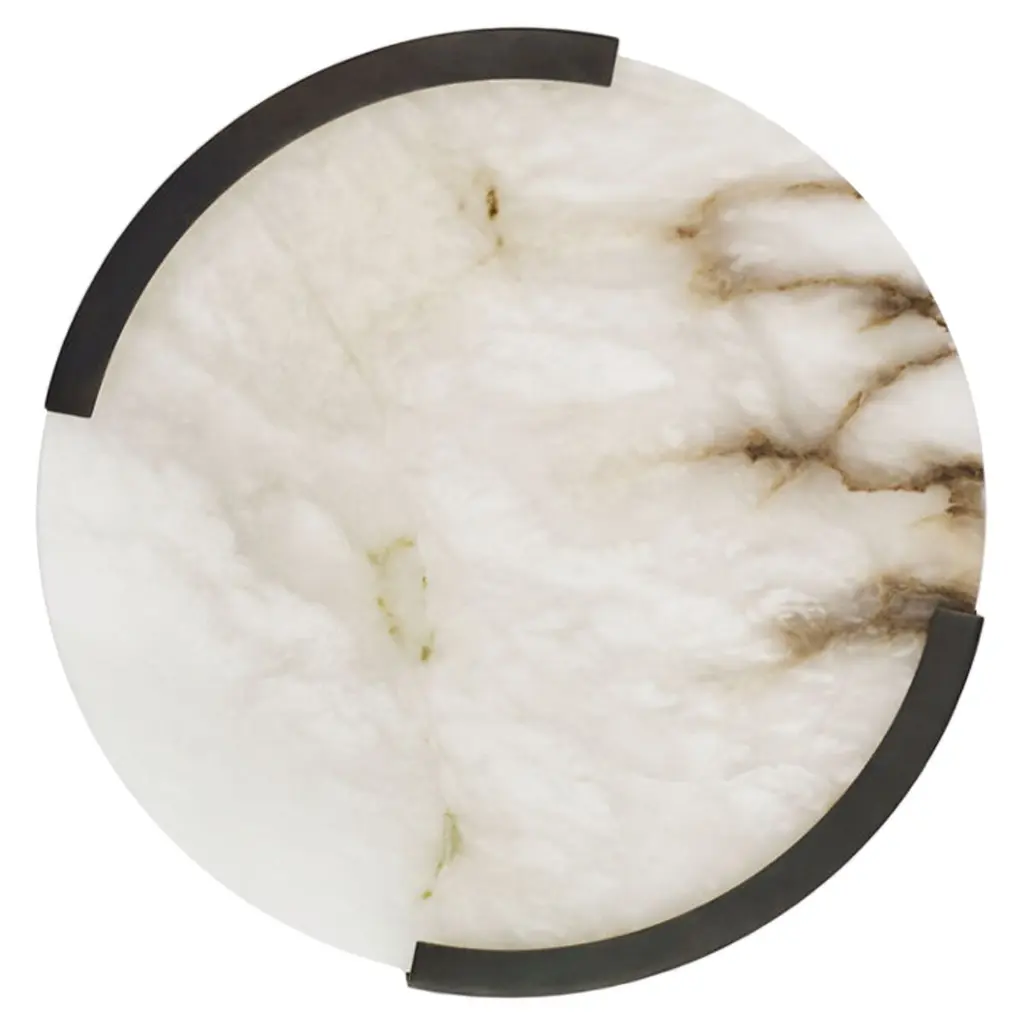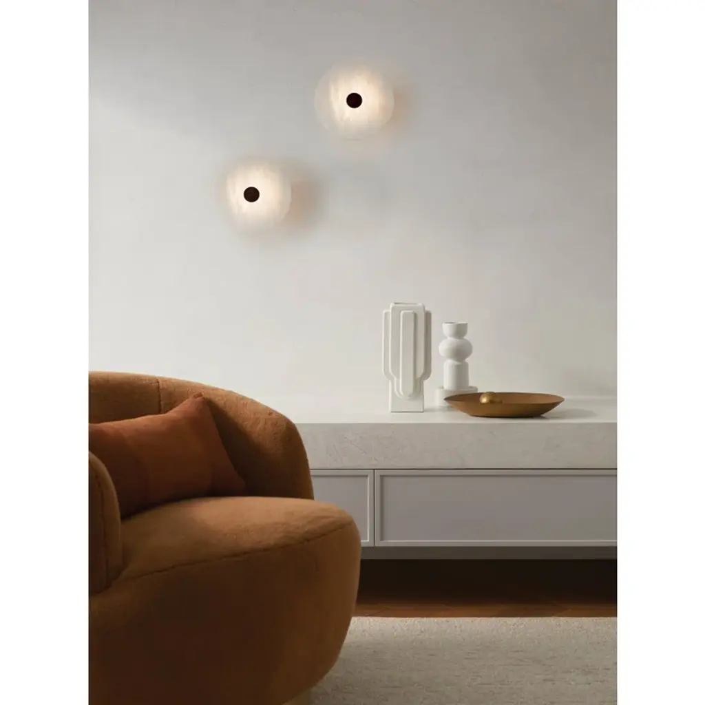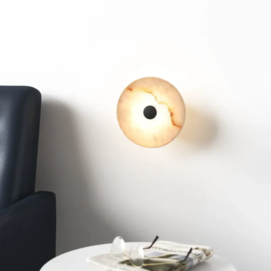 Sculpted perfection emanates from the ivy bronx modern wall sconce. Its sophisticated confluence of artistry and illumination pairs a natural Spanish alabaster disc diffuser with glowing led illumination that adds adaptability with dimming capabilities and color temperature adjustability via its wall switch. A sophisticated warm brass finish center bracket secures the shade to the wall plate, offering elegance and inviting appeal. Add a pair flanking a fireplace mantel or entryway to create a rich, refined finishing touch. Alabaster is a naturally occurring stone, offering variation in pattern that ensures each and every light is unique.