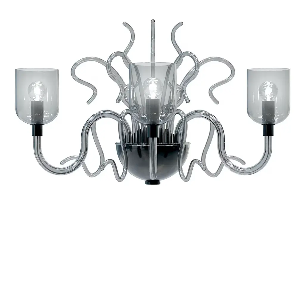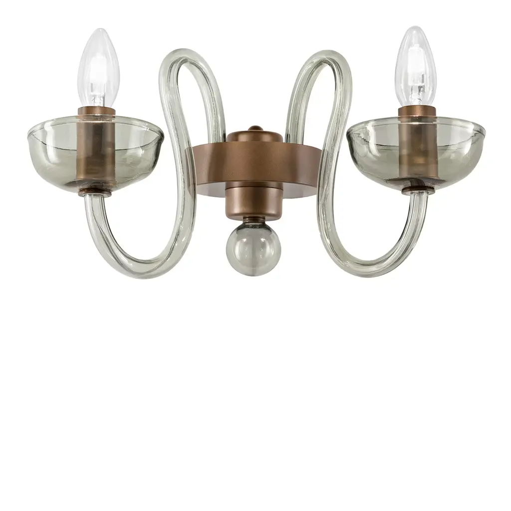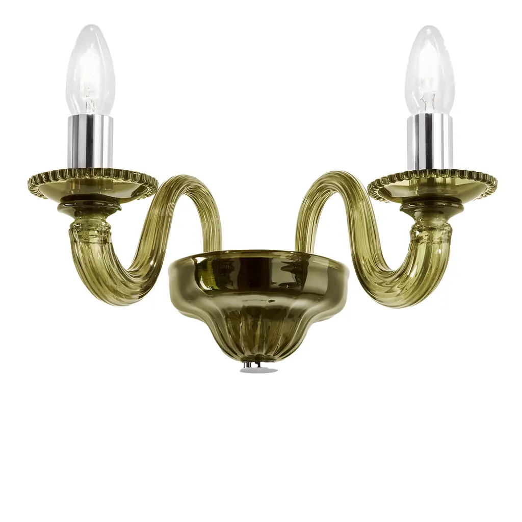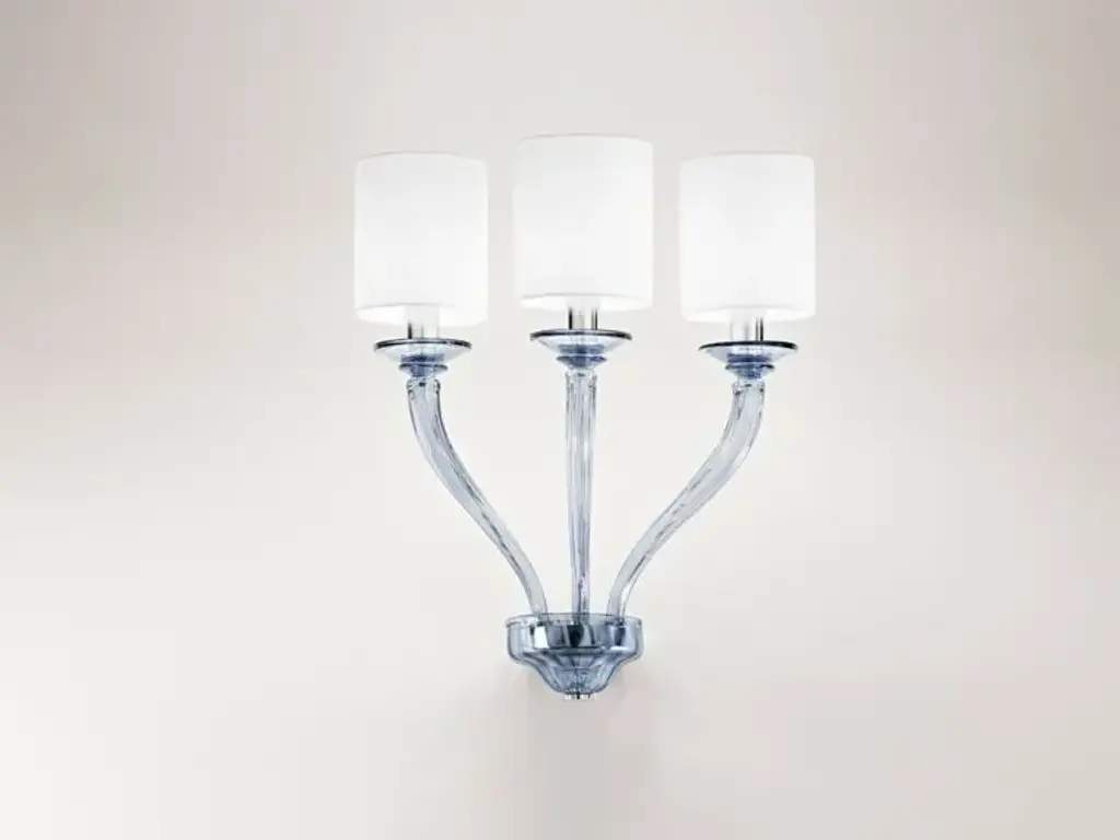 Infusing glamour and elegance to a modern interior, this exquisite glass sconce is handcrafted using the ancient incamiciato technique, whereby a layer of lattimio (milky white) glass and transparent glass are superimposed to obtain a distinctive opaque effect. This sconce boasts two arms extending upwards from the semicircular base, each embellished with a flared bobeche and chrome-finished details. The care to detail is highlighted by the chrome finish (also available in gold upon request) of the metal components that adapt with ease to specific interior needs.