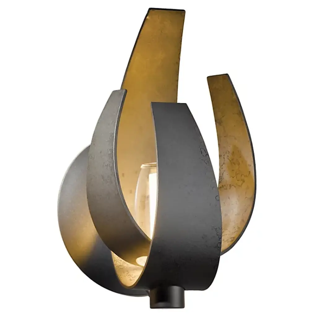 Add some real heat to your home's interiors with this deliciously stylish piece. The Corona Wall Sconce by Hubbardton Forge brings a distinctive solar aesthetic into your space, with its structure resembling the wavy brilliance of a flame. An internal shade of curved Clear Glass around a Frost Glass cylinder projects warm, diffused light in all directions. The light reflects off the Hand Forged Iron Body and accentuates its dynamic curves in an appealing way.
