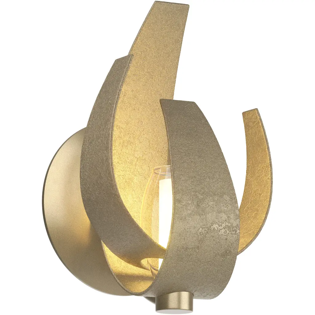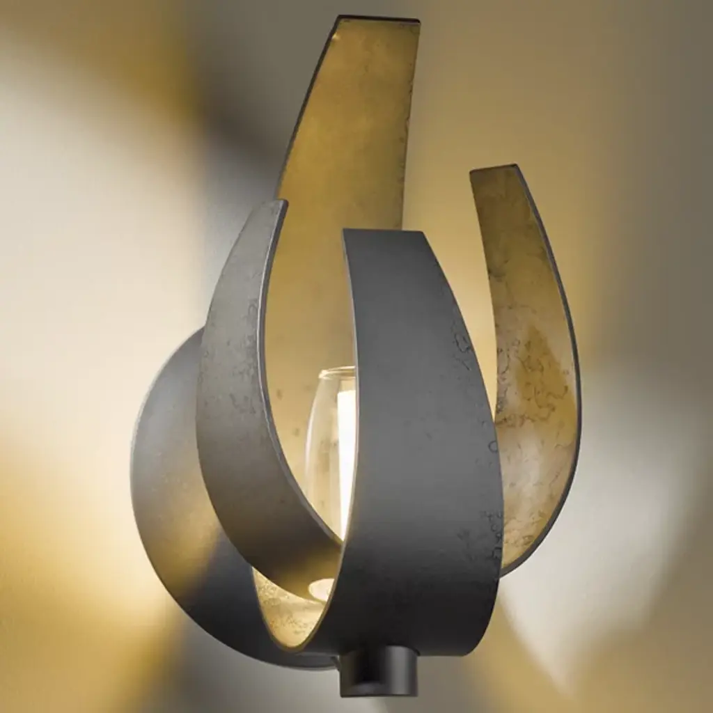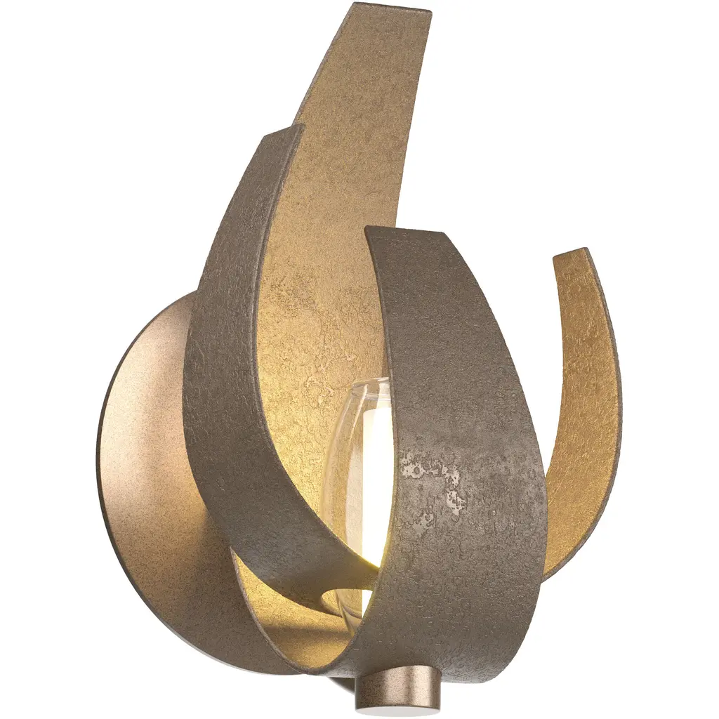 Add some real heat to your home's interiors with this deliciously stylish piece. The Corona Wall Sconce by Hubbardton Forge brings a distinctive solar aesthetic into your space, with its structure resembling the wavy brilliance of a flame. An internal shade of curved Clear Glass around a Frost Glass cylinder projects warm, diffused light in all directions. The light reflects off the Hand Forged Iron Body and accentuates its dynamic curves in an appealing way.