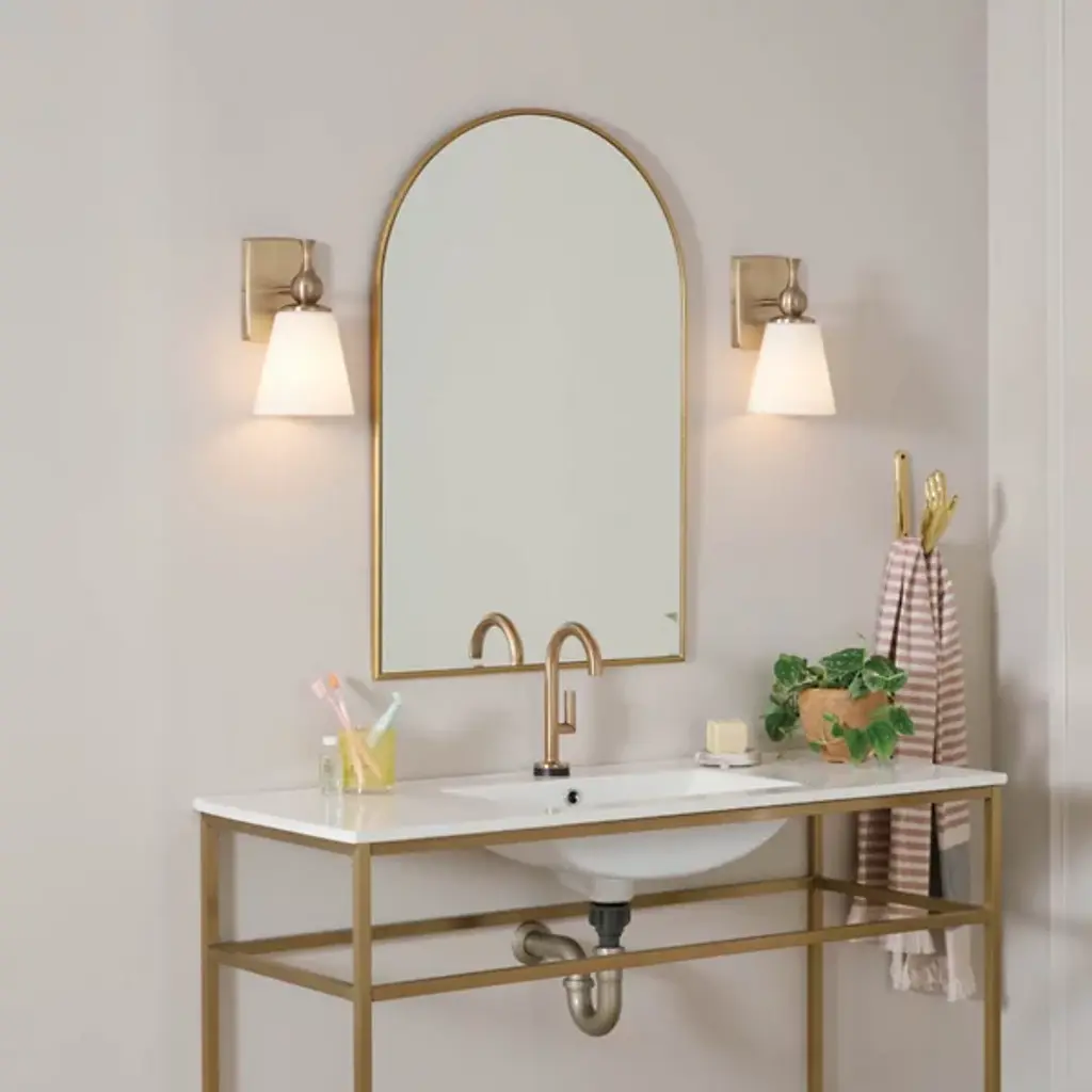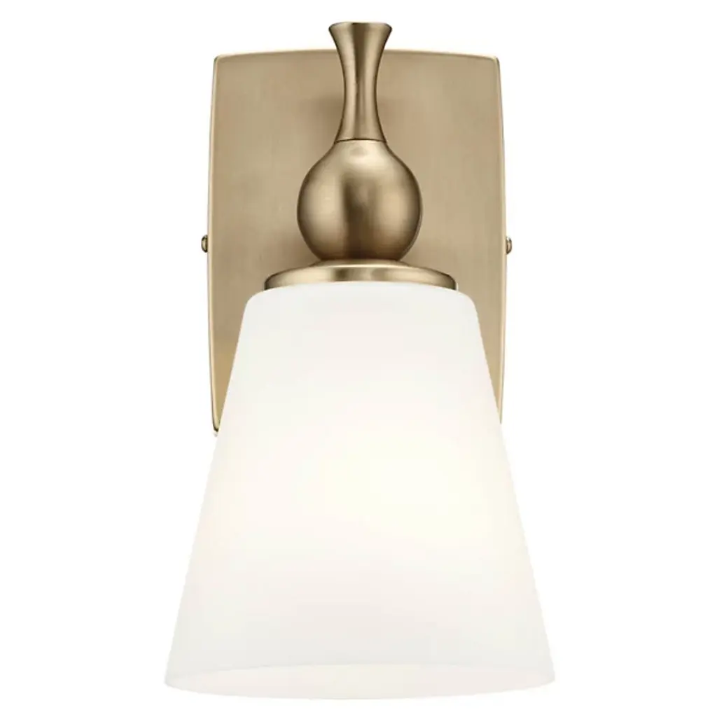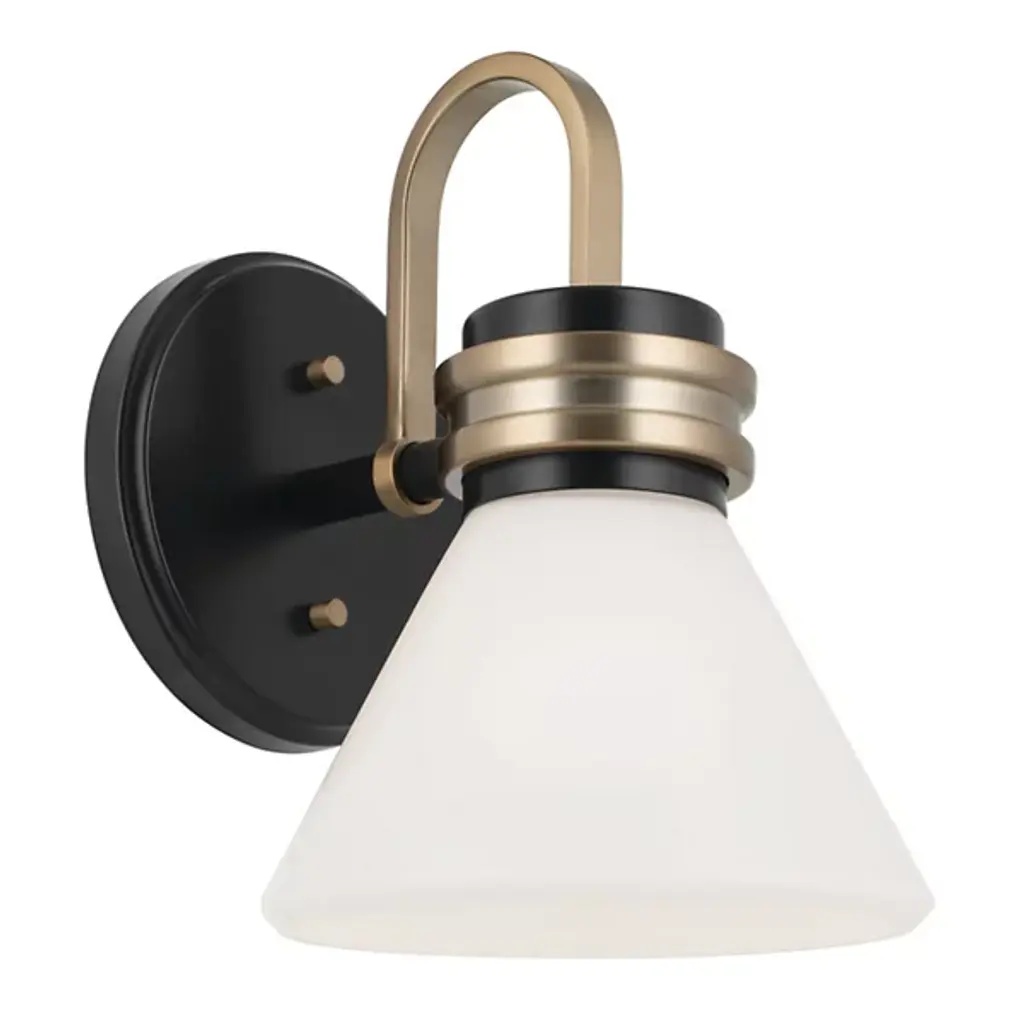 Give your lavatory a pleasant glow with the Cosabella Bath Wall Sconce by Kichler. A conically shaped shade of satin etched case opal glass is crowned by a lovely vase-like brass embellishment. This sconce’s shade is firmly secured at your wall courtesy of a steel backplate. This wall sconce is ideally placed beside your restroom mirror so that you can get ready each day under ample amounts of light. Easily adjust the sconce’s brightness level when you pair the Cosabella Bath Wall Sconce with a standard dimmer.