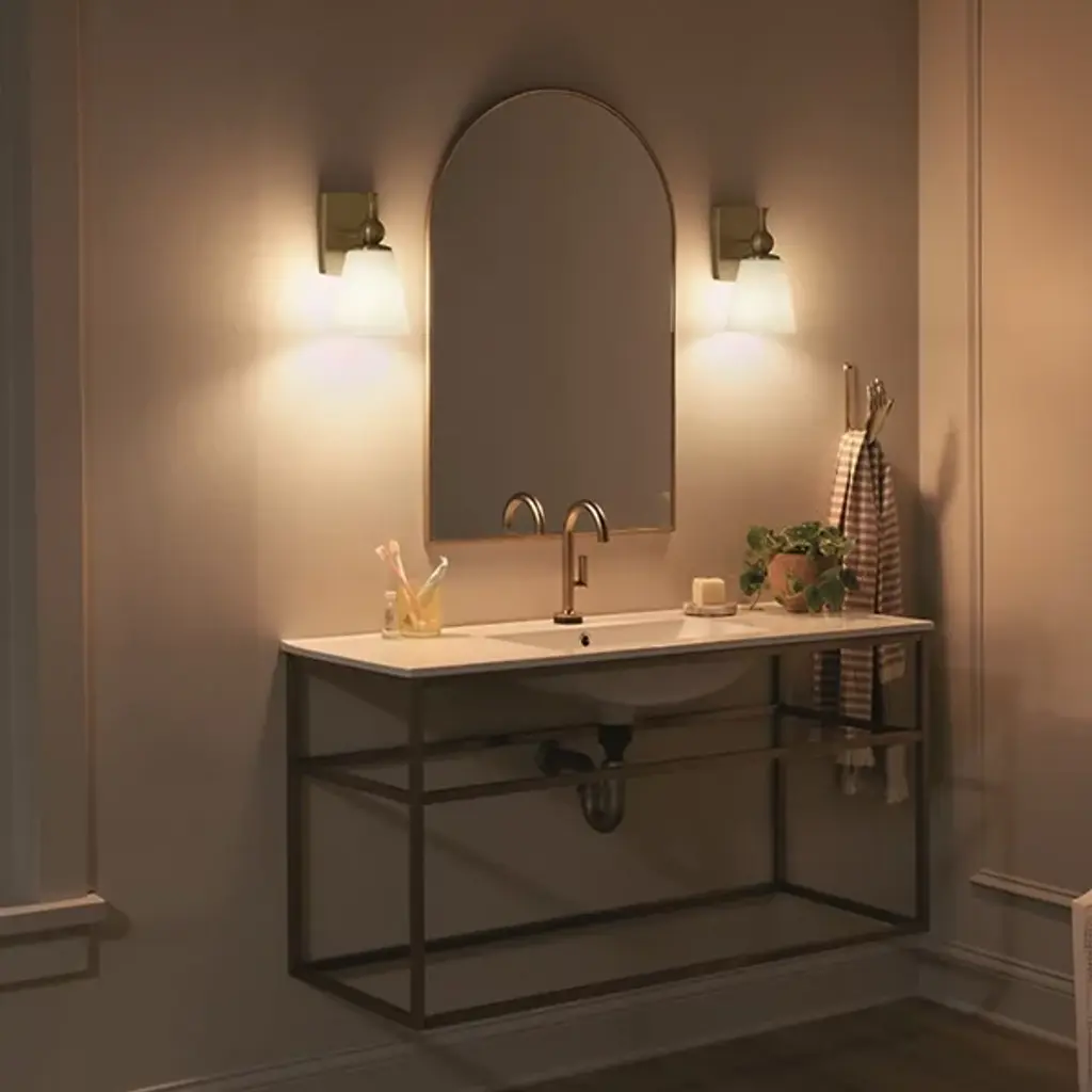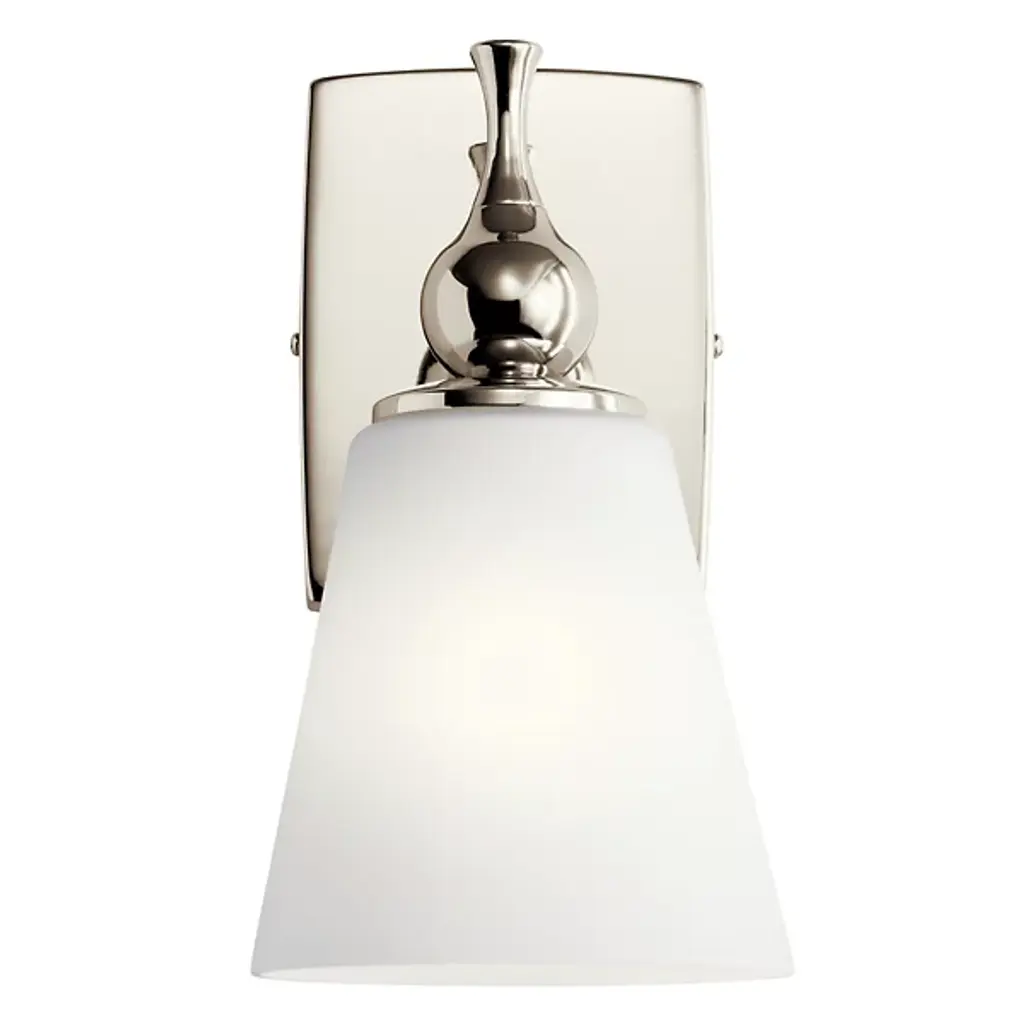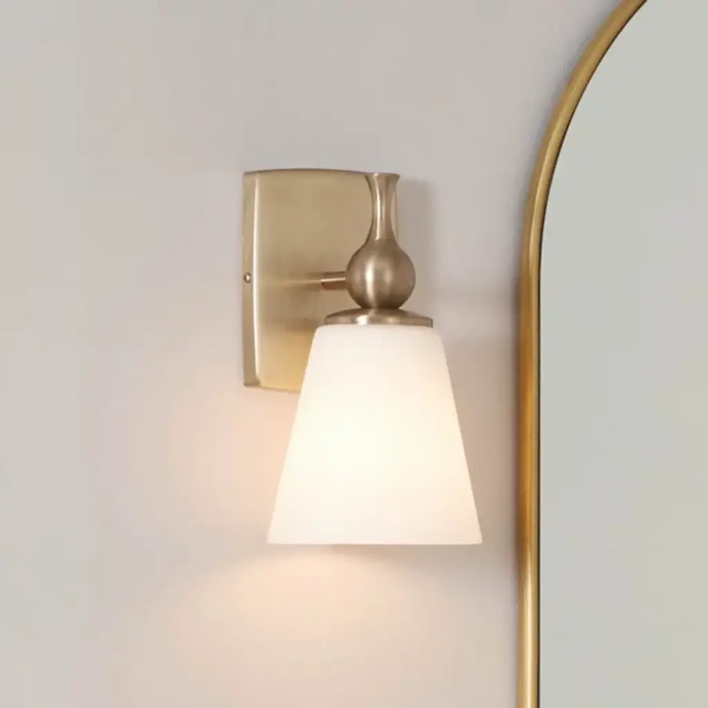 Give your lavatory a pleasant glow with the Cosabella Bath Wall Sconce by Kichler. A conically shaped shade of satin etched case opal glass is crowned by a lovely vase-like brass embellishment. This sconce’s shade is firmly secured at your wall courtesy of a steel backplate. This wall sconce is ideally placed beside your restroom mirror so that you can get ready each day under ample amounts of light. Easily adjust the sconce’s brightness level when you pair the Cosabella Bath Wall Sconce with a standard dimmer.