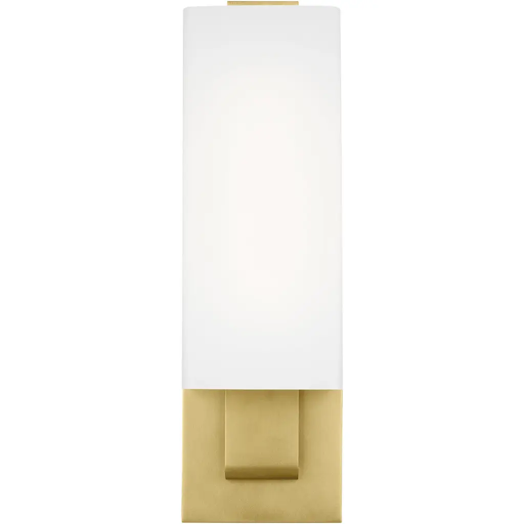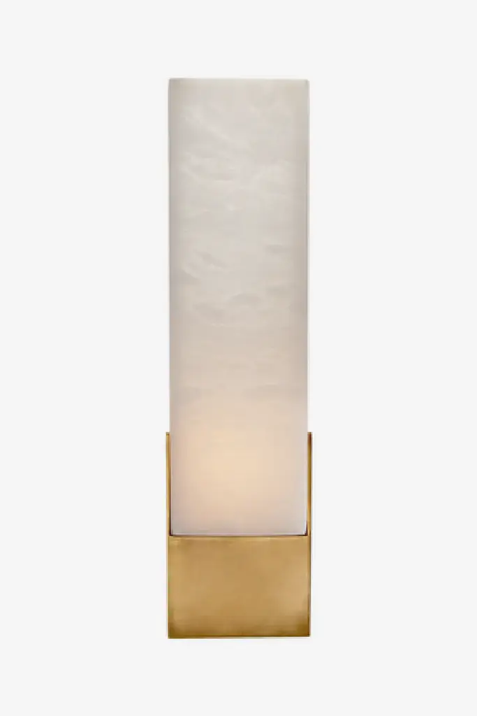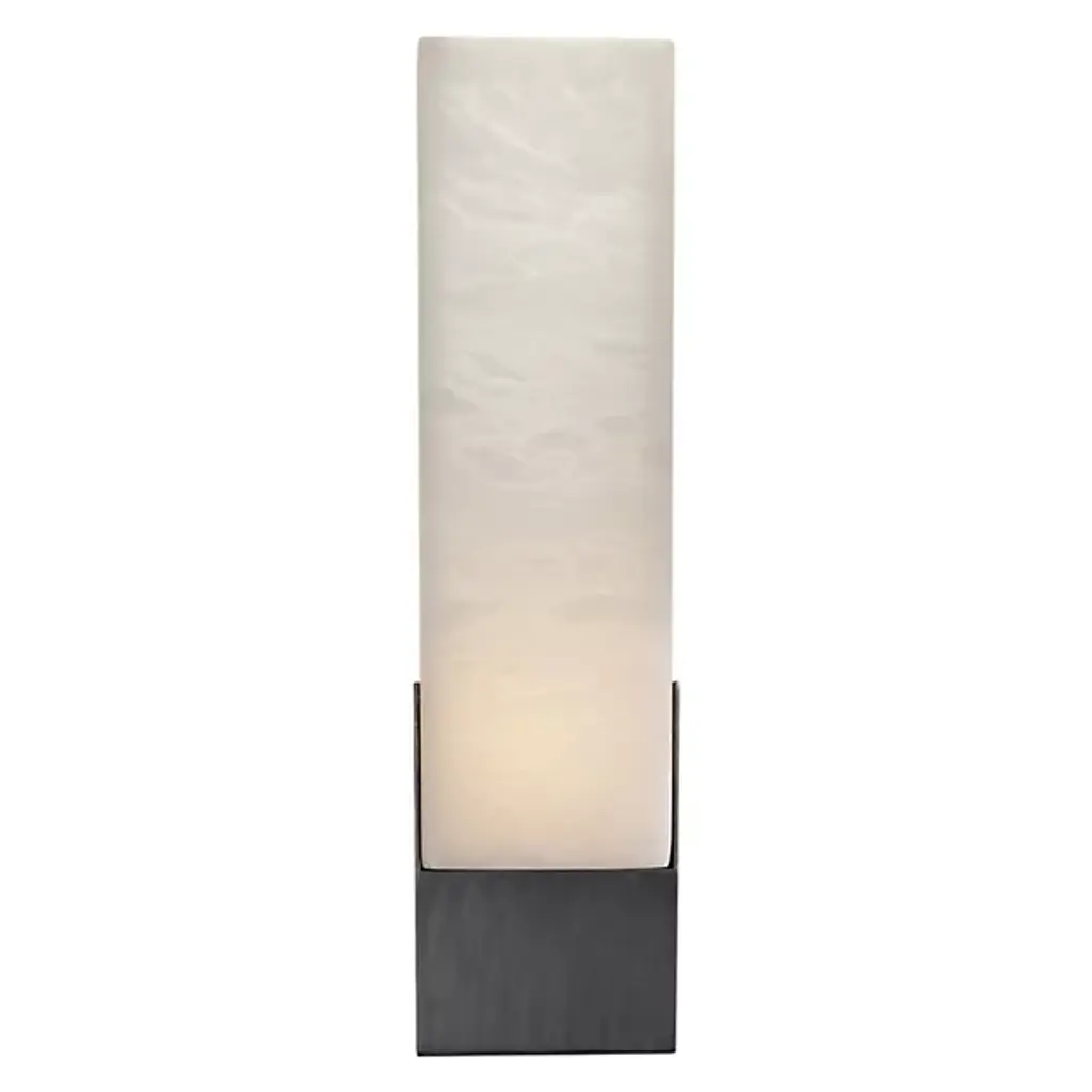 The Covet Tall Box Bath Sconce by Visual Comfort Signature, formerly known as Visual Comfort, creates a refined ambiance with a distinct rustic edge. Its design features a tall panel of alabaster stone which sits atop a robust metal holder. The semi-opaque stone acts as diffuser for a single LED light source, softening its radiance into a pleasing ambient glow.
