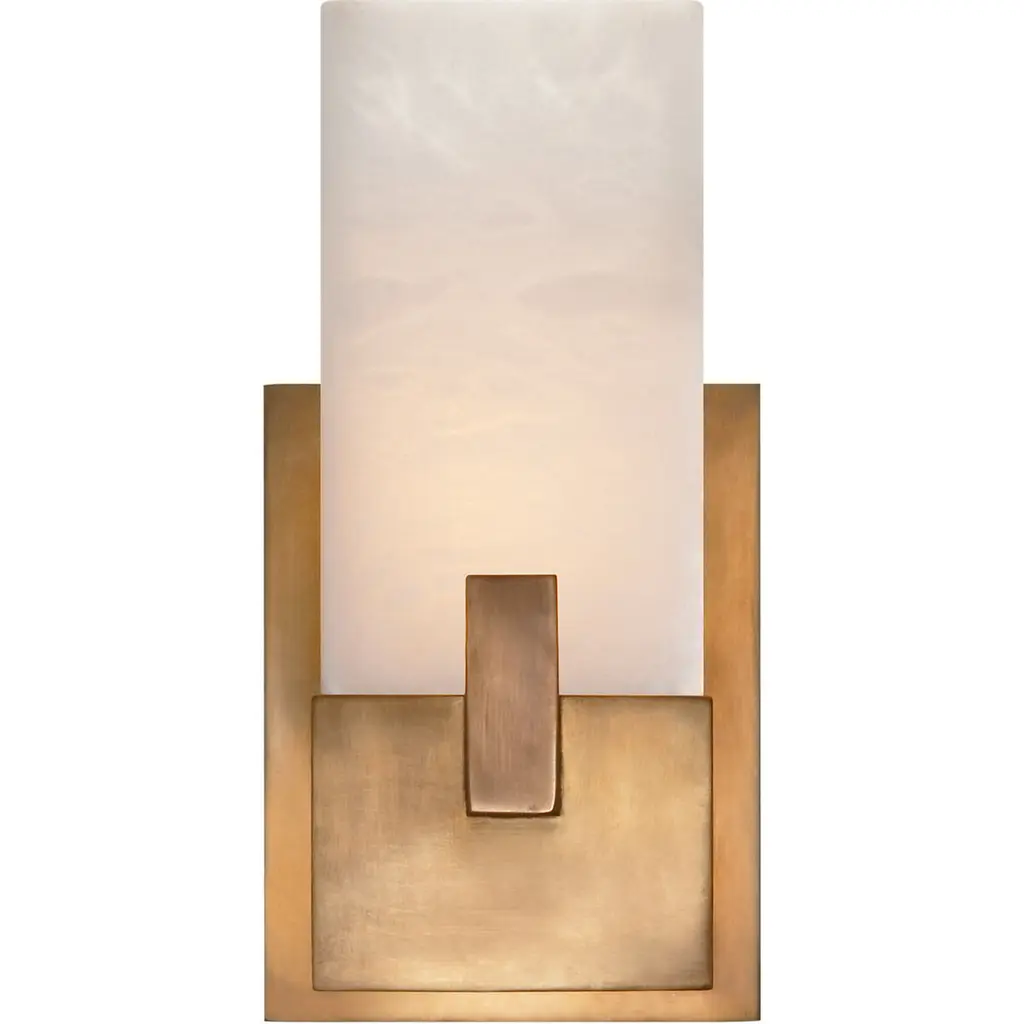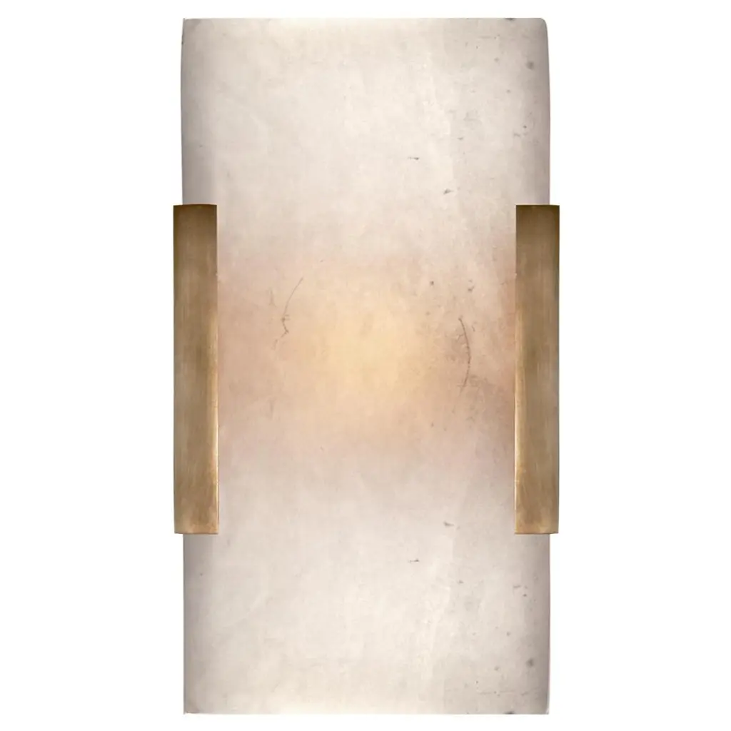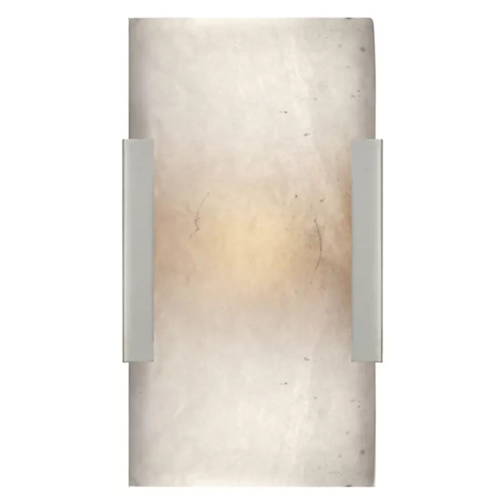 The Covet Wide Clip Bath Sconce by Visual Comfort Signature, formerly known as Visual Comfort, adds some grit to your bathroom décor, featuring a rectangular panel of Alabaster stone held in place by discreet metal clamps. The stone acts as diffuser for a single light source, softening its radiance into a pleasing ambient glow.