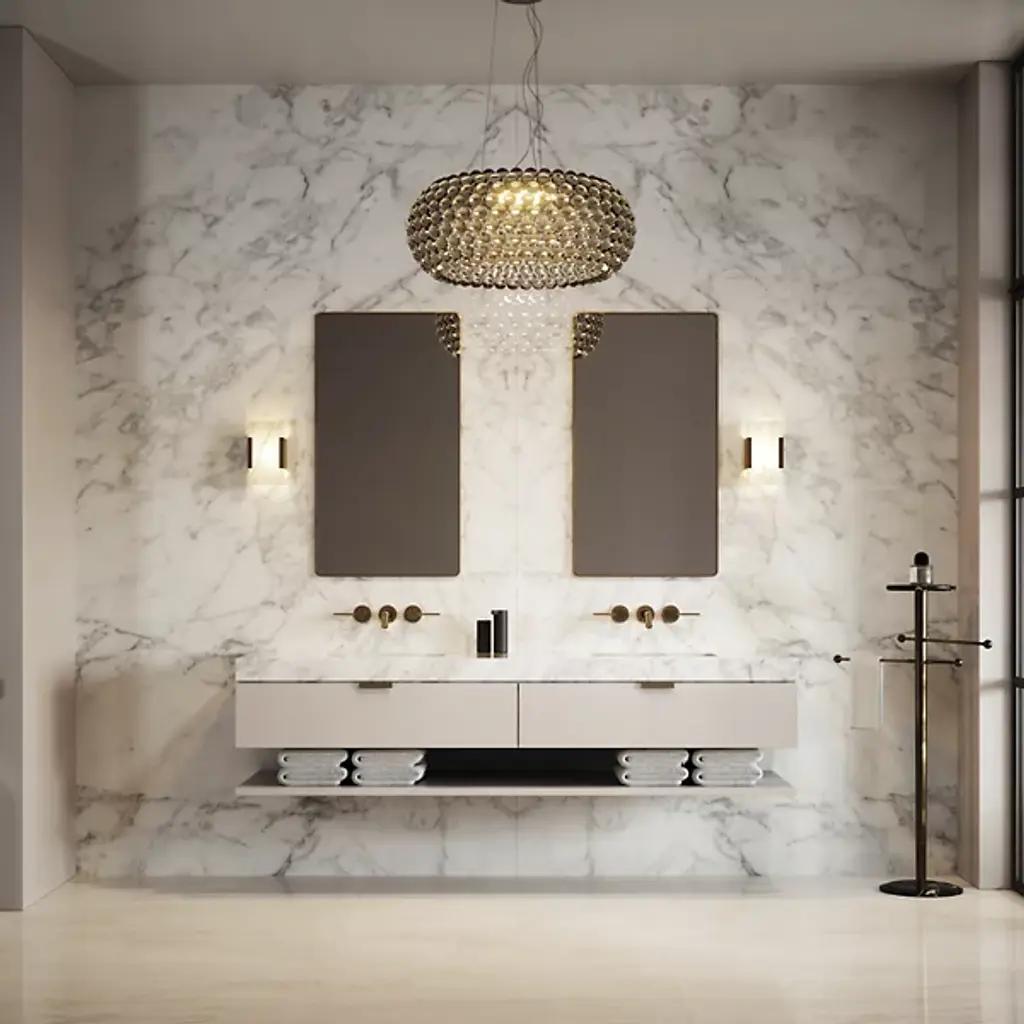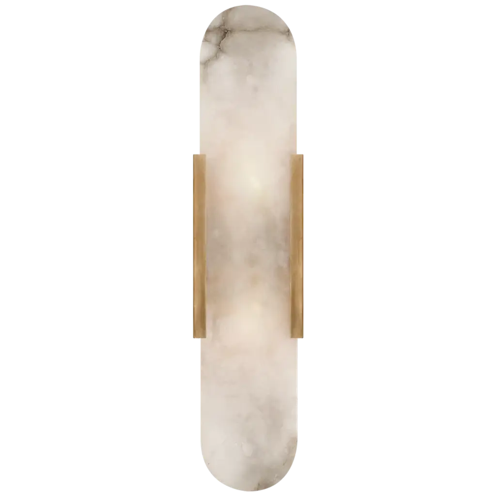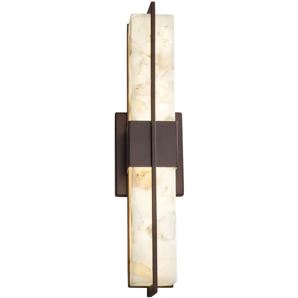 The Covet Wide Clip Bath Sconce by Visual Comfort Signature, formerly known as Visual Comfort, adds some grit to your bathroom décor, featuring a rectangular panel of Alabaster stone held in place by discreet metal clamps. The stone acts as diffuser for a single light source, softening its radiance into a pleasing ambient glow.