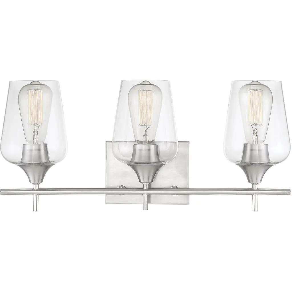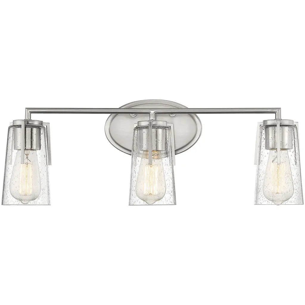 The strong lines and larger scale of the Chicago collection by Craftmade make a bold statement easily at home in any setting. The coordinating clear seeded glass vanities and mini pendant provide excellent lighting options for any bathroom large or small. 1 Year Mounting Direction: Up/Down Shade Included: Yes Material: Steel, Finish Color: Brushed Polished Nickel, Width: 22", Height: 10.25", Length: 22", Depth: 5.75", Height From Outlet Box: 2.63", Backplate Width: 10", Backplate Length: 5.25", Number Of Bulbs: 3, Wattage: 60 Watts, Dimmable: No, Moisture Rating: Damp Rated