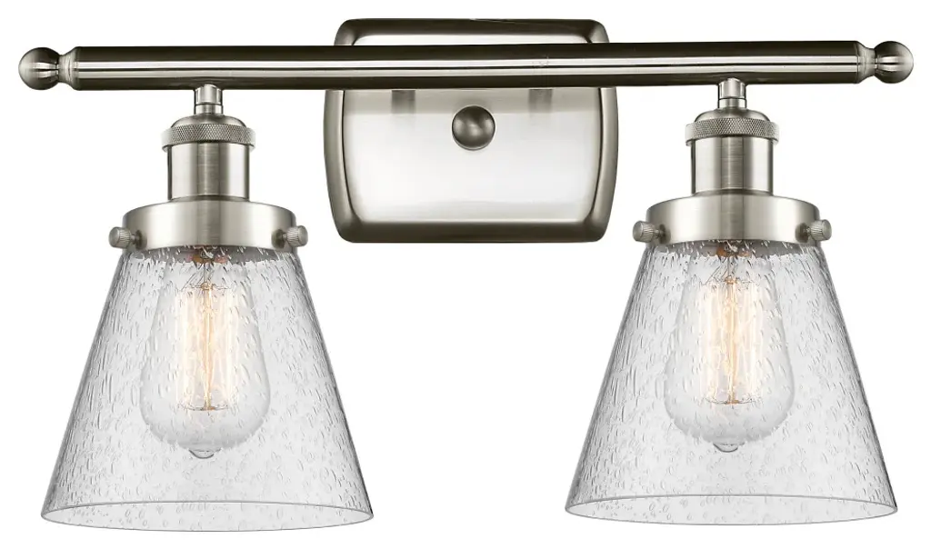 Clear Seeded Glass Shades (included) Requires 2 Medium base, 60 watt bulbs (not included) Sturdy Steel Construction Suitable for Damp Locations 1 Year Warranty. 1 Year Mounting Direction: Wall mount Shade Included: Yes Dimmable: Yes Material: Steel, Finish Color: Brushed Polished Nickel, Width: 15.5", Height: 9.5", Length: 15.5", Depth: 6.5", Backplate Width: 5.5", Backplate Length: 5.5", Number Of Bulbs: 2, Wattage: 60 Watts, Dimmable: No, Moisture Rating: Damp Rated