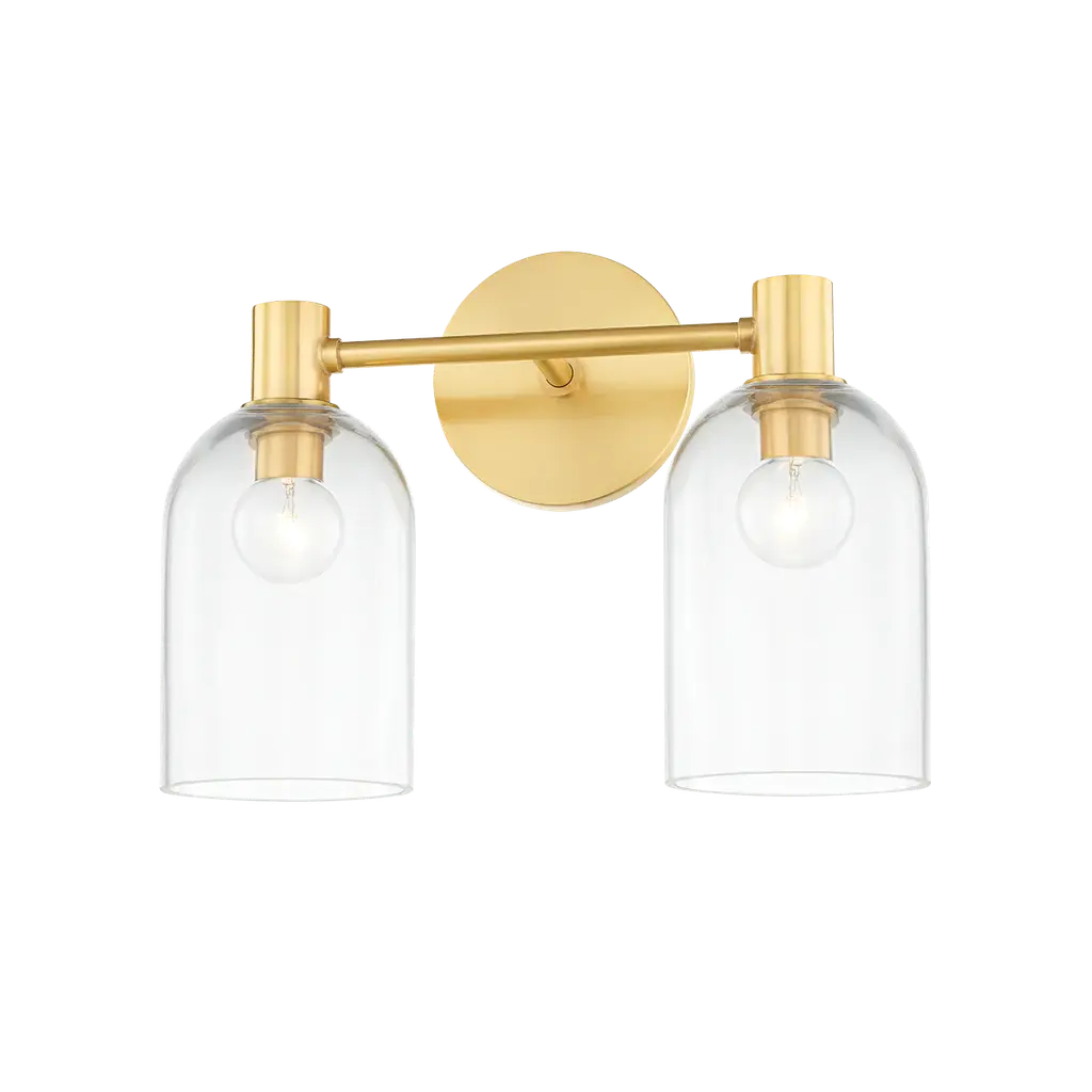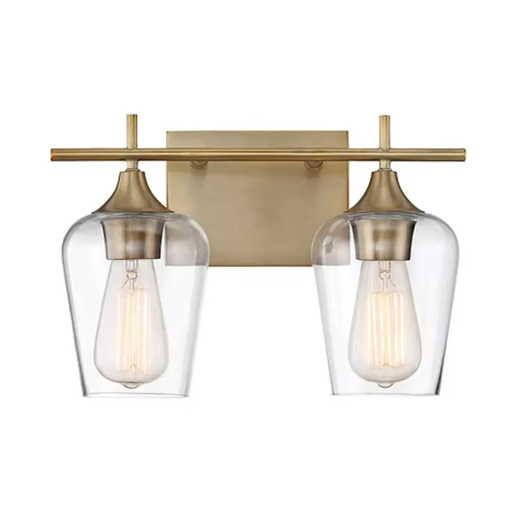 The Emilio Vanity Collection by Craftmade offers bright, clean lighting with transitional appeal and clear glass. Emilio is offered in five sizes and three finishes - brushed polished nickel, flat black and satin brass. Back Plate Height: 5.00 Back Plate Width: 5.00 Shade Included: Yes Material: Iron, Finish Color: Satin Brass, Width: 15.13", Height: 8", Length: 6.63", Depth: 6.6142", Backplate Width: 5", Backplate Length: 5", Lamping Type: Incandescent, Number Of Bulbs: 2, Wattage: 60 Watts, Dimmable: No, Moisture Rating: Damp Rated