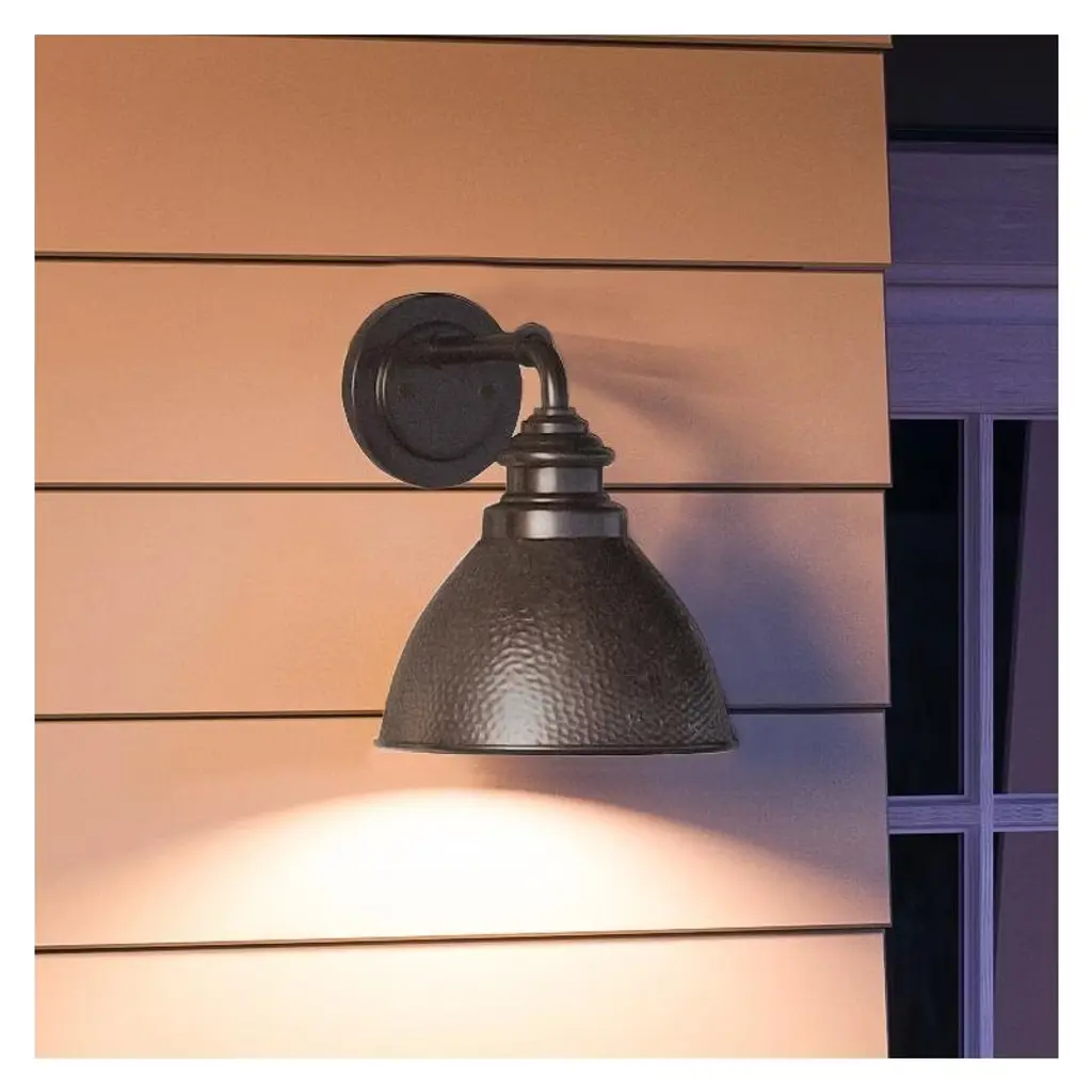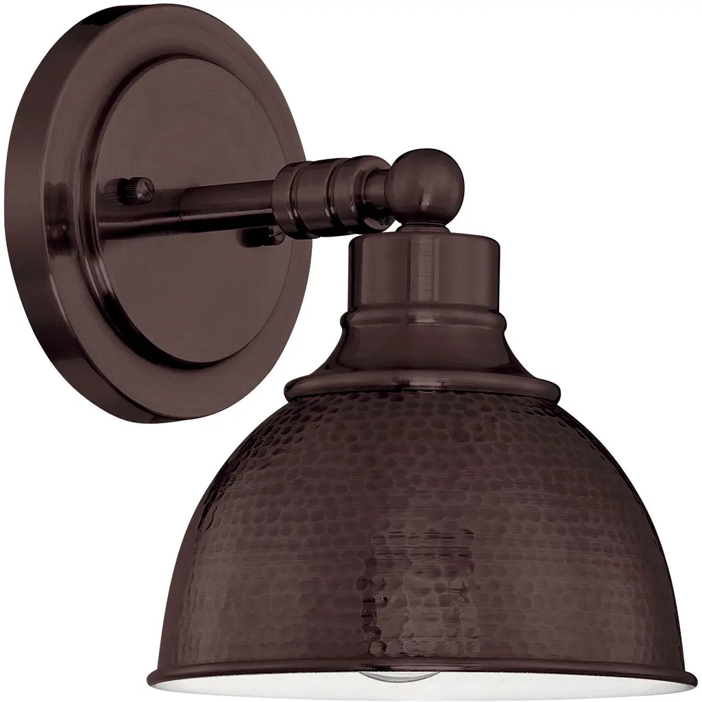 Boasting a stellar sense of industrial chic style, the Timarron is a contemporary showstopper. From chandeliers to pendants, sconces, and beyond, find a fixture for any room in your home. With hammered metal shades and visually strong lines, the design is light years away from the rest. Shade Included. Material: Steel, Finish Color: Aged Bronze Brushed, Width: 7", Height: 9.88", Length: 8.5", Depth: 9", Backplate Width: 5.7", Backplate Length: 5.7", Number Of Bulbs: 1, Wattage: 100 Watts, Dimmable: No, Moisture Rating: Dry Rated