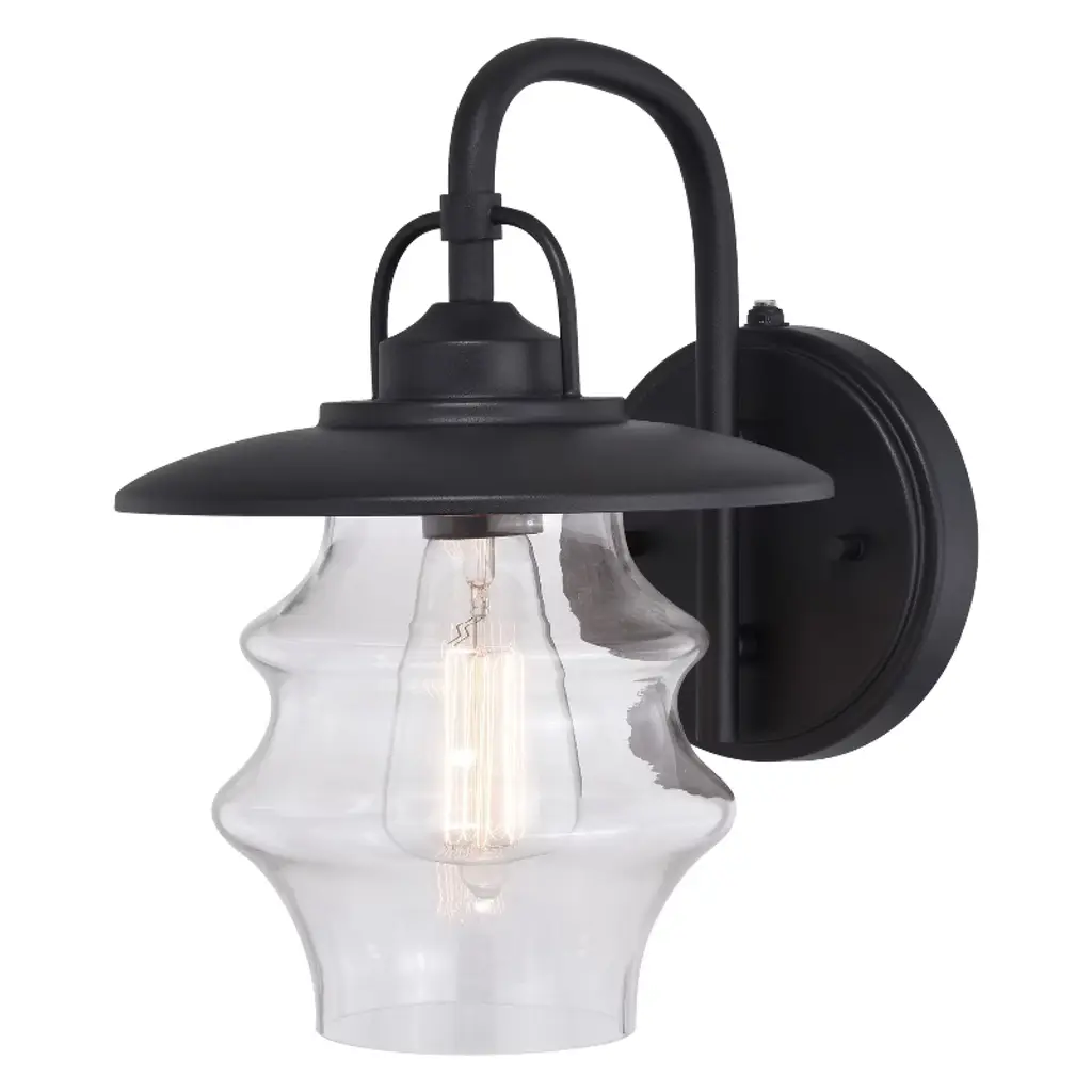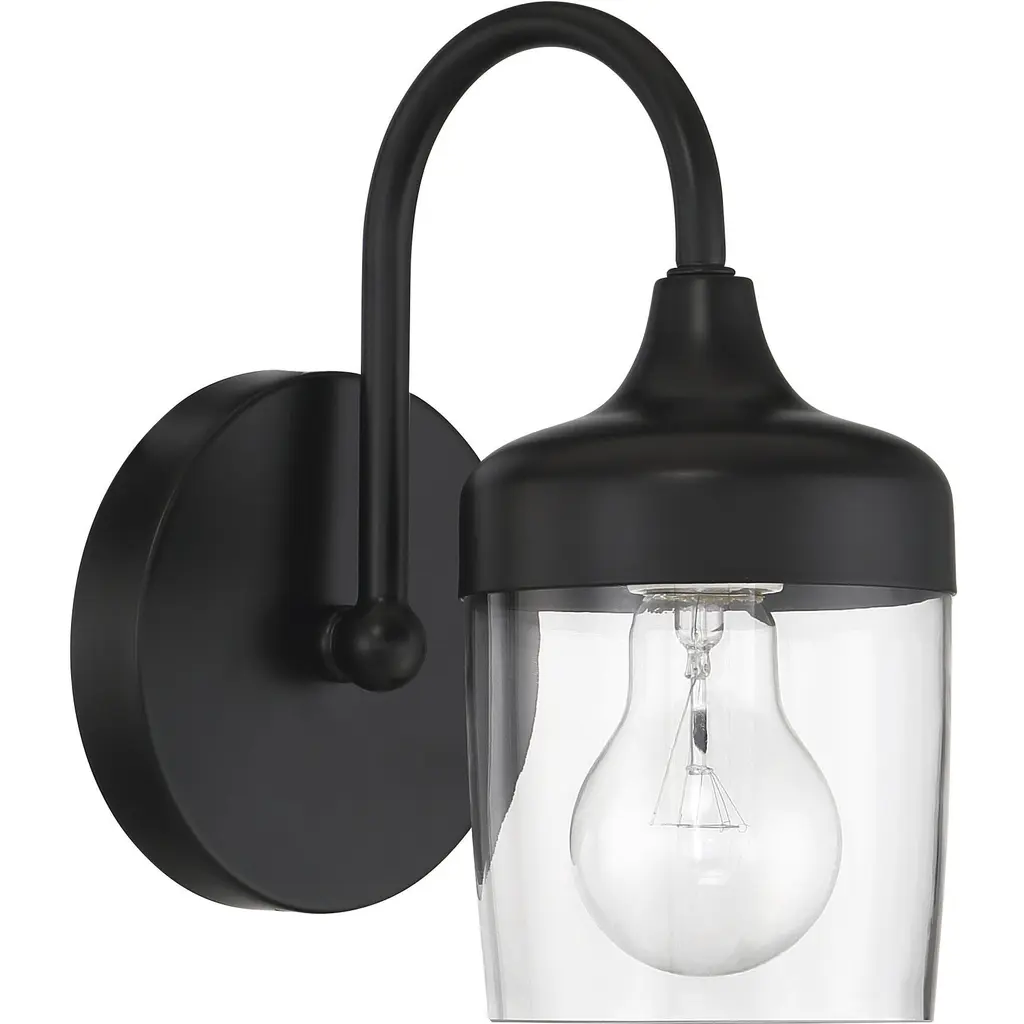 The Wrenn lighting collection from Craftmade delivers minimalist style pairing beautifully sculpted lines with clear glass to create the perfect blend of understated elegance able to blend beautifully with any style. Wall Mount Damp Rated Requires 1 Medium Base 60 Watt Bulb (Not Included) 1 Year Limited Warranty Material: Glass, Finish Color: Flat Black, Width: 5", Height: 9.13", Length: 5", Depth: 7.5", Backplate Width: 5", Backplate Length: 5", Lamping Type: Incandescent, Number Of Bulbs: 1, Wattage: 60 Watts, Moisture Rating: Damp Rated