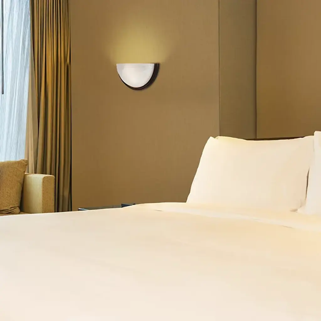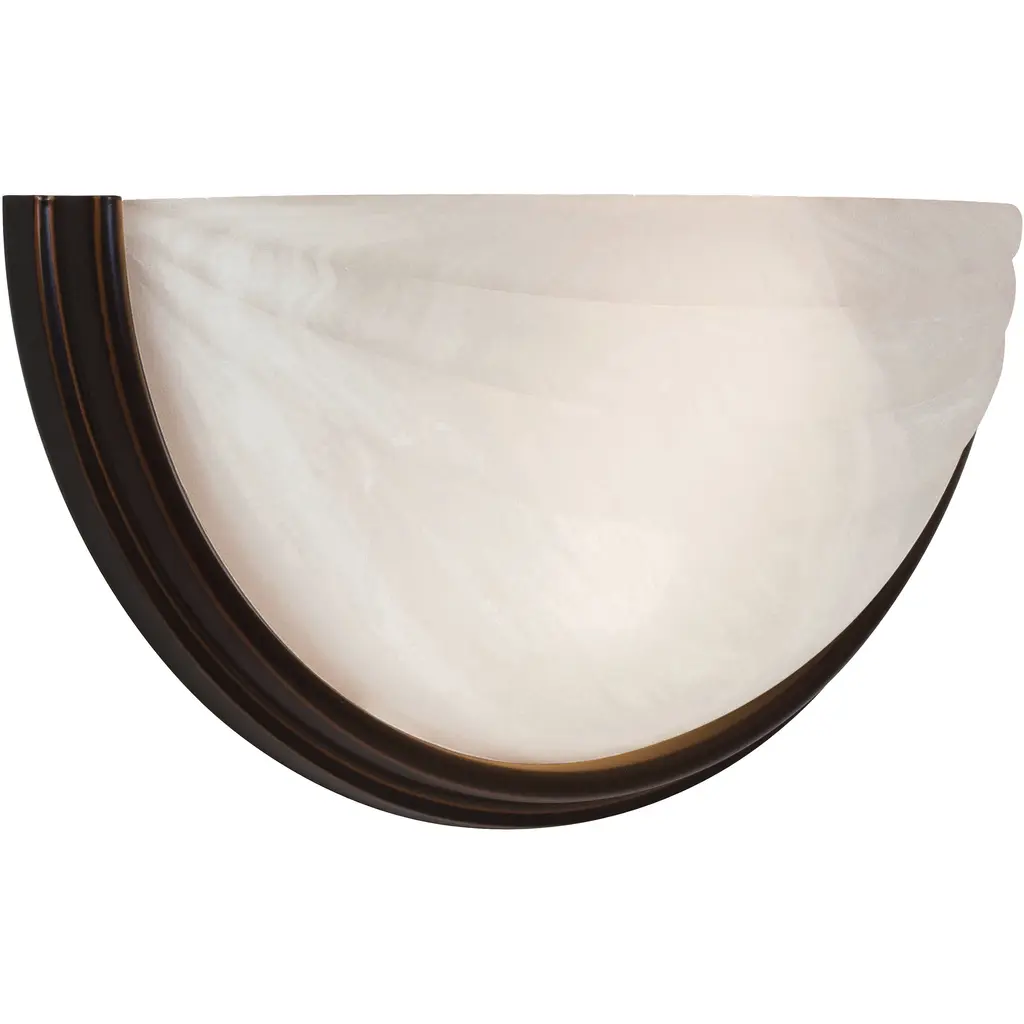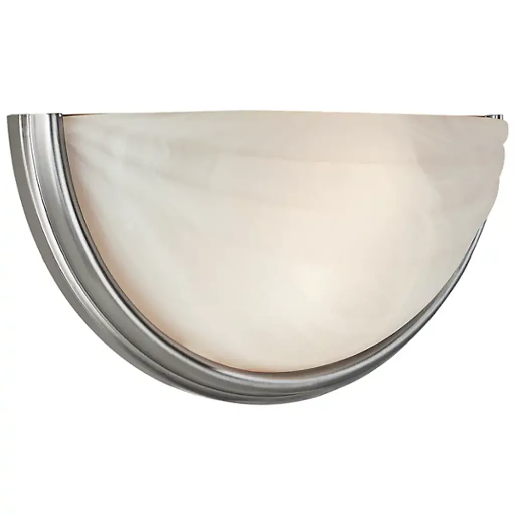 The otherwise fluid detailing within the formal outline of the Access Lighting Crest Wall Sconce makes it ideal for illuminating soft contemporary spaces. It features an Alabaster glass shade with a deeply ridged, rippled texture, which gives the effect of the glass fluidly draping from the half-circular metal base. Available in two finishes. ADA compliant.