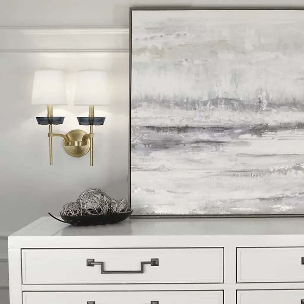 The Cristallo 2-Light Wall Sconce Robert Abbey impresses upon the viewer the distinguished character of the home. A compact backplate makes the sconce a great candidate over a column, in between picture frames, or across a hallway. The backplate sends out a pair of curved arms that hold elegant long-tailed stems. Crystal accents top the stems like the bobeche dish accents of the familiar candleholder. Keeping it classic, fabric drum shades pair with bright bulbs to create an ambient aura that shimmers across the crystal.