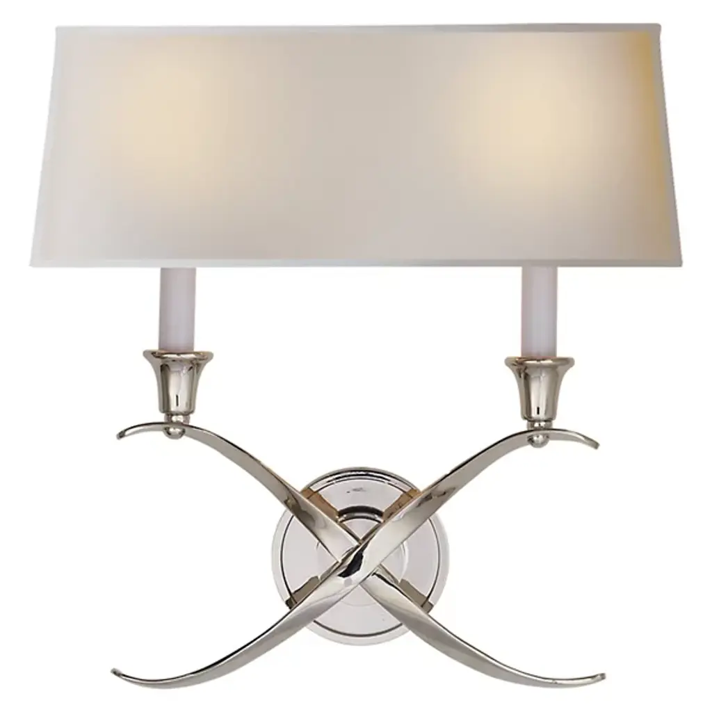 Visual Comfort Signature, formerly known as Visual Comfort,’s Cross Bouillotte Wide Wall Sconce offers a suave and sophisticated wall light option that adds a huge statement to any type of interior. A rectangular Natural Paper shade gently diffuses a warm ambient glow, easily brightening its surroundings with 2 candelabra bulbs. Beneath the candle columns is a cross-hatched “X” that adds a bit of depth to an overall trendy design piece.