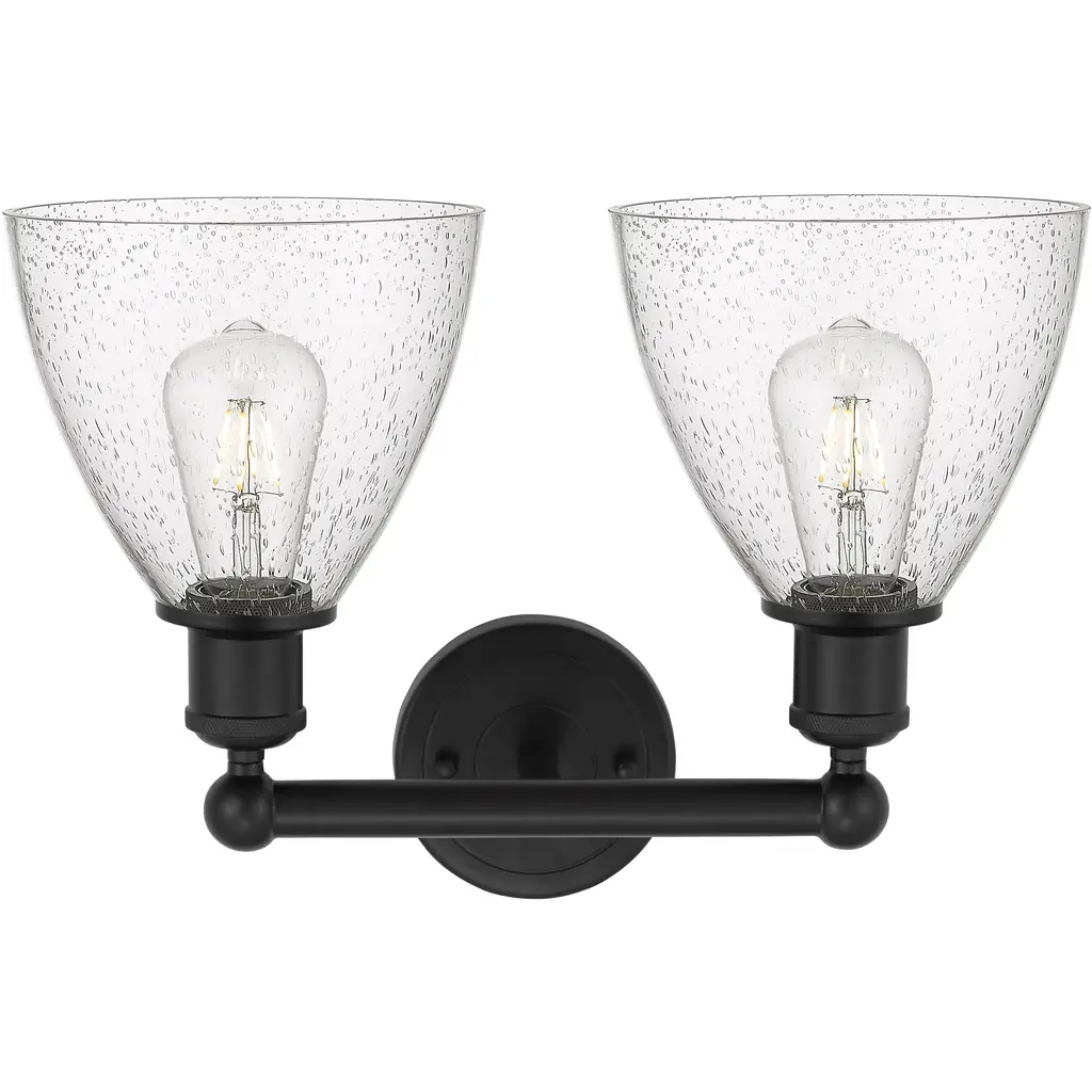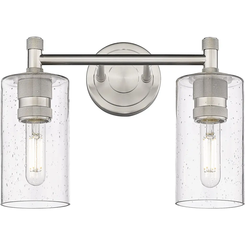 INNOVATIONS 434-2W-BK-G434-7SDY Crown Point 2 13.875 inch Bath Vanity Light Matte Black. Style: Industrial, Modern Contempo, Restoration-Vintage. Collection Name: Downtown Urban. Metal Finish(Body): Matte Black. Material: Steel, Cast Brass, Glass. Dimension(in): 10.5(H) x 13.875(W) x 6.5(Ext). Bulb: (2)6W LED(Included). Voltage: 120. Dimmable: Yes. Color Temperature (Kelvin): 2700. Color Rendering Index (CRI): 90. Lumens: 750. Life Expectancy (Hours): 15000. Glass Shade Description: Seedy Crown Point. Glass Type: Seedy. Shade Shape: Cylinder. Glass or Metal Shade Color: Seedy. Shade Material: Glass. Shade Dimension(in): 3.875(W) x 7.125(H). ADA Compliant: No. California Proposition 65 Warning Required: Yes. UL/ETL Certification Type: Damp Location.