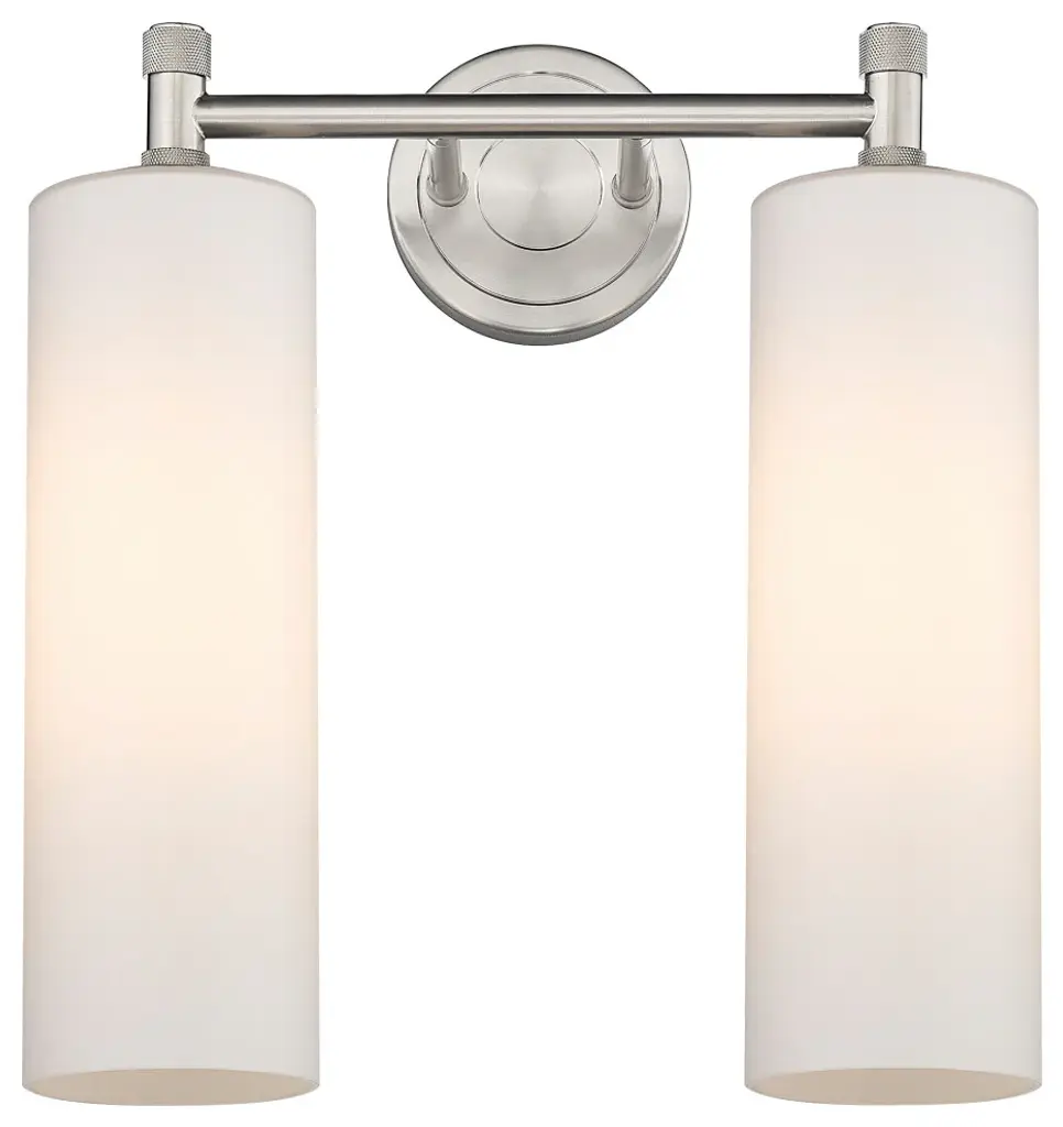 INNOVATIONS 434-2W-SN-G434-7WH Crown Point 2 13.875 inch Bath Vanity Light Satin Nickel. Style: Industrial, Modern Contempo, Restoration-Vintage. Collection Name: Downtown Urban. Metal Finish(Body): Satin Nickel. Material: Steel, Cast Brass, Glass. Dimension(in): 10.5(H) x 13.875(W) x 6.5(Ext). Bulb: (2)6W LED(Included). Voltage: 120. Dimmable: Yes. Color Temperature (Kelvin): 2700. Color Rendering Index (CRI): 90. Lumens: 750. Life Expectancy (Hours): 15000. Glass Shade Description: White Crown Point. Glass Type: Frosted. Shade Shape: Cylinder. Glass or Metal Shade Color: White. Shade Material: Glass. Shade Dimension(in): 3.875(W) x 7.125(H). ADA Compliant: No. California Proposition 65 Warning Required: Yes. UL/ETL Certification Type: Damp Location.
