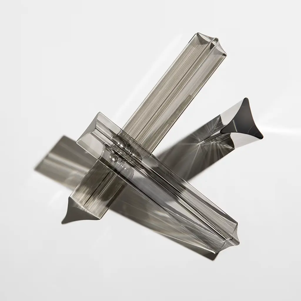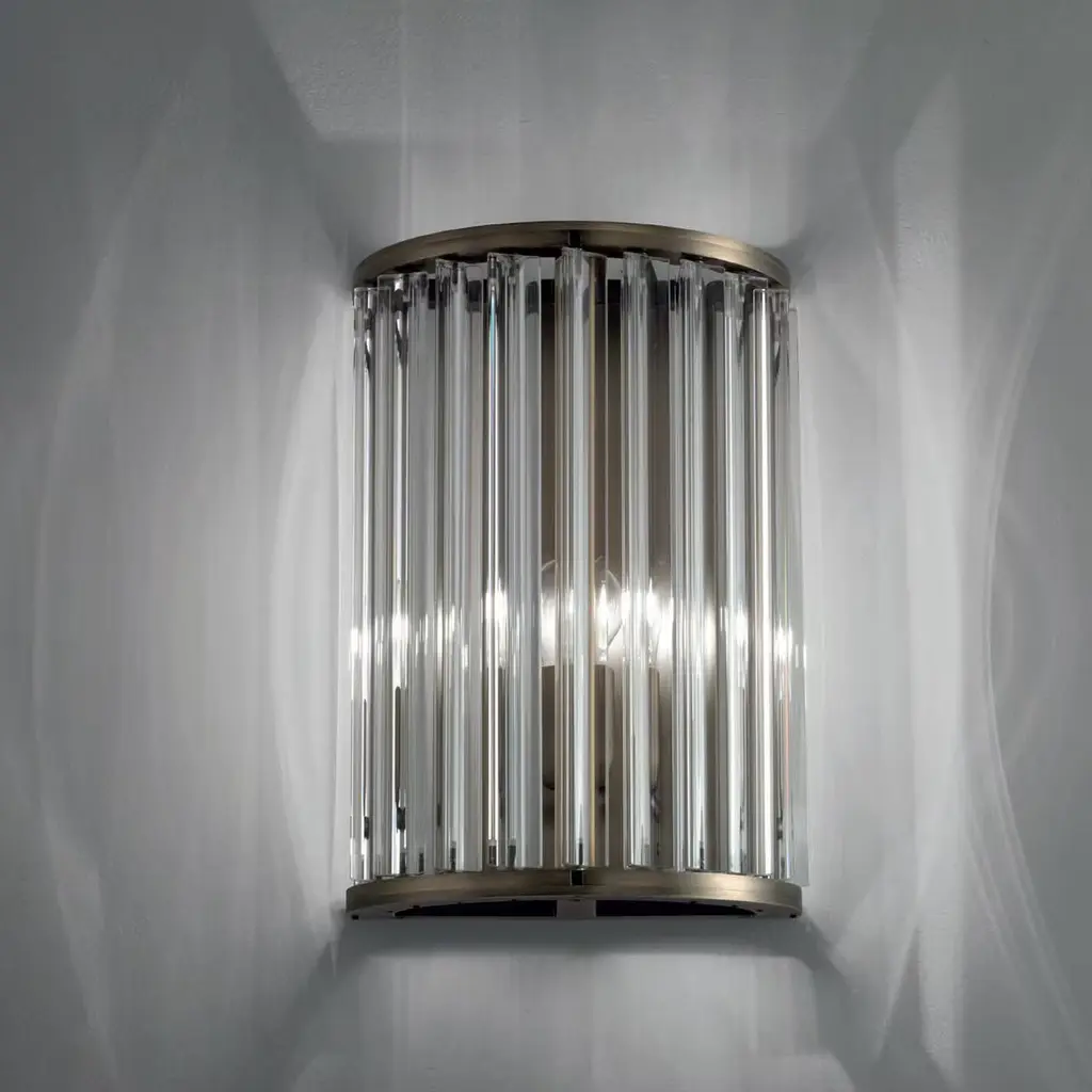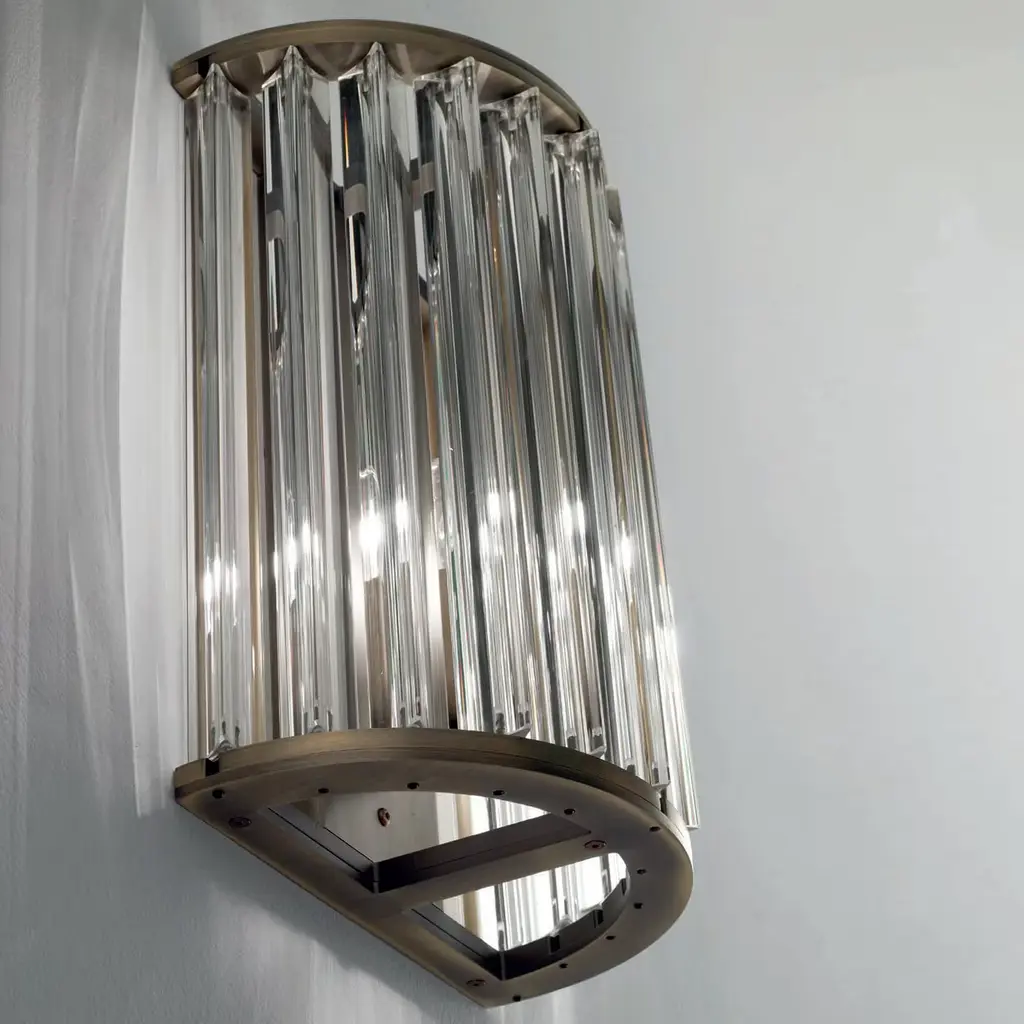 This exquisite sconce exudes art deco elegance and old-fashion sophistication, thanks to its triangle-section rods of crystal placed in a semi-circle and brilliantly diffusing the light for a timeless effect. Particularly suitable for a classic décor, this sconce will also fit in a more modern setting. It is available in matte black nickel or brass structure with crystal, amber or smoke trihedrons. Bulbs excluded.